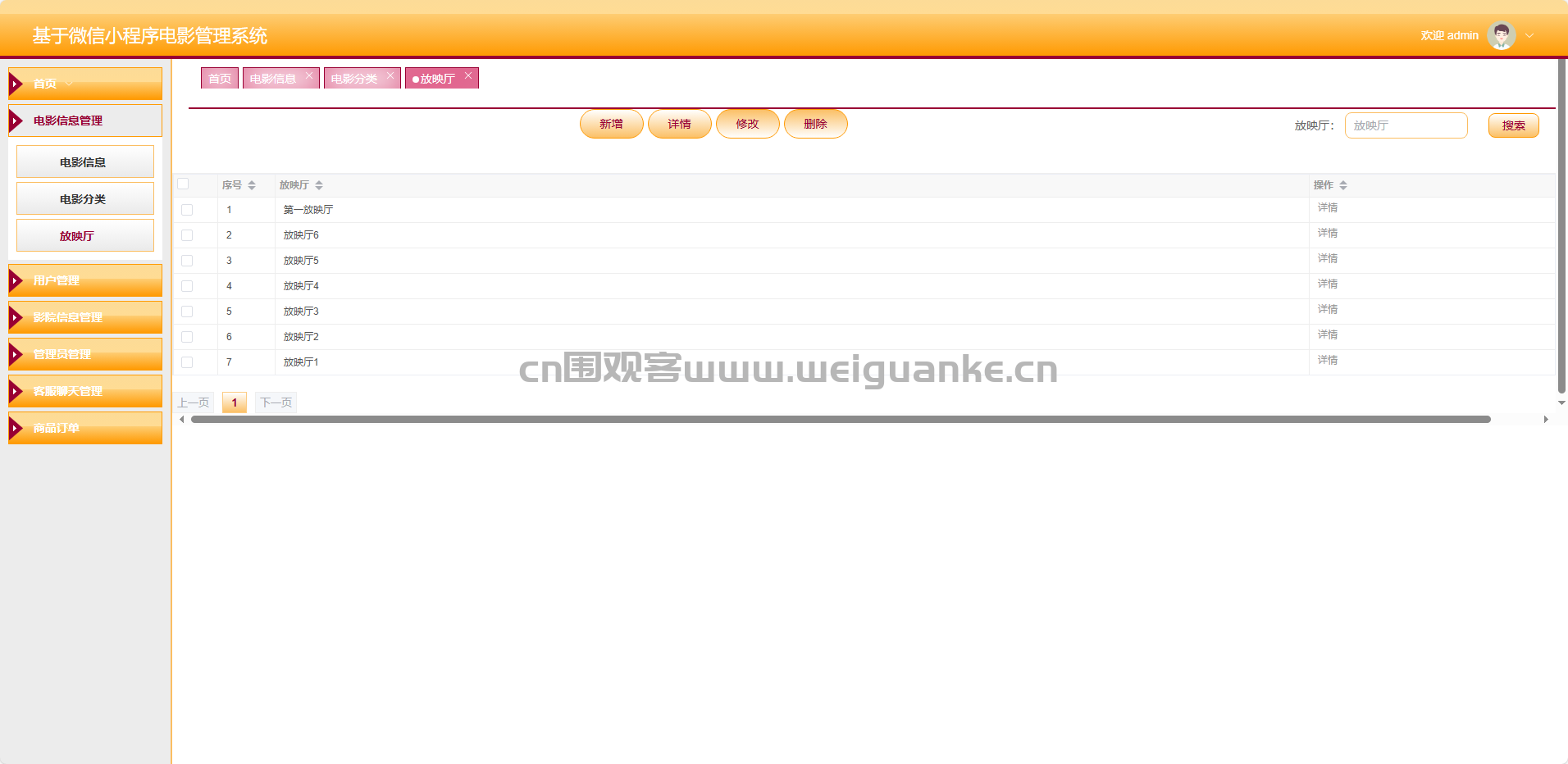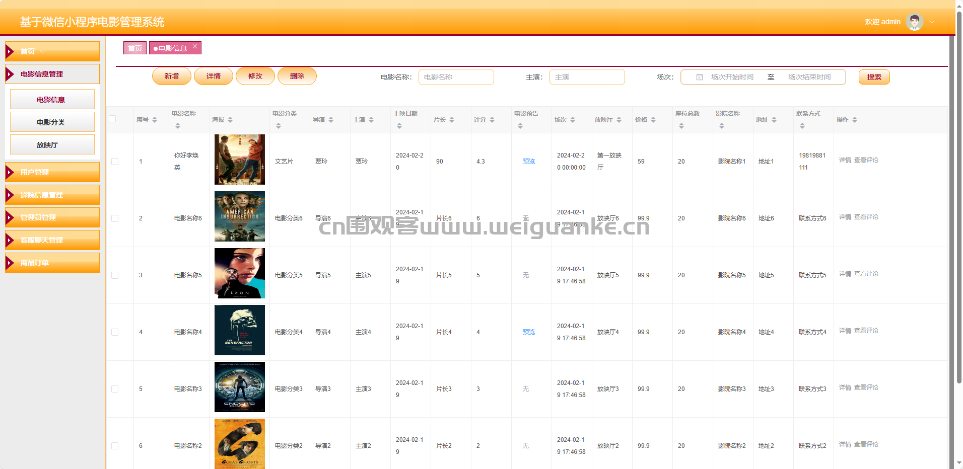电影信息管理:维护影片基础数据、分类目录与放映厅配置。