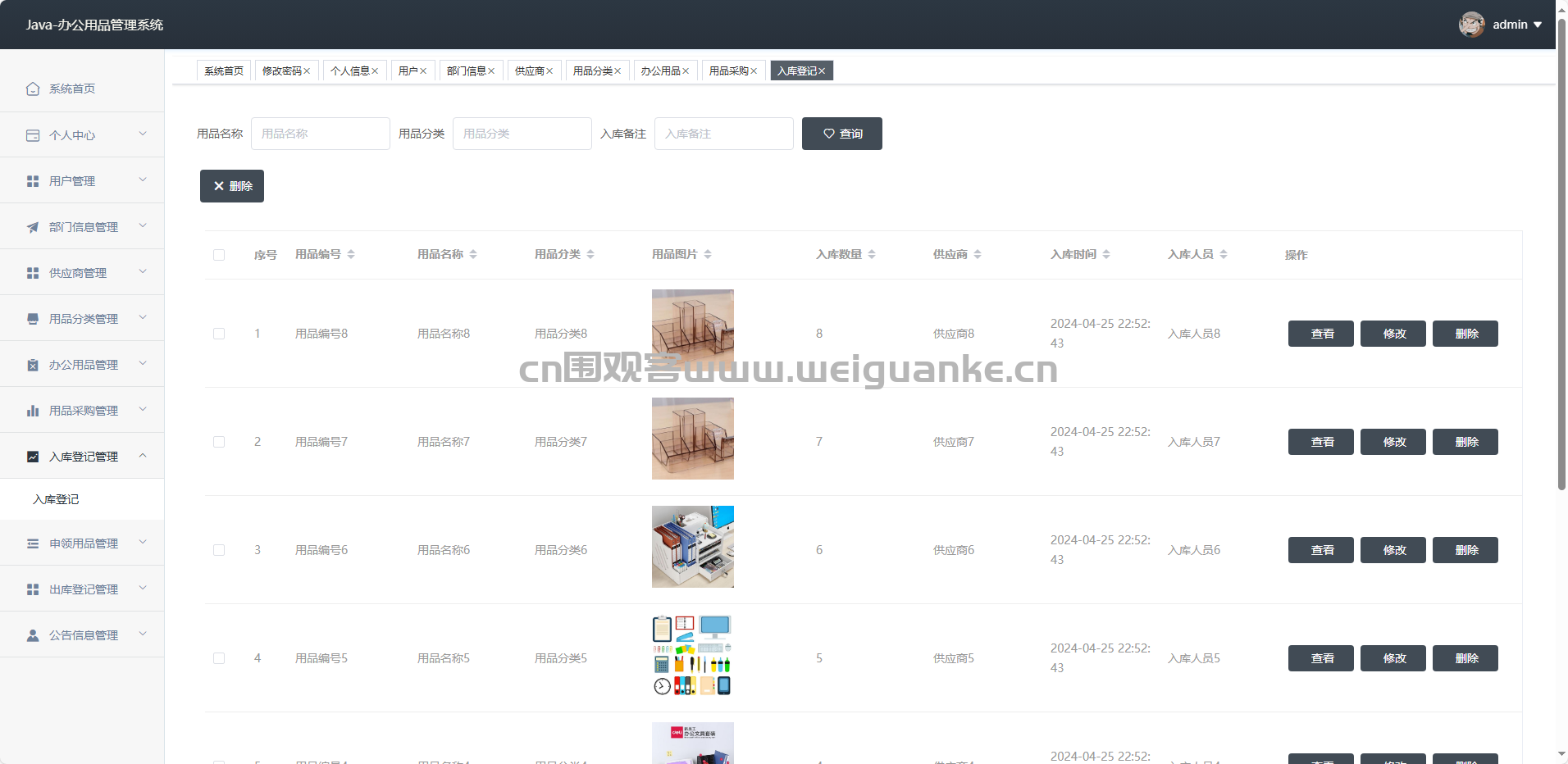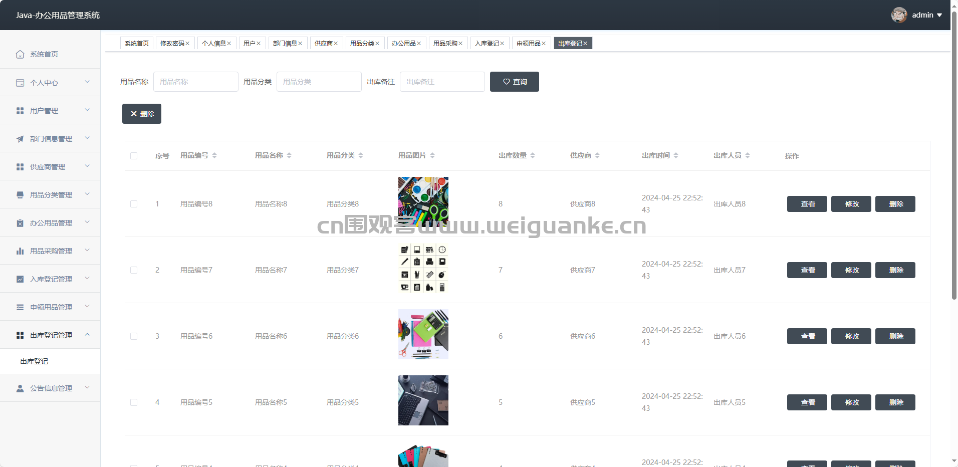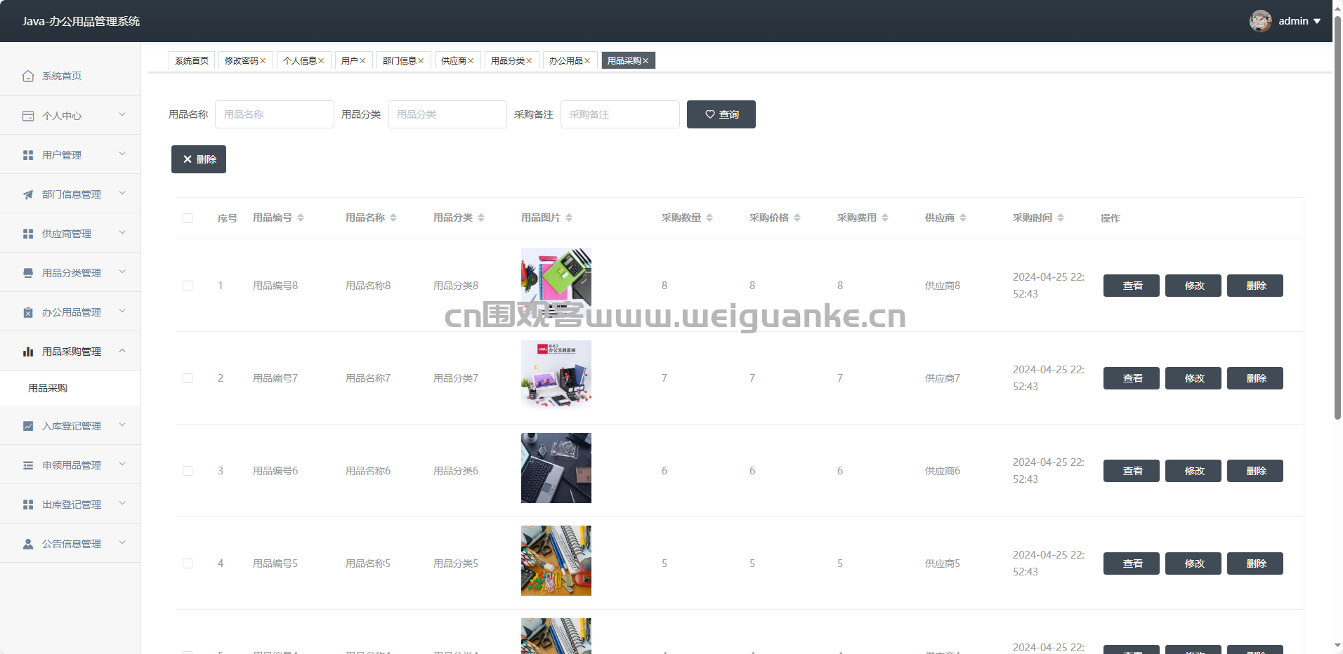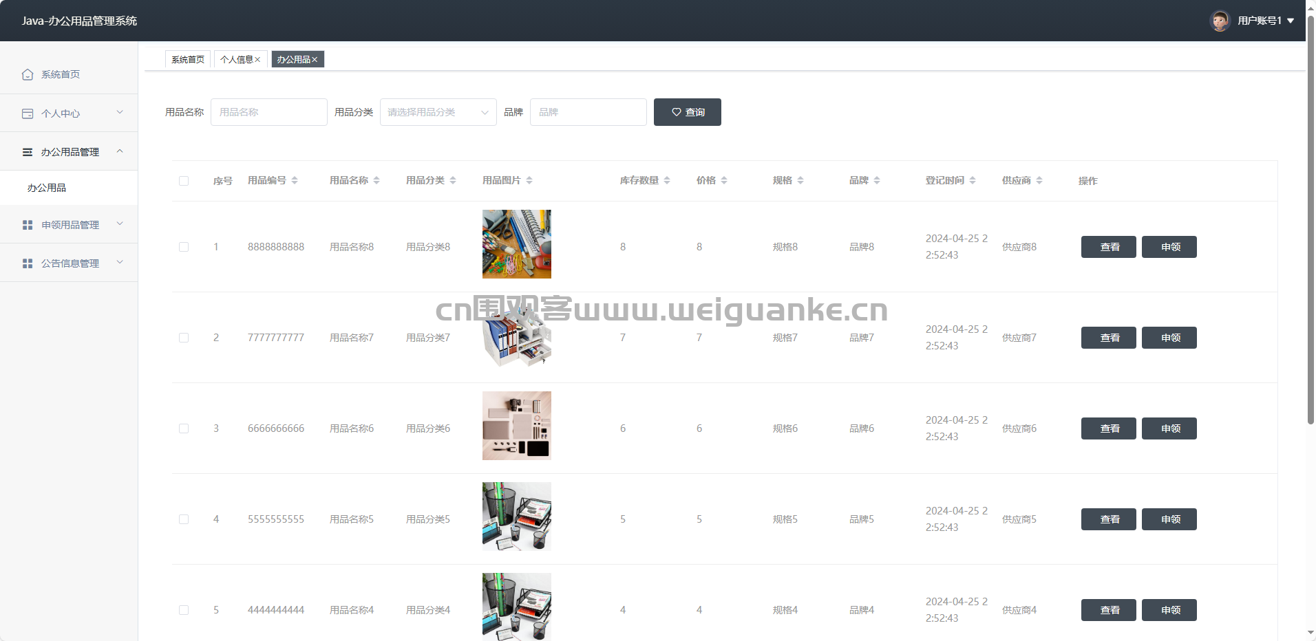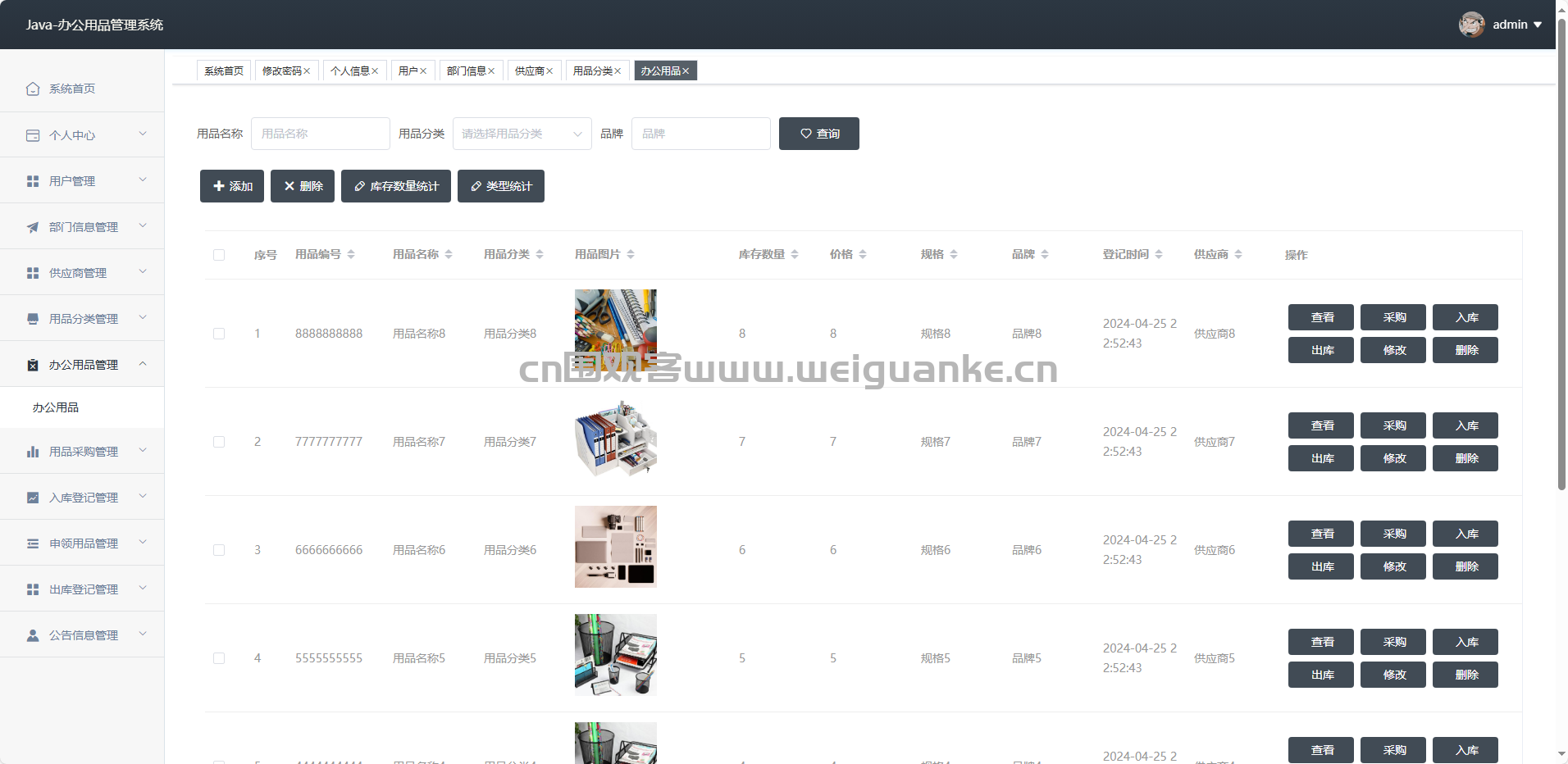 办公用品管理:列表+搜索,实时库存、详情查看。