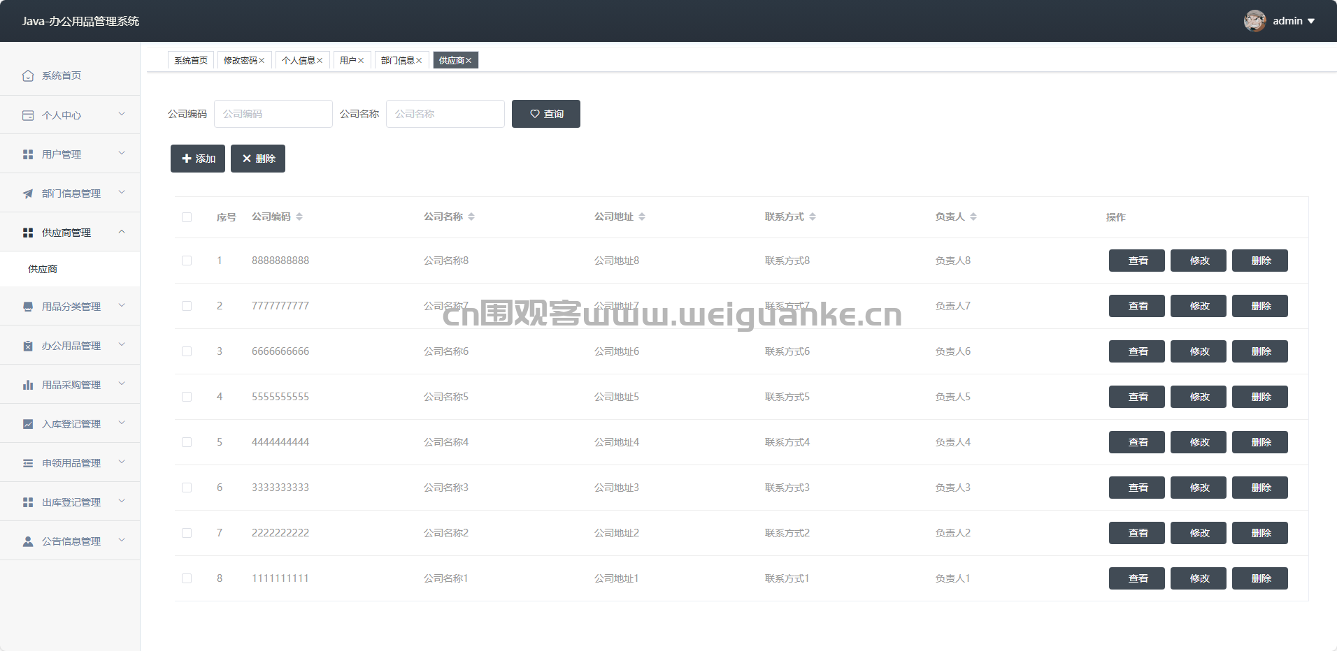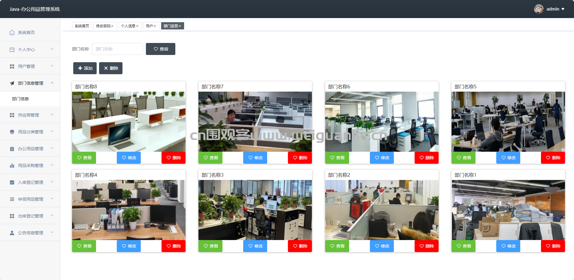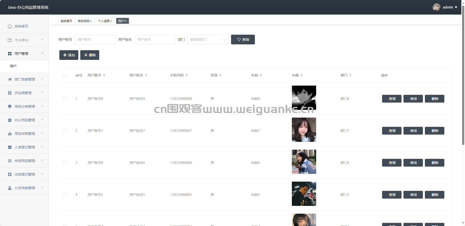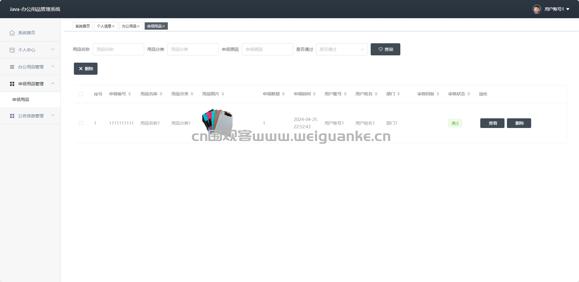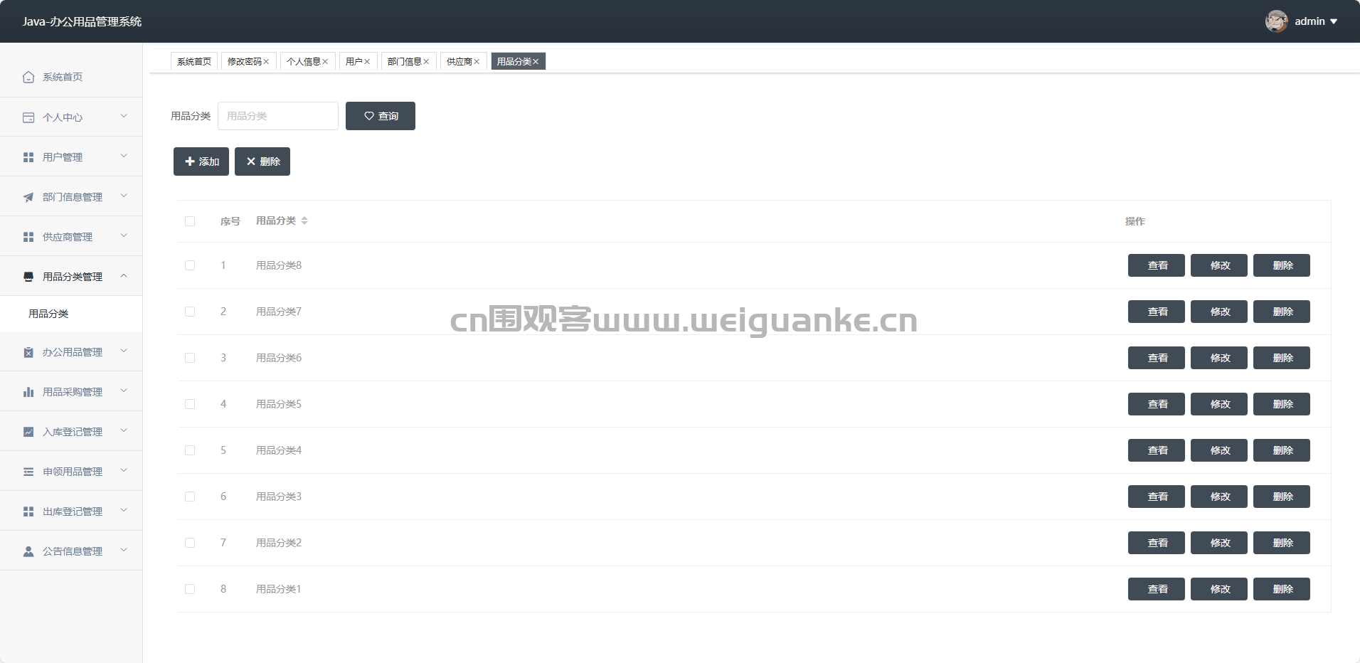 办公用品管理:列表+搜索,实时库存、详情查看。