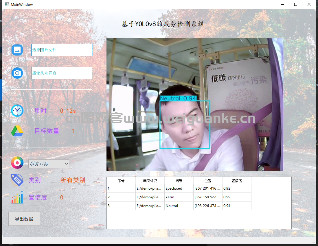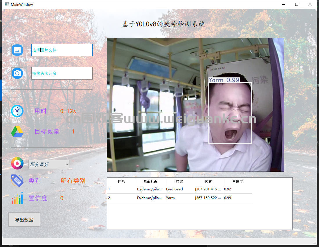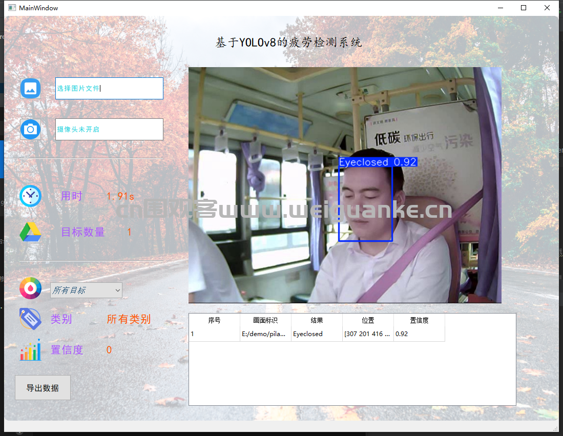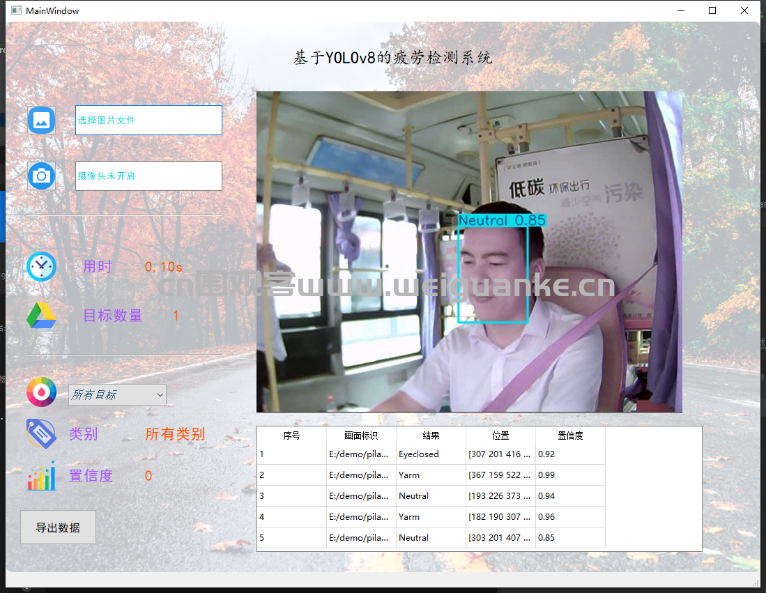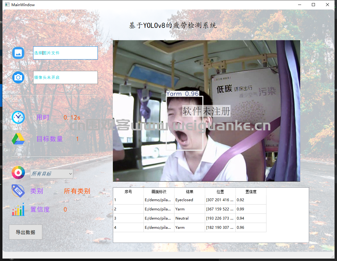zhe, zhuo python 2天前 基于 PyQt5+ yolov8 疲劳检测系统 项目描述 基于 PyQt5+ YOLOv8的疲劳检测系统。 项目功能 文件导入:导入图片可导入多张图片 视频导入导入后显示结果,摄像头识别识别显示结果 检测结果: 图片识别:导入图片识别疲劳状态 摄像头识别:摄像头识别疲劳状态 运行环境 开发环境 pycharm 运行环境 py3.8 项目技术 PyQt5 启动:main.py 启动项目 以上系统源码经过技术整理与调试,确保能正常运行