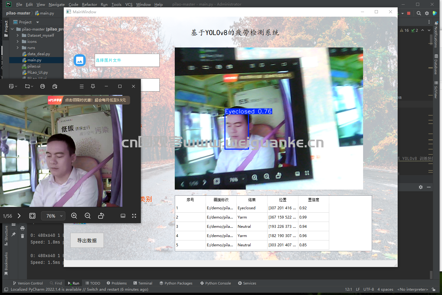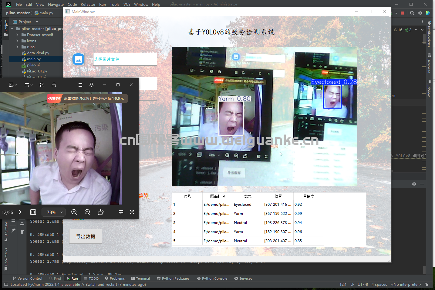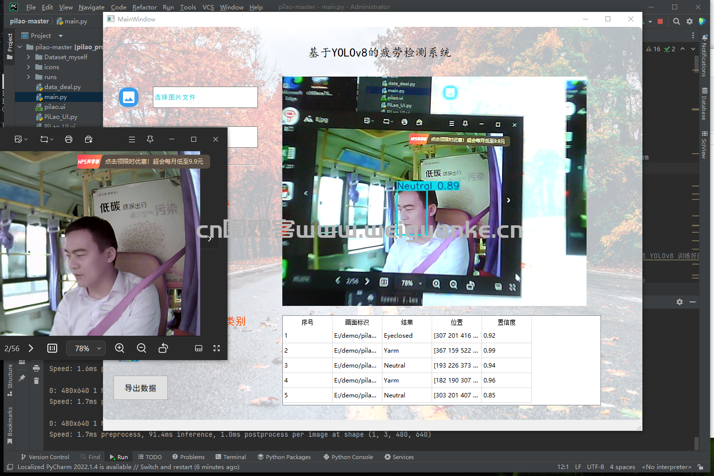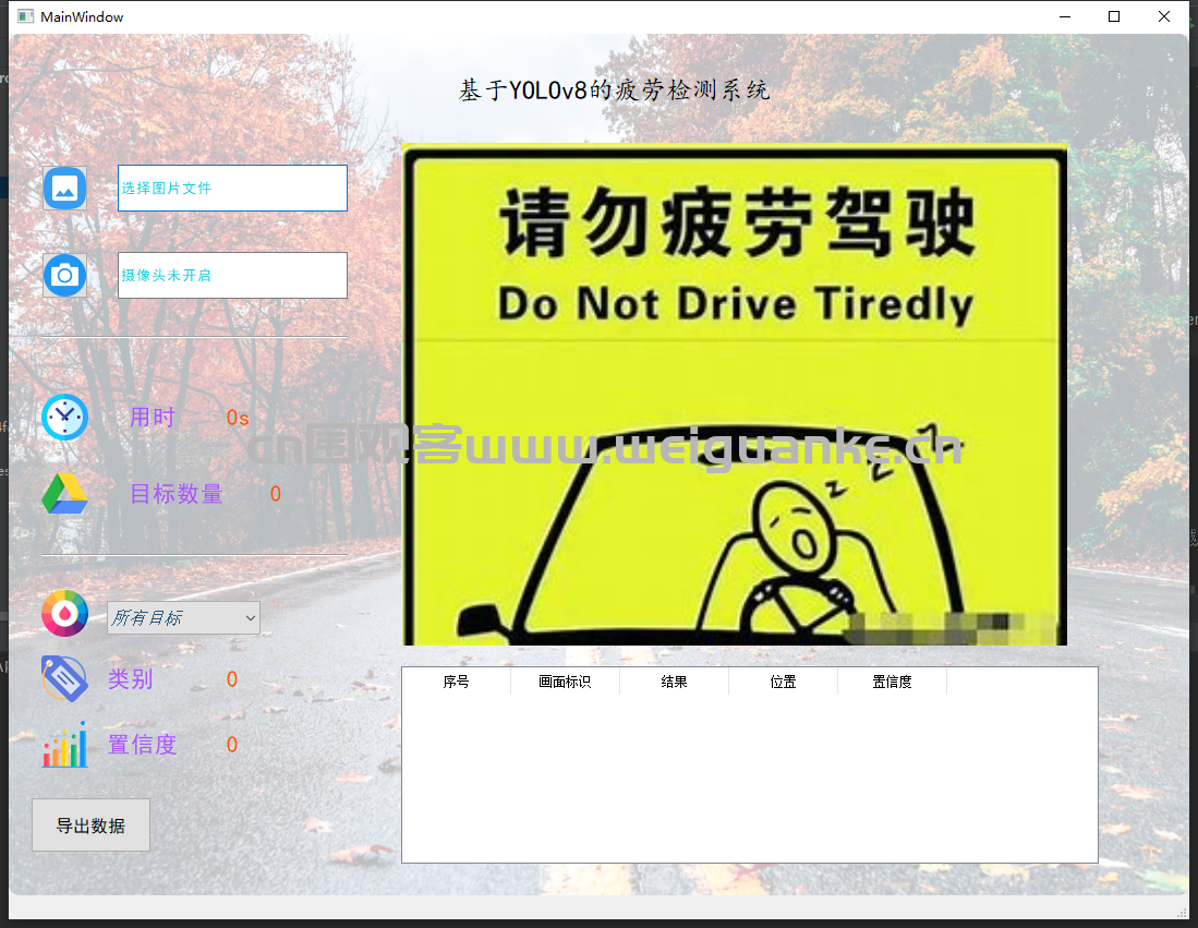 zhe, zhuo python 2天前 基于 PyQt5+ yolov8 疲劳检测系统 项目描述 基于 PyQt5+ YOLOv8的疲劳检测系统。 项目功能 文件导入:导入图片可导入多张图片 视频导入导入后显示结果,摄像头识别识别显示结果 检测结果: 图片识别:导入图片识别疲劳状态 摄像头识别:摄像头识别疲劳状态 运行环境 开发环境 pycharm 运行环境 py3.8 项目技术 PyQt5 启动:main.py 启动项目 以上系统源码经过技术整理与调试,确保能正常运行