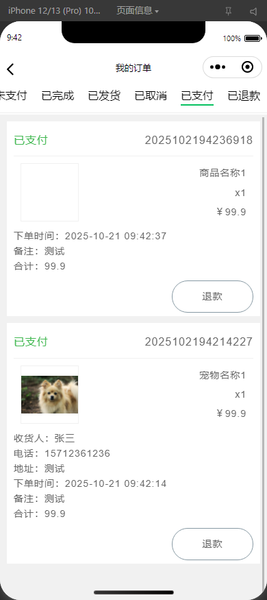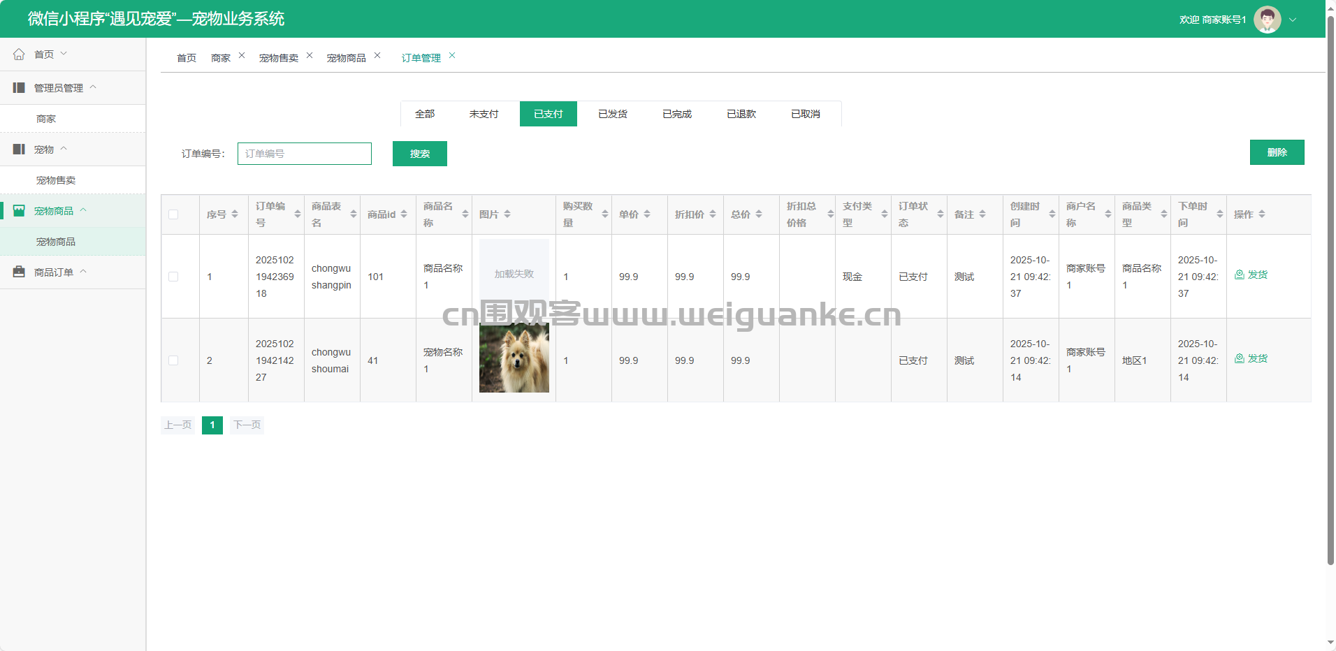 商品订单:按状态检索订单并执行退款、关闭等操作。