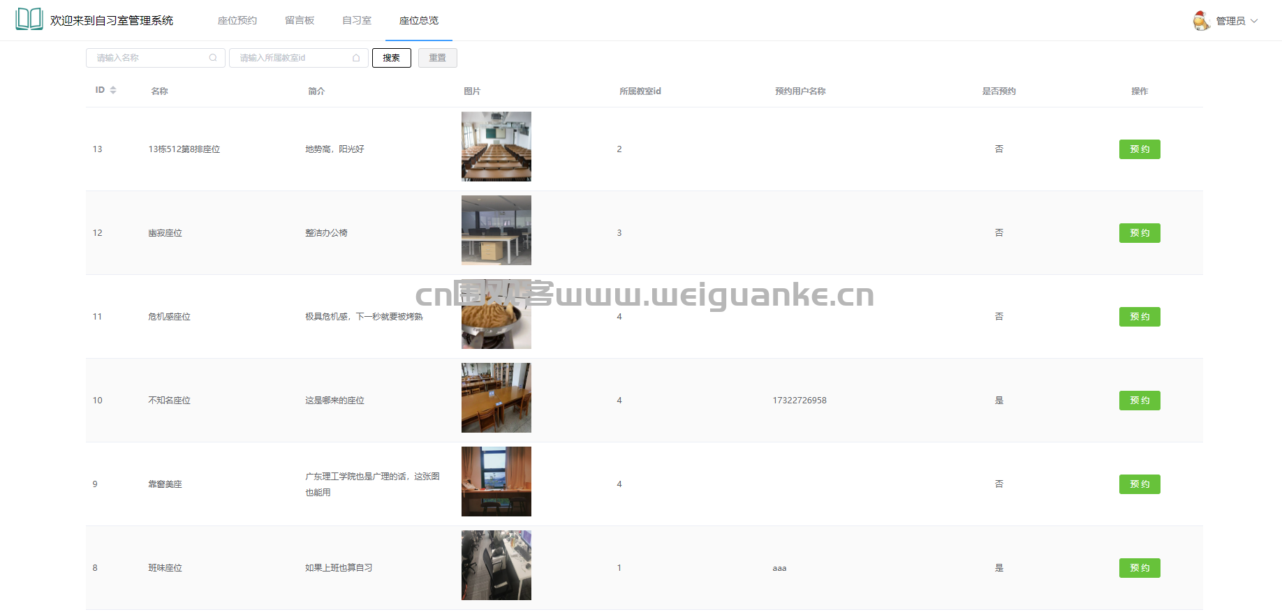 – 用户可以查看所有座位的总览信息,包括座位的位置、状态和预约情况。用户还可以根据需要筛选和排序座位信息。