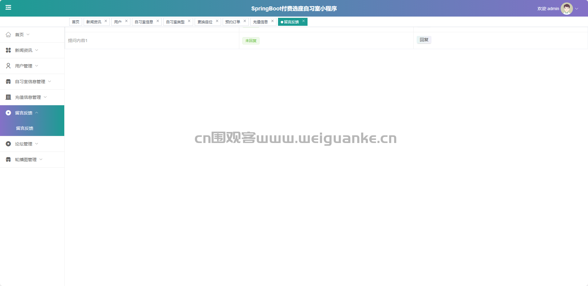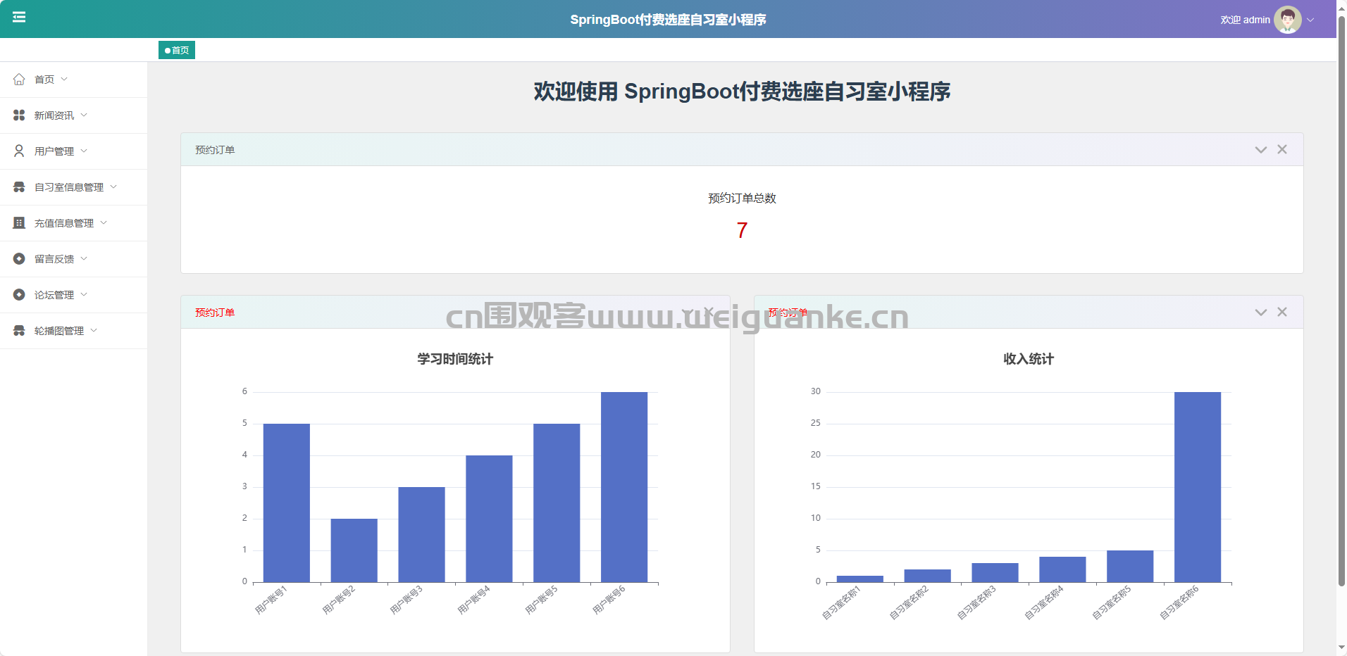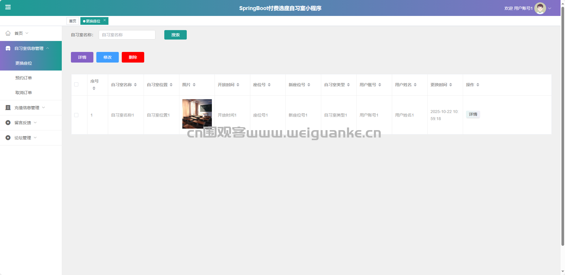基于SpringBoot+Vue+微信小程序的付费选座自习室平台,提供座位实时预览、在线预约、在线支付、限时占座、取消退单、充值消费、社区交流及后台统一配置功能,实现无人值守自习室全链路数字化管理。
