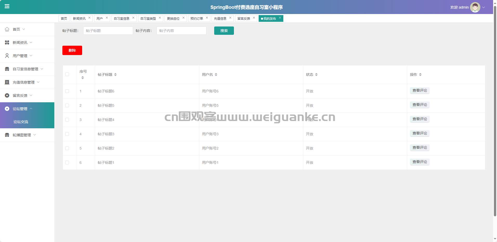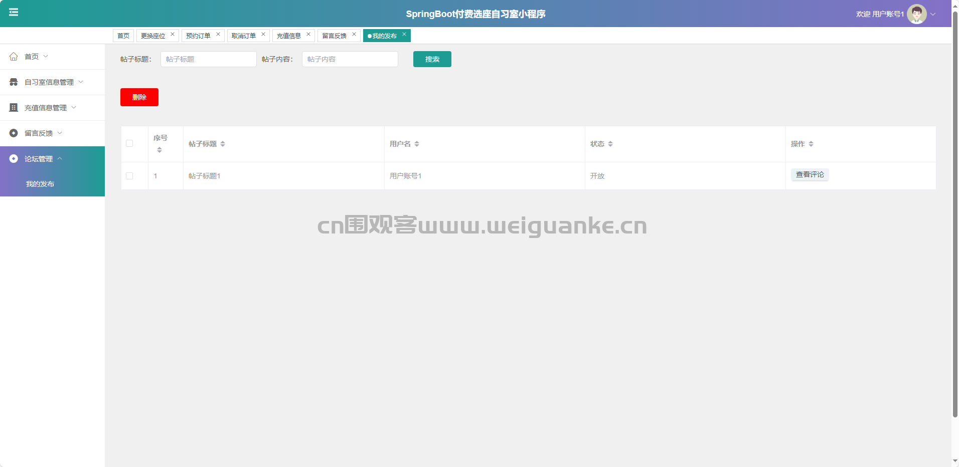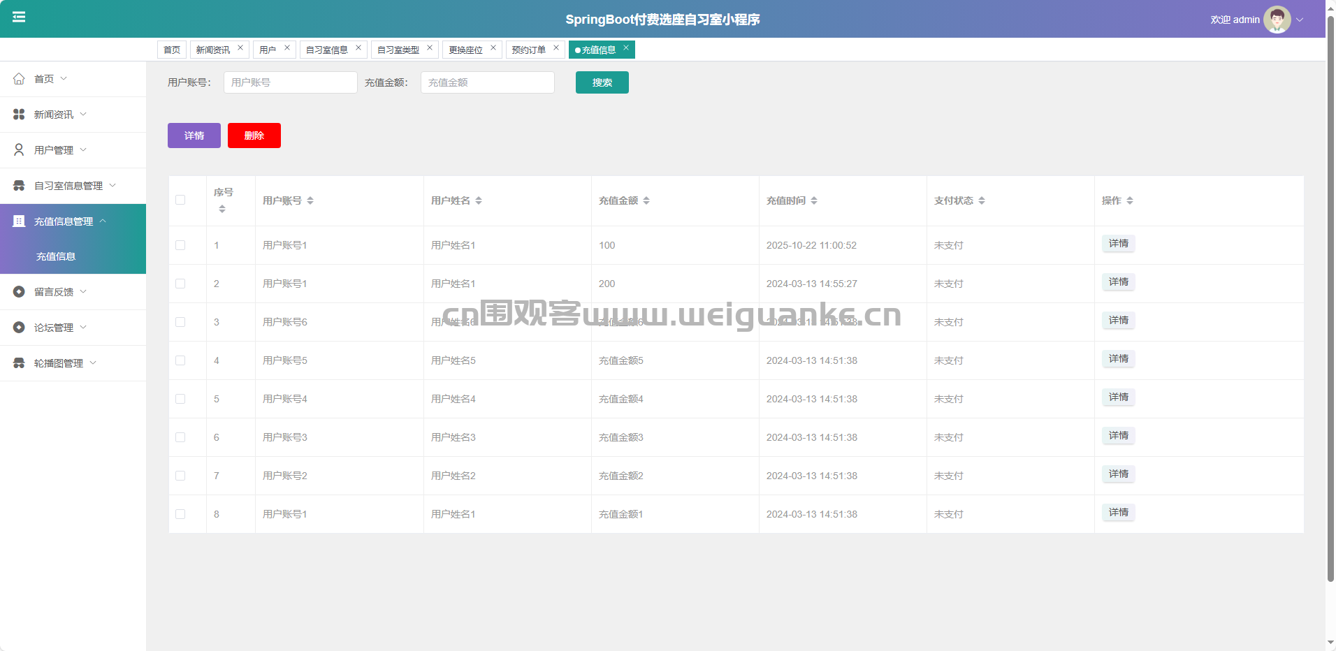 基于SpringBoot+Vue+微信小程序的付费选座自习室平台,提供座位实时预览、在线预约、在线支付、限时占座、取消退单、充值消费、社区交流及后台统一配置功能,实现无人值守自习室全链路数字化管理。