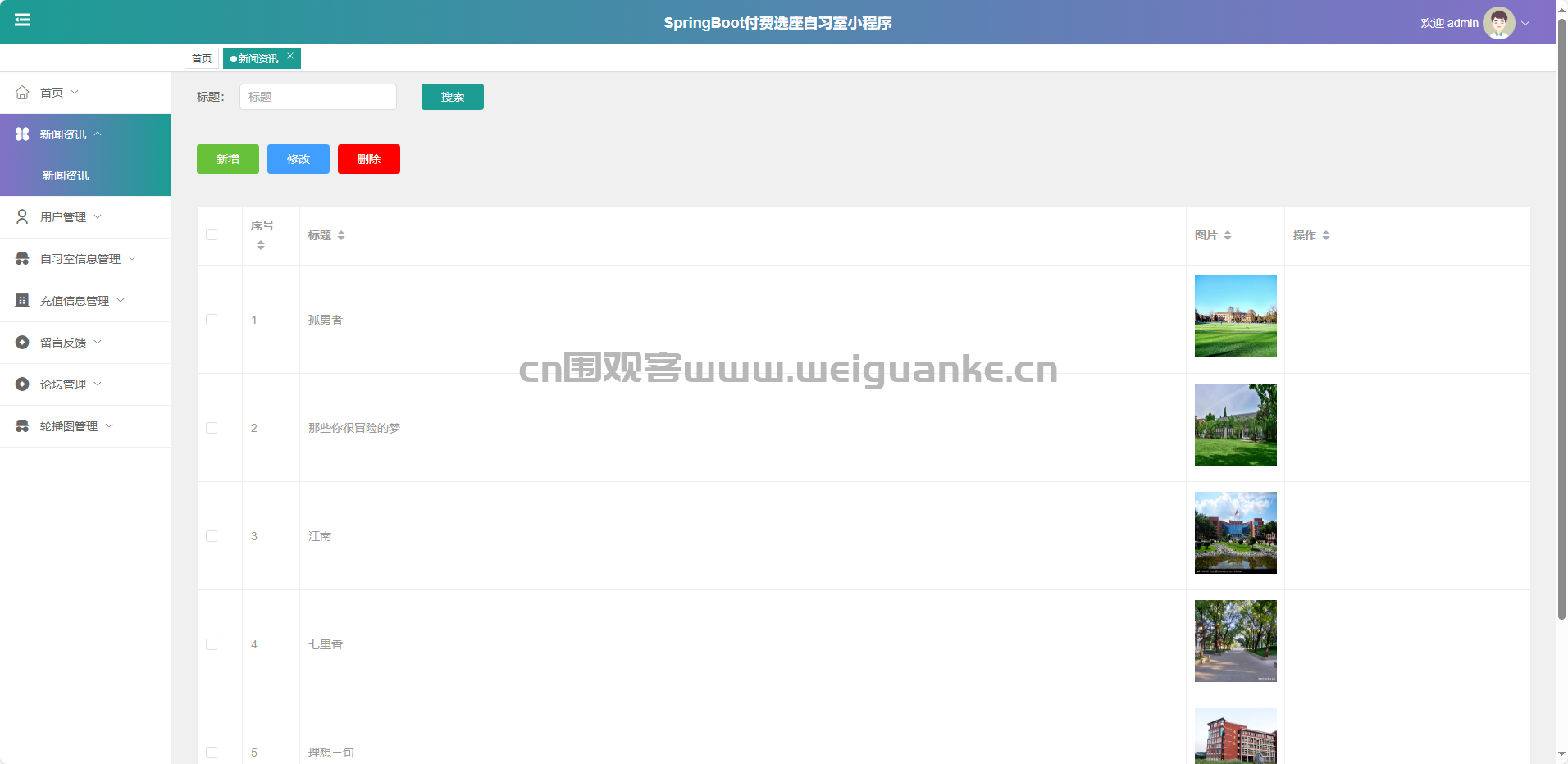 新闻资讯:新增、修改、删除、查看资讯文章。