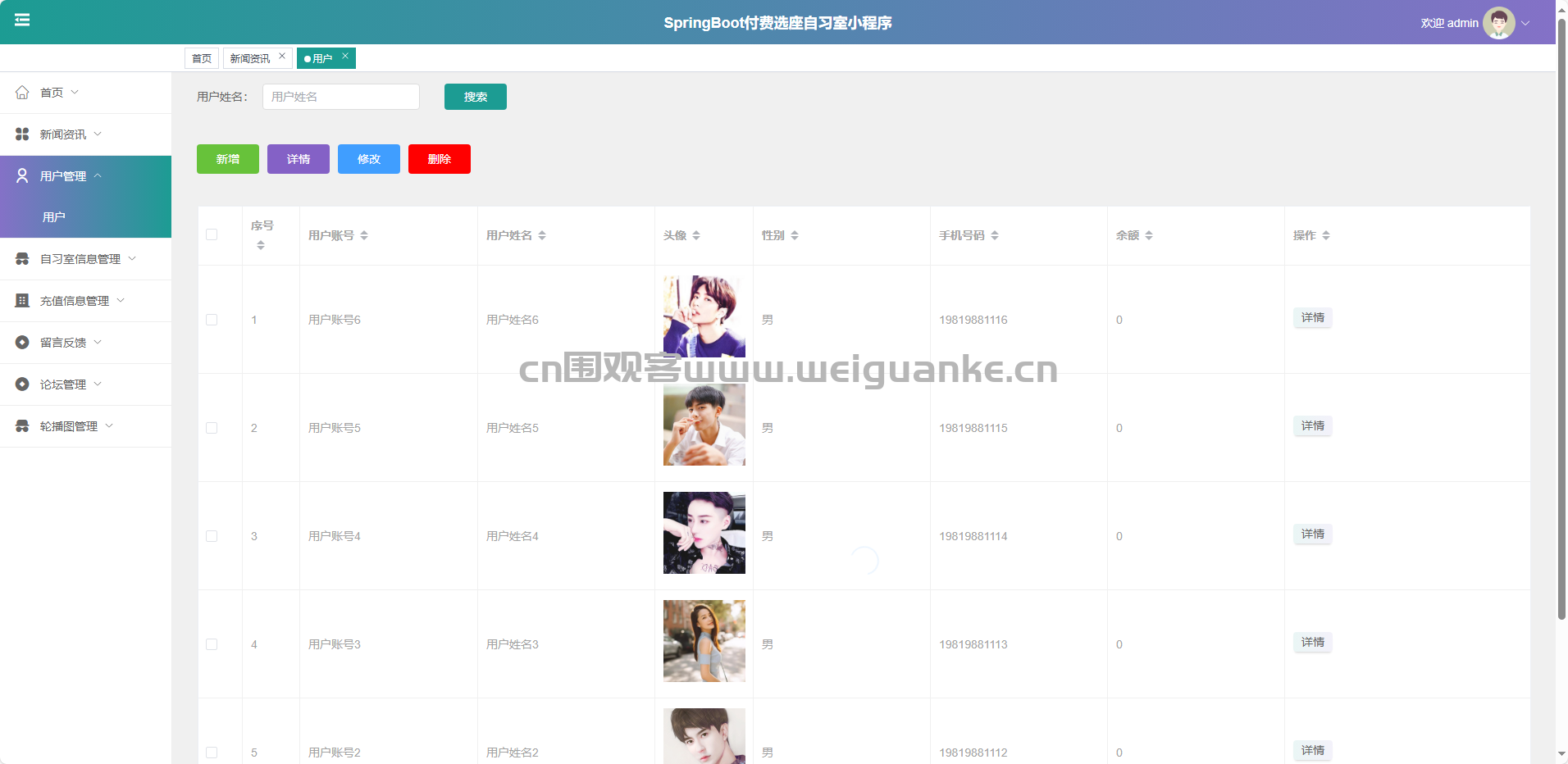 用户管理:新增、修改、删除、查询注册用户,控制账户状态。