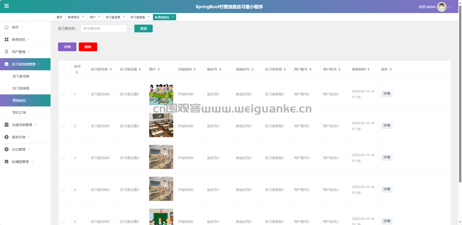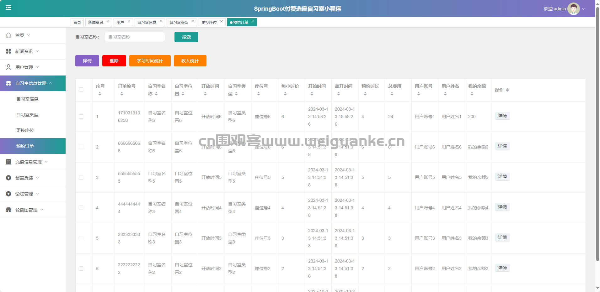 自习室信息管理-预约订单:查询、调整、取消、删除全部预约记录。