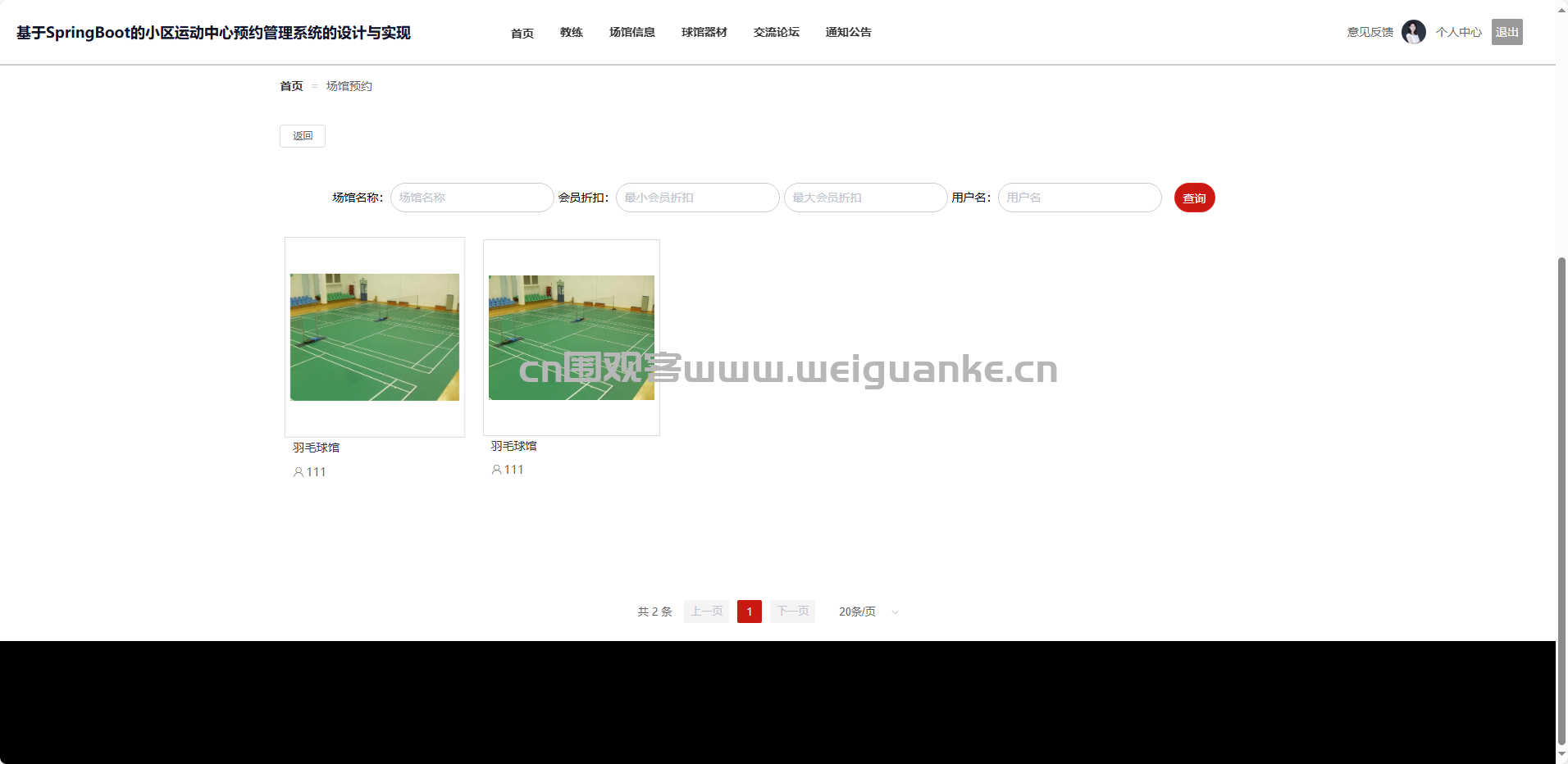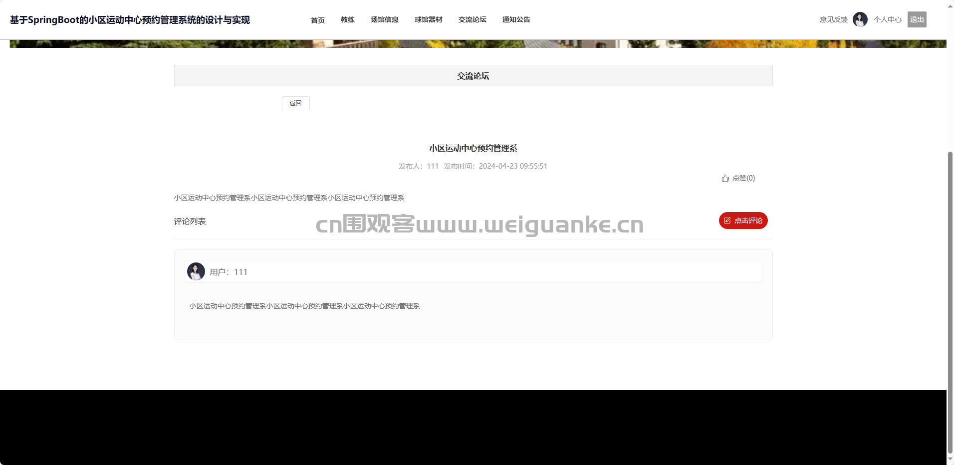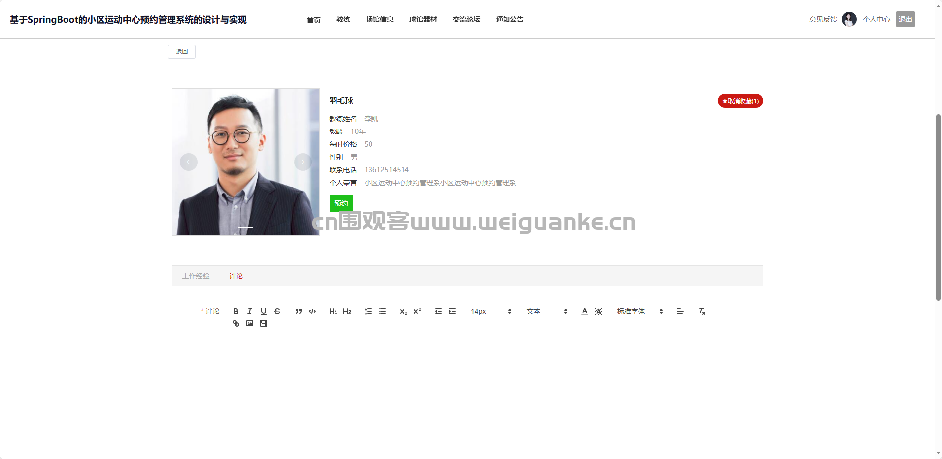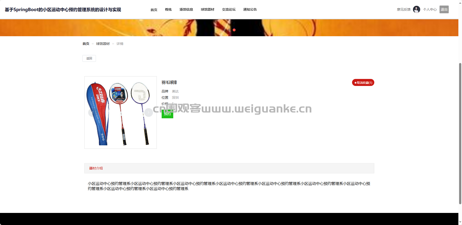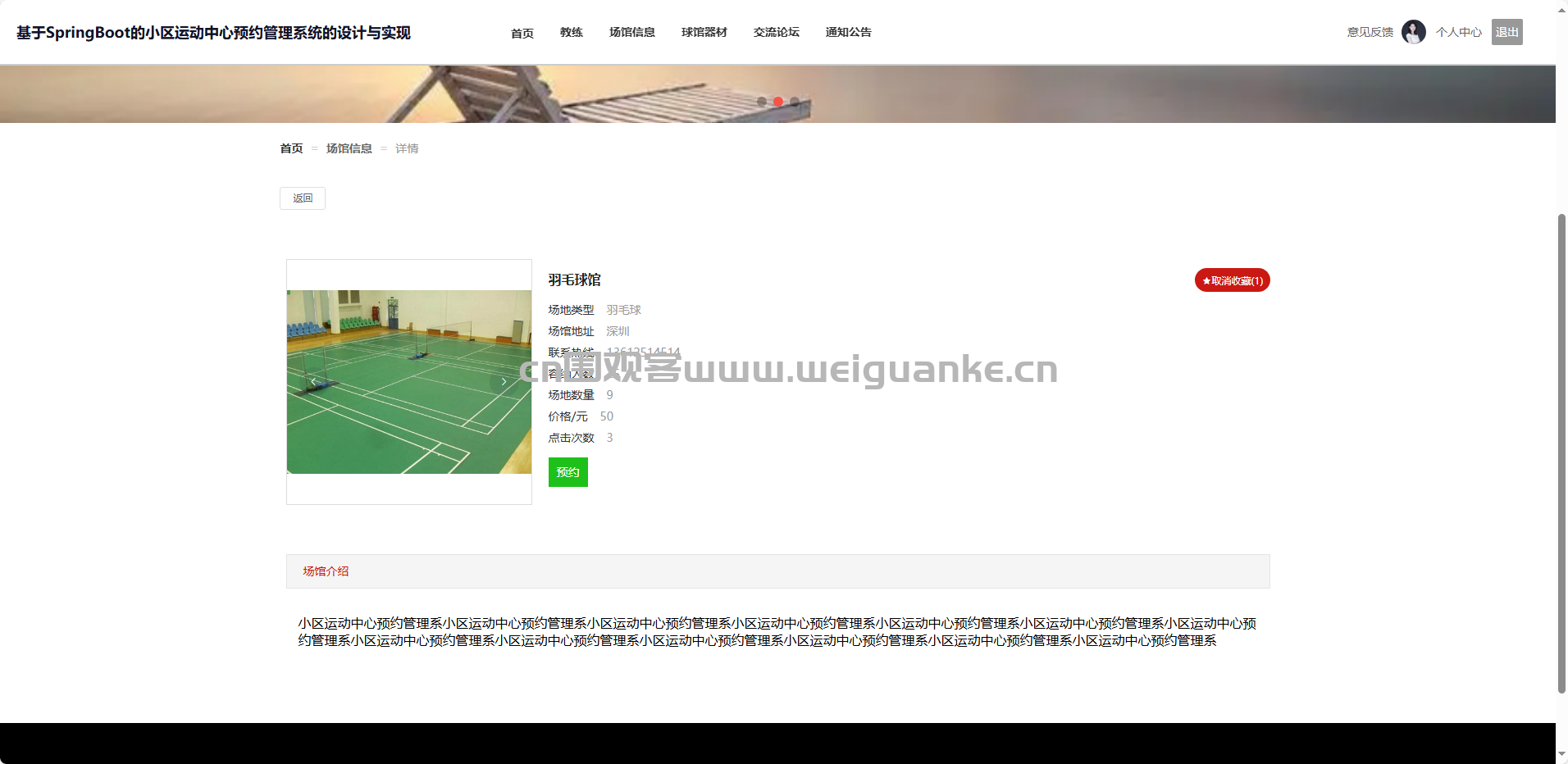 项目描述 基于springboot + vue的小区运动中心预约管理系统