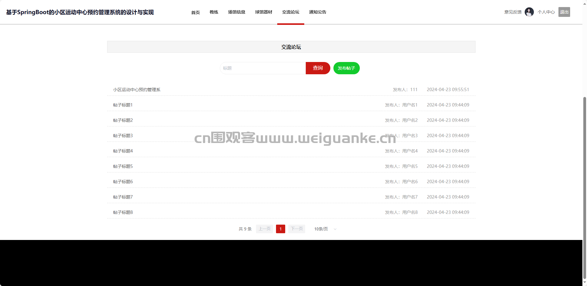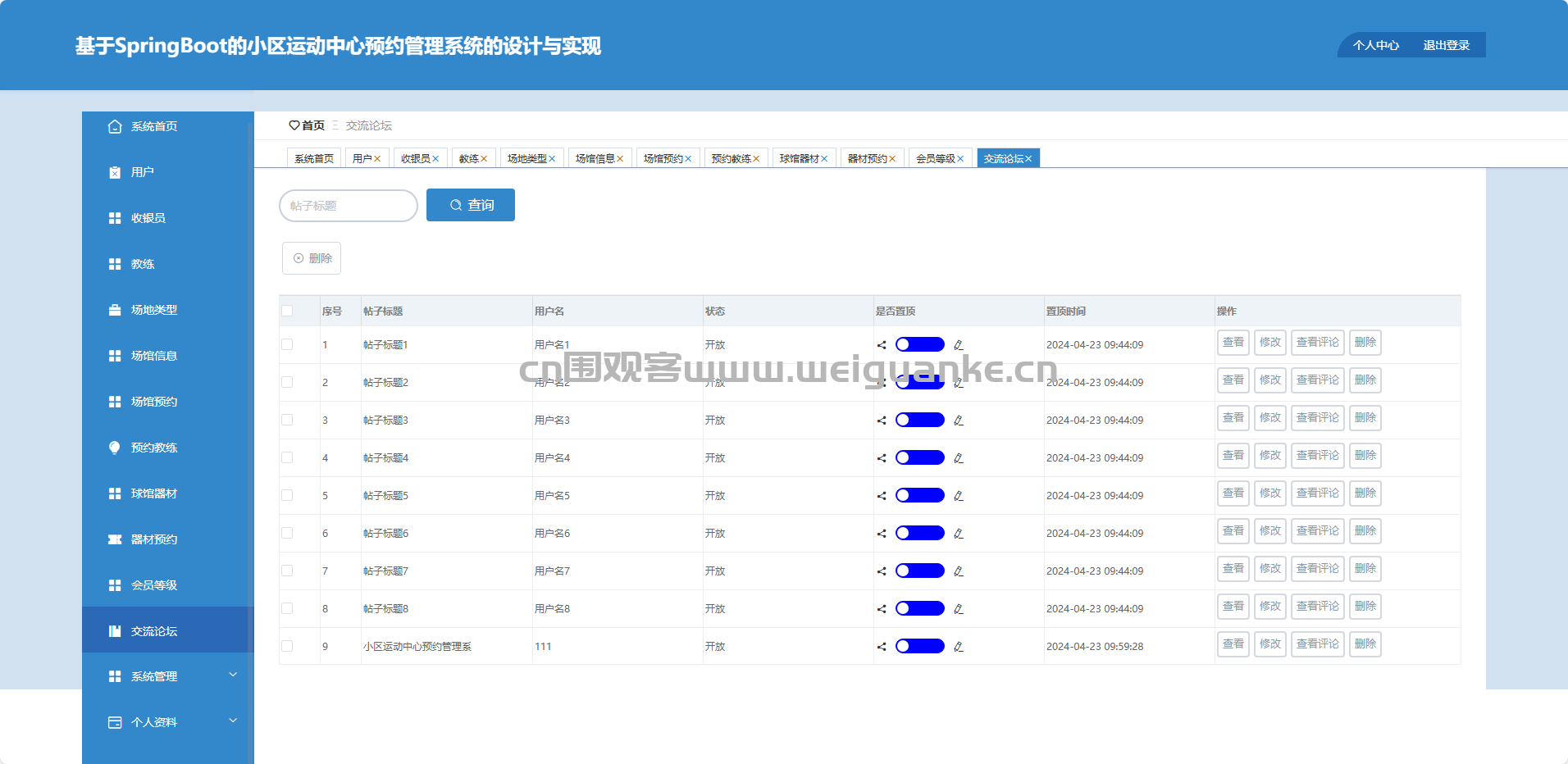 交流论坛:查询、置顶、删除帖子及回复。