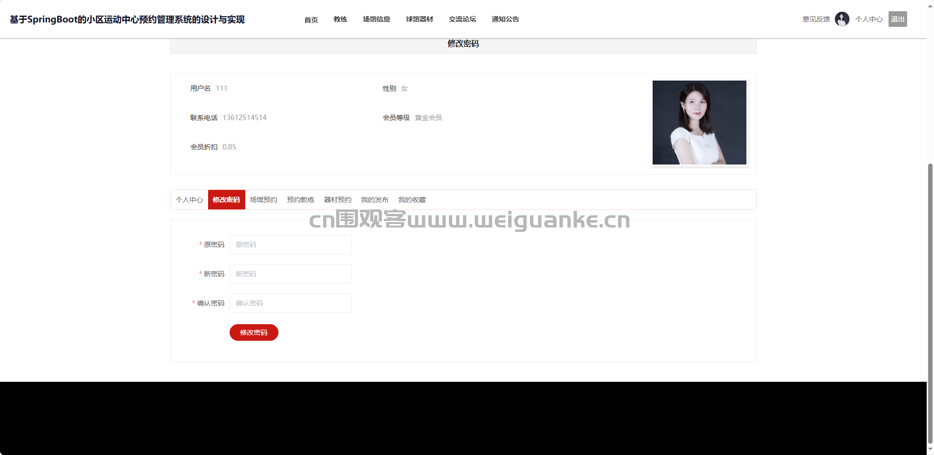 个人中心-修改密码:验证原口令后更新。