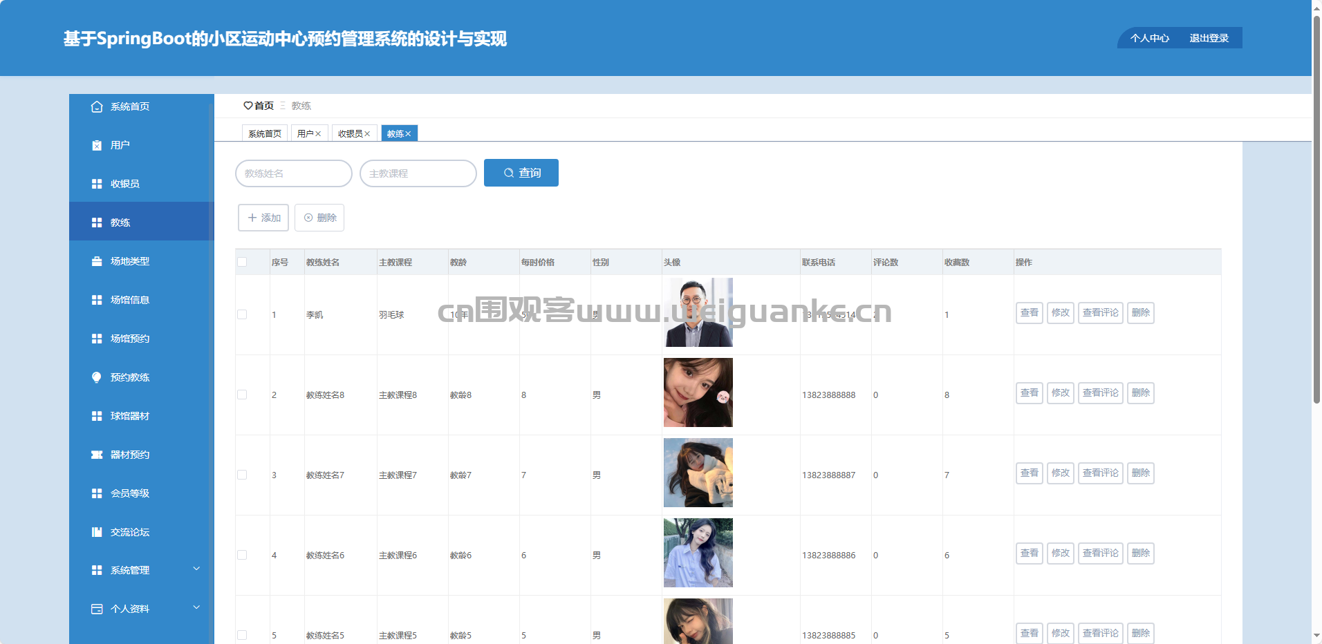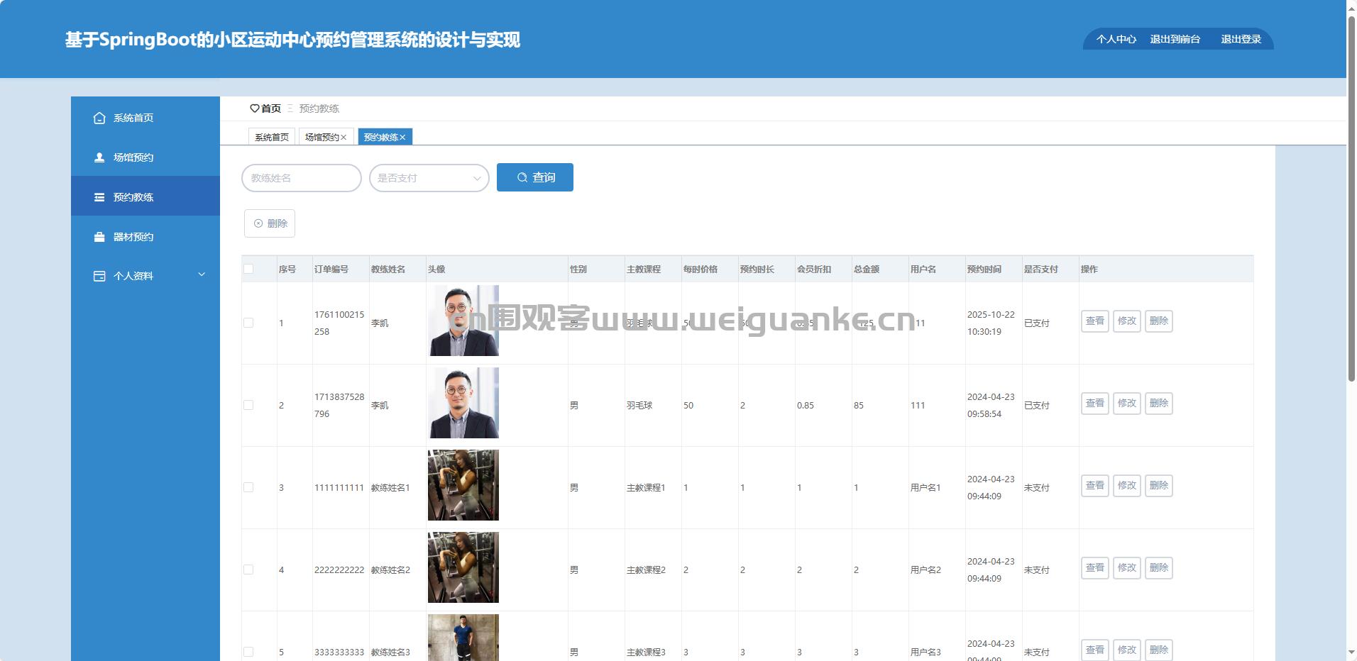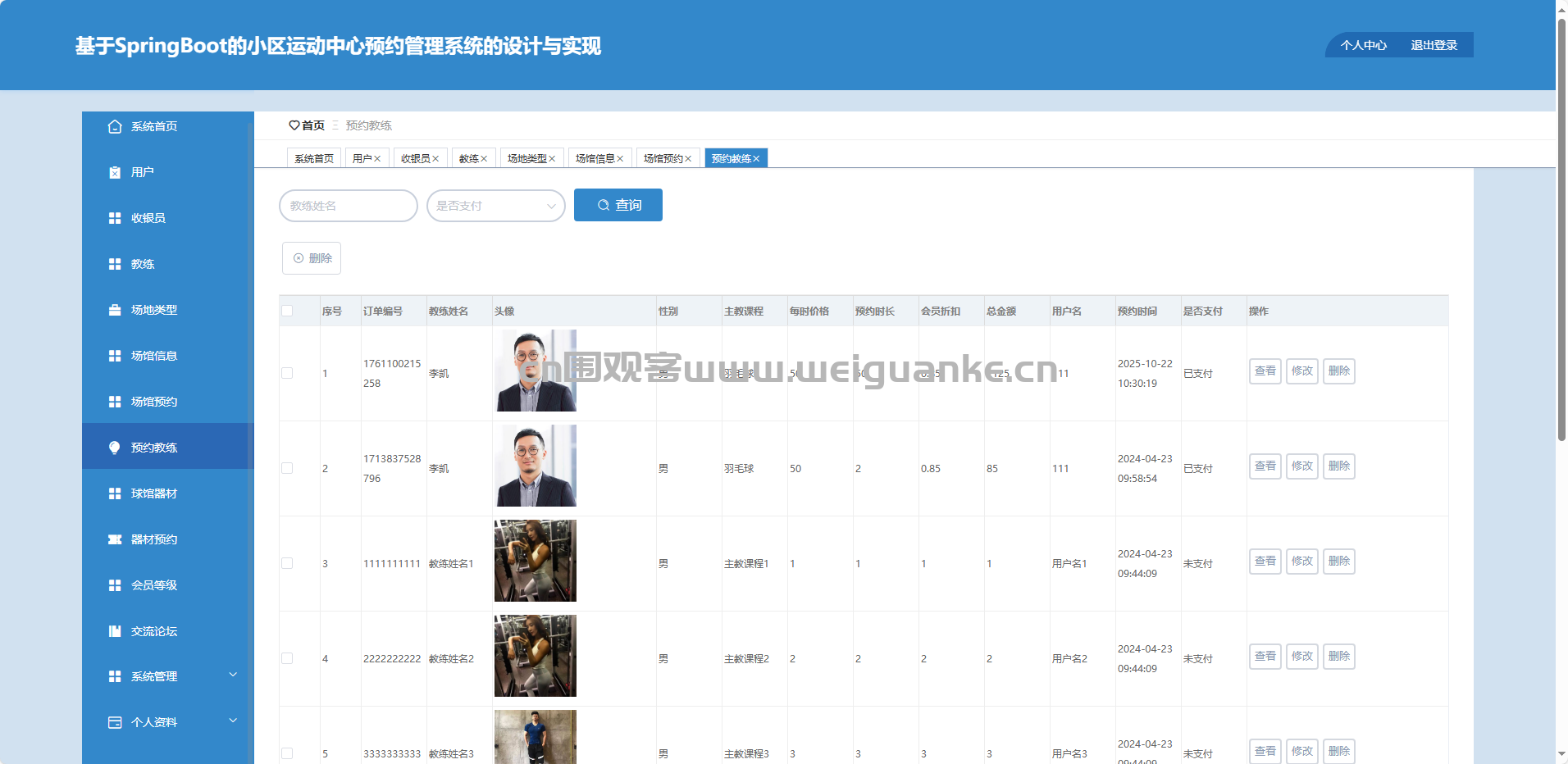 预约教练:查询、调整、取消、删除教练预约。