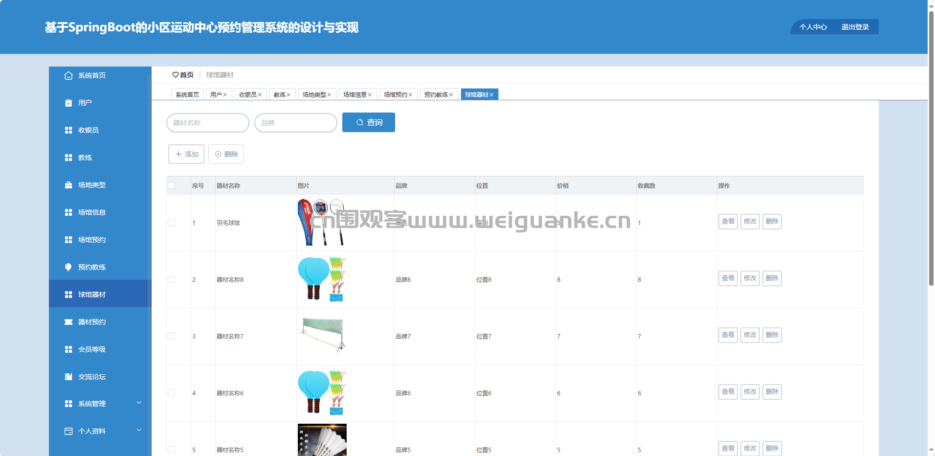 球馆器材:新增、修改、删除、查看器材信息。