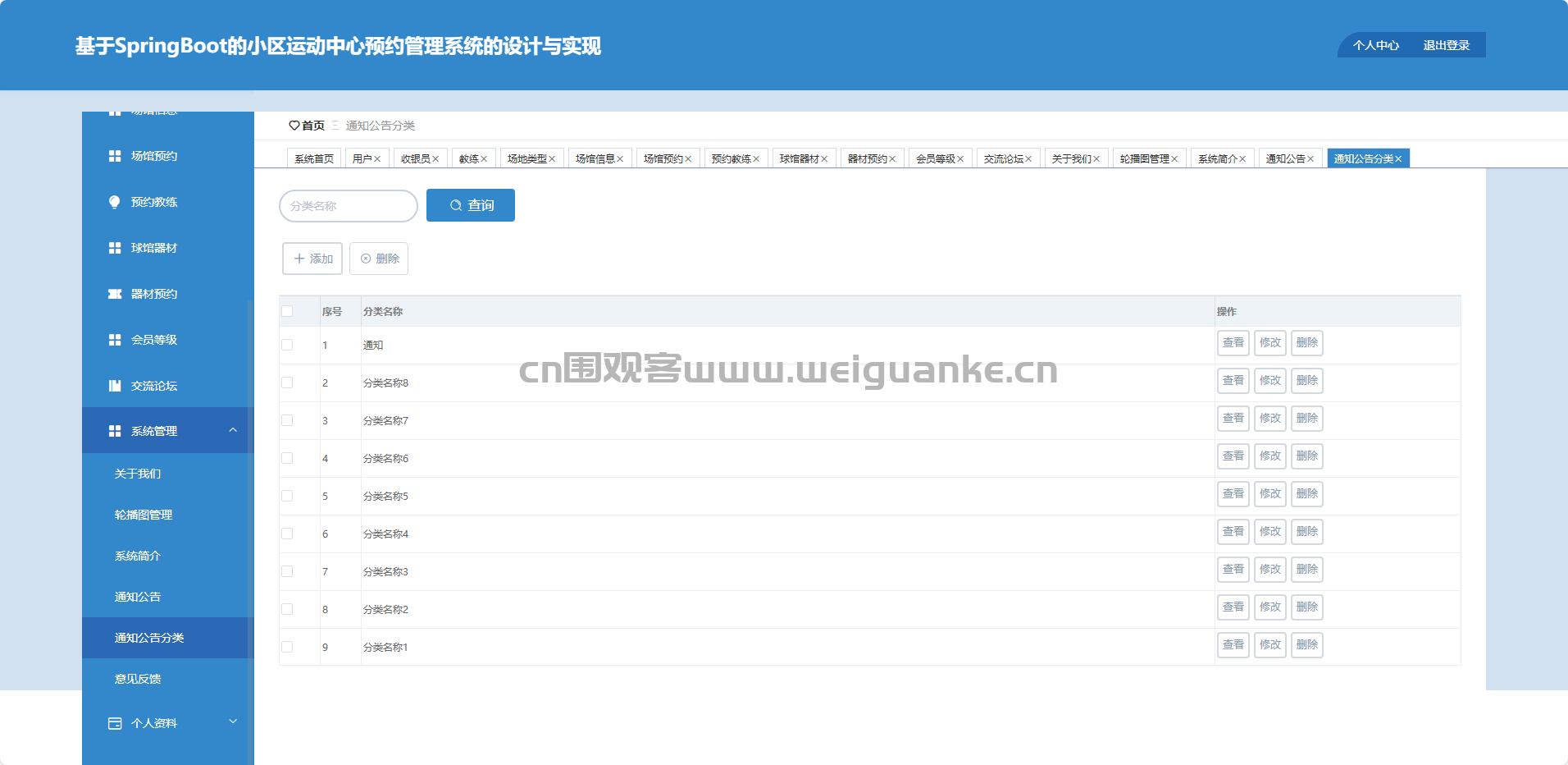 场地类型:新增、修改、删除、查看分类信息。