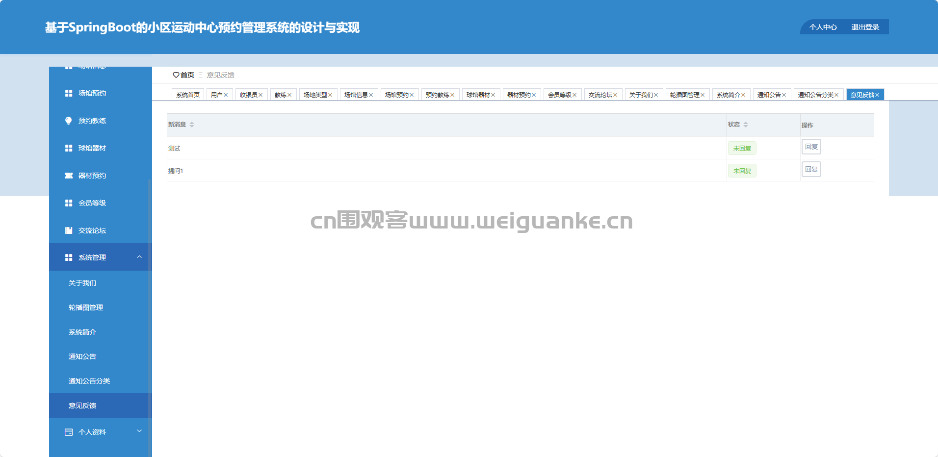 系统管理-意见反馈:查询、删除用户反馈。