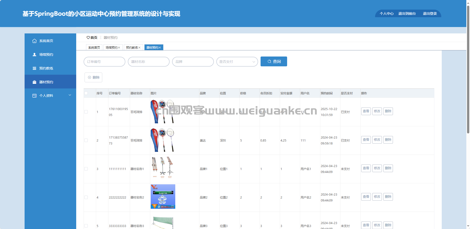 场馆预约:查询、确认、取消、删除预约记录。