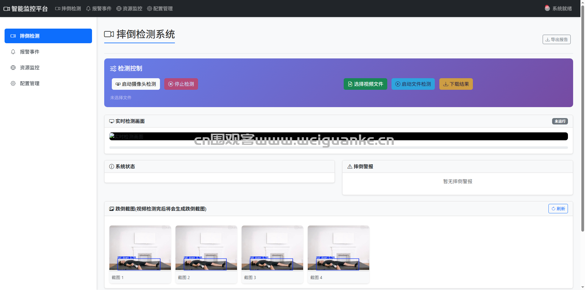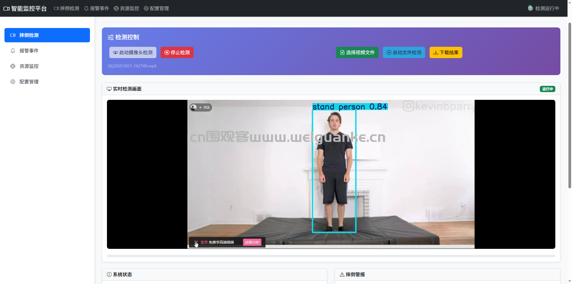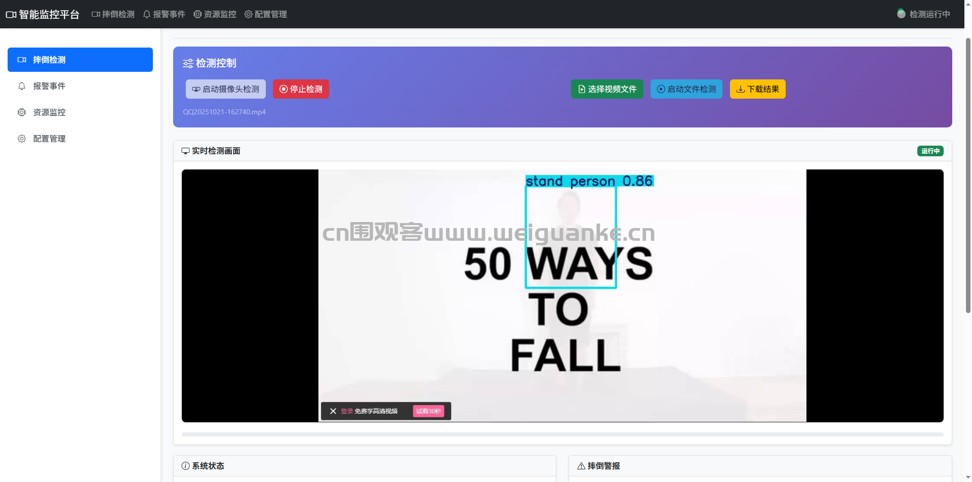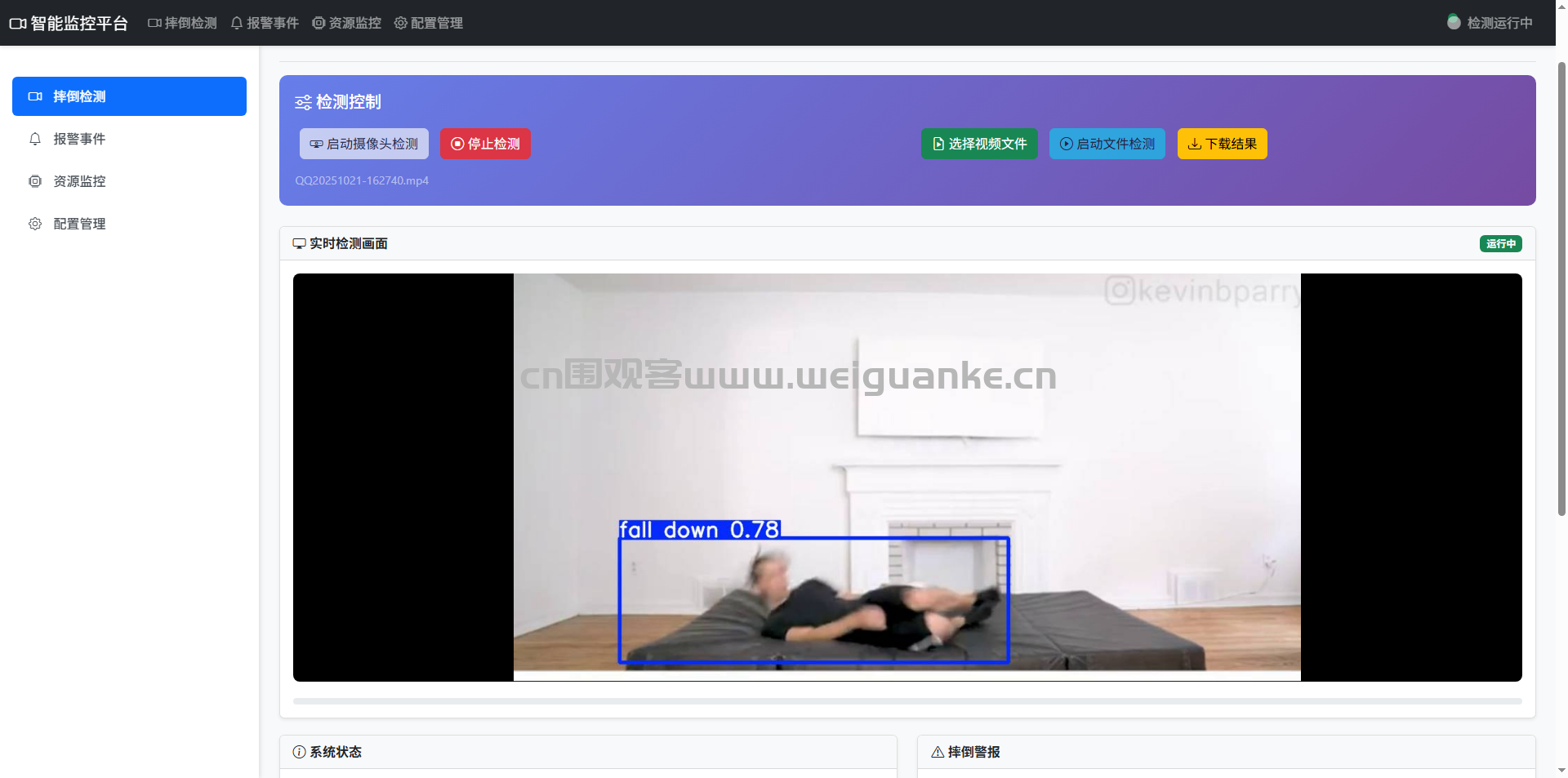 摔倒检测: 启动摄像头检测摔倒情况,导入视频检测摔倒情况