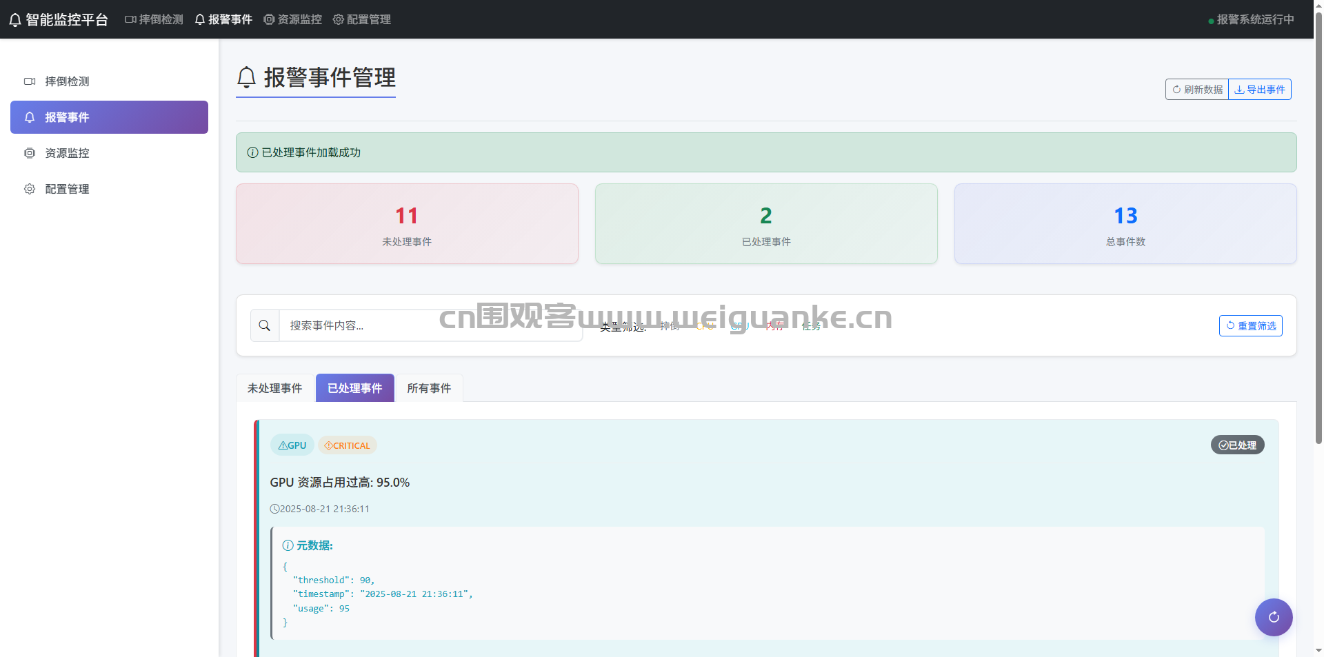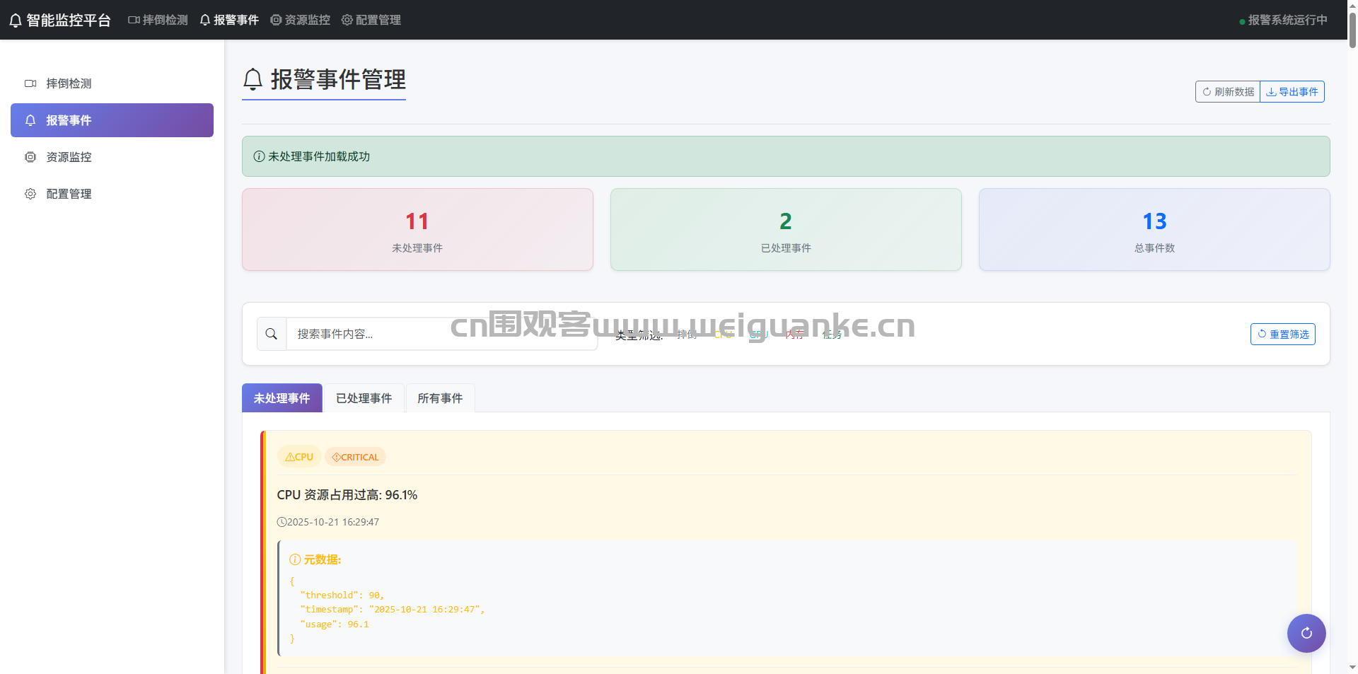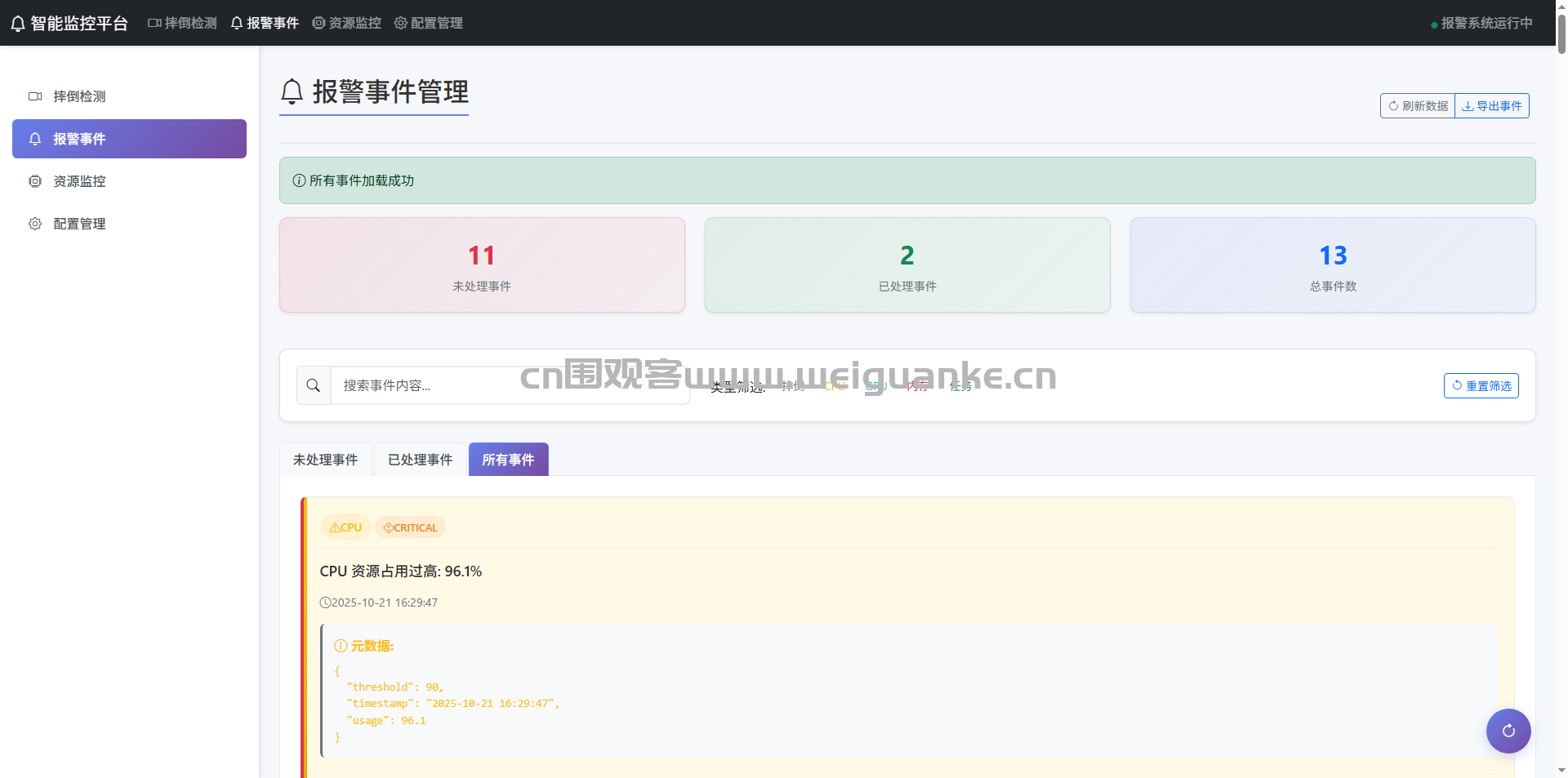 报警事件:显示数据事件 未处理事件 已处理事件 所有事情