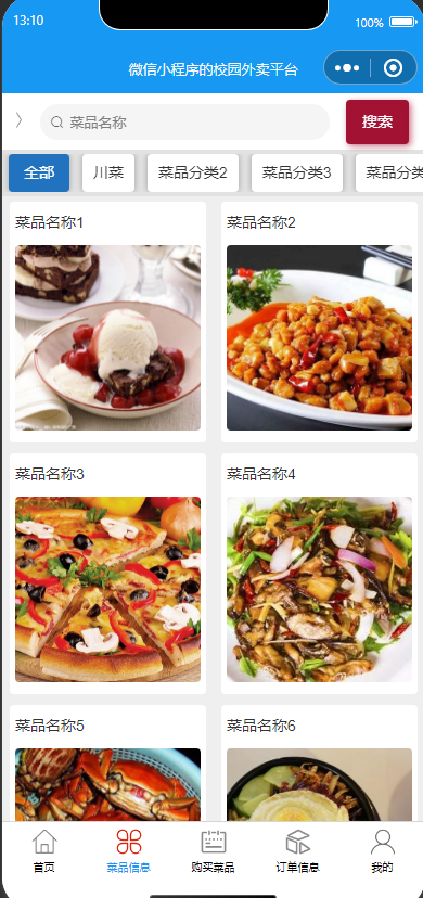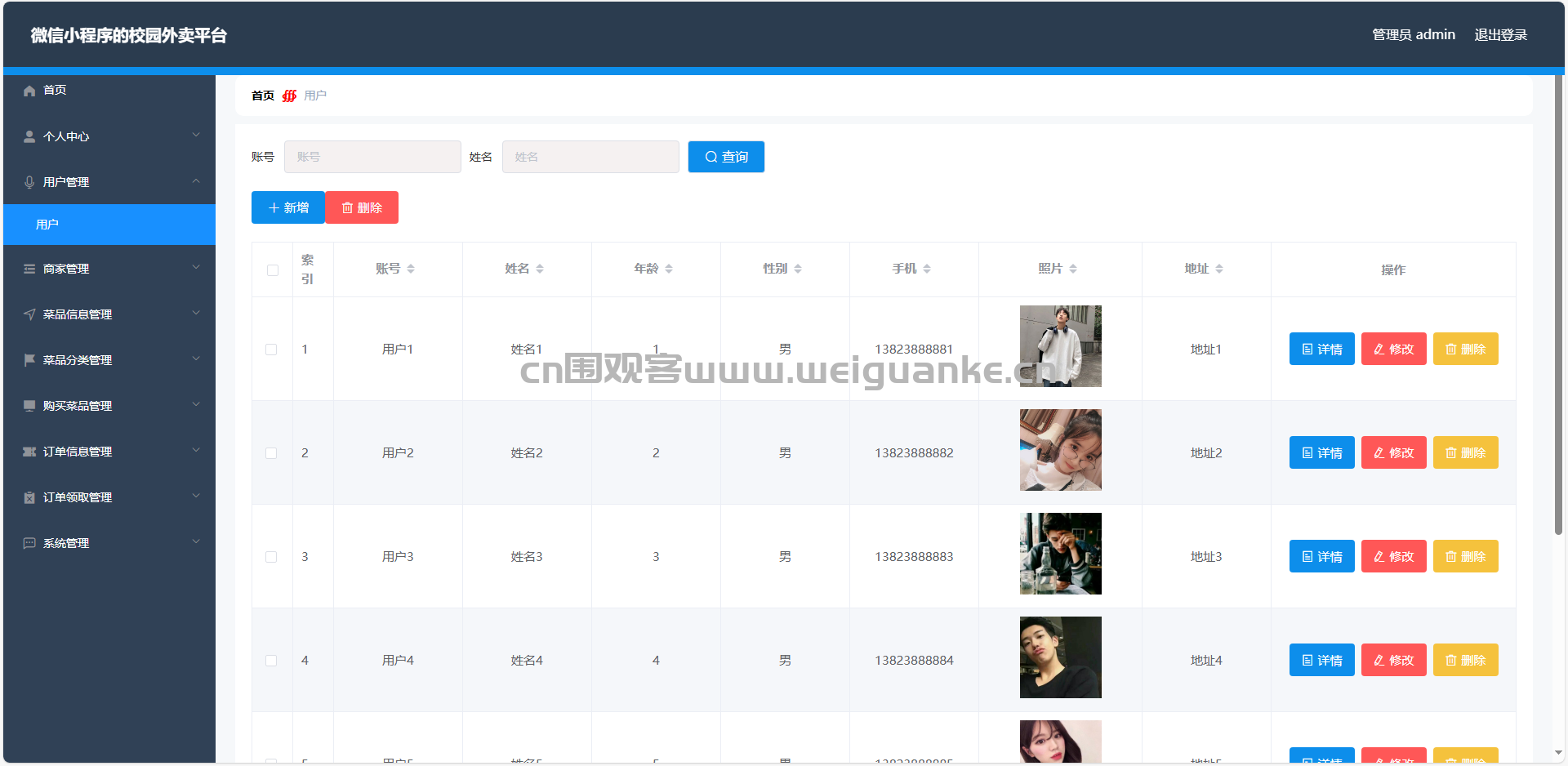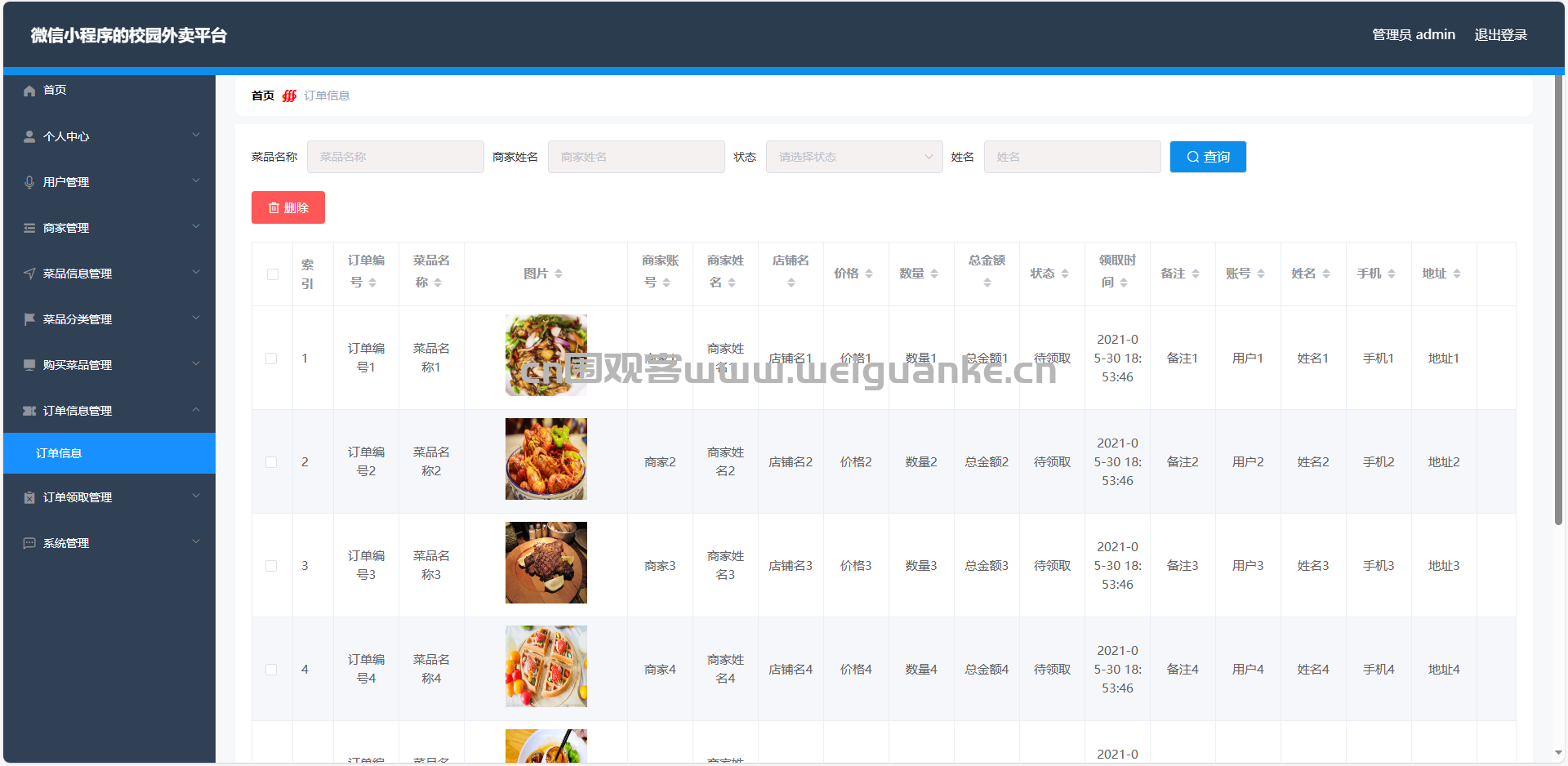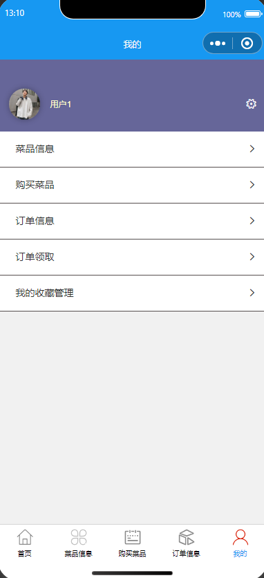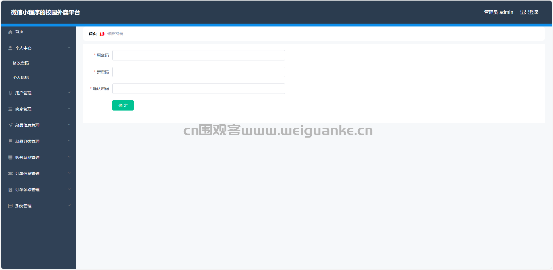 1.个人中心:查看和编辑个人信息,修改登录密码。管理菜品,购买菜品,订单,订单领取信息。