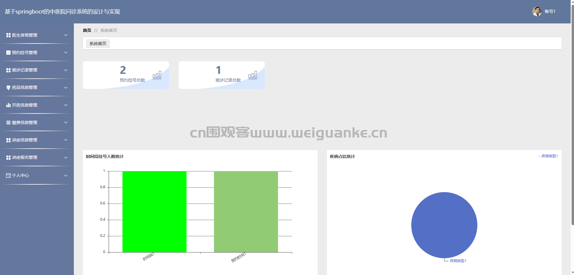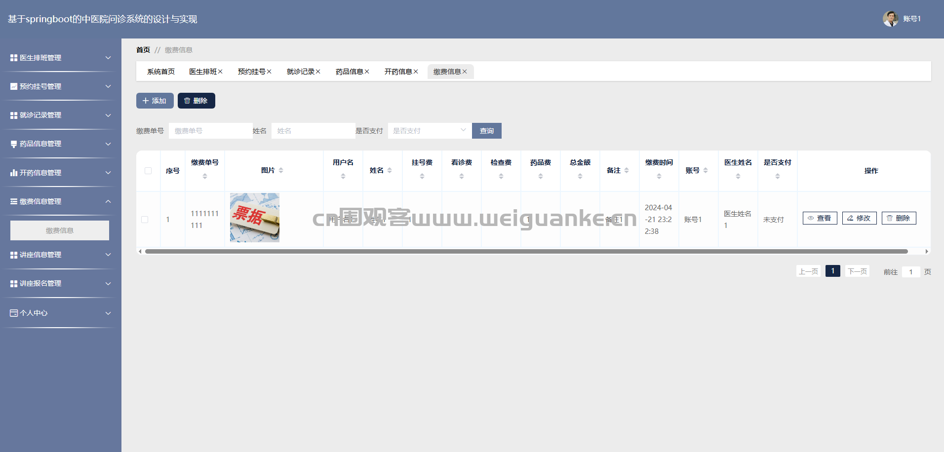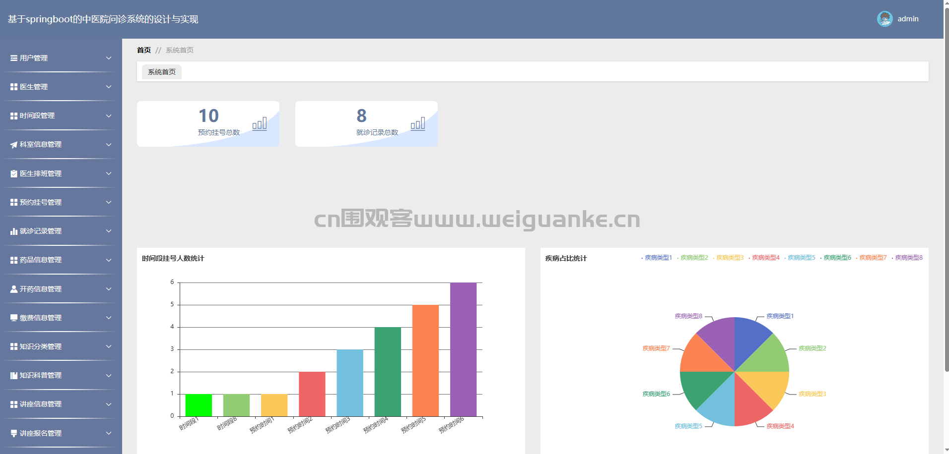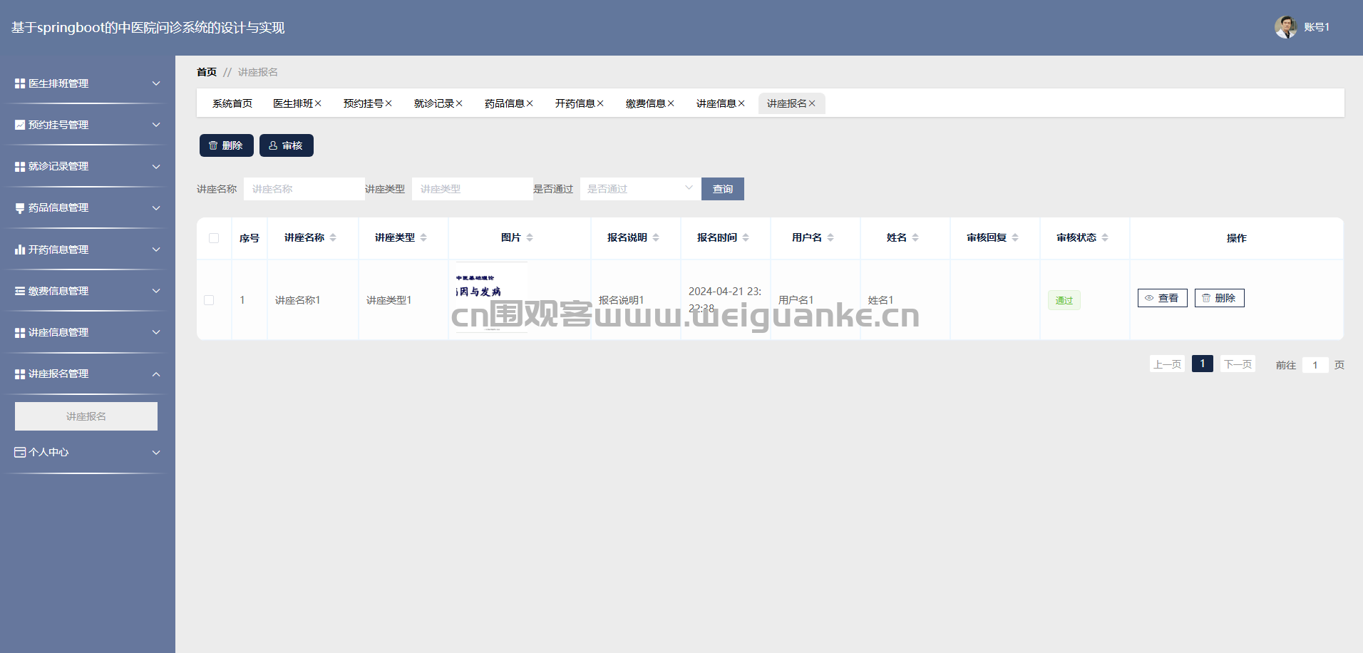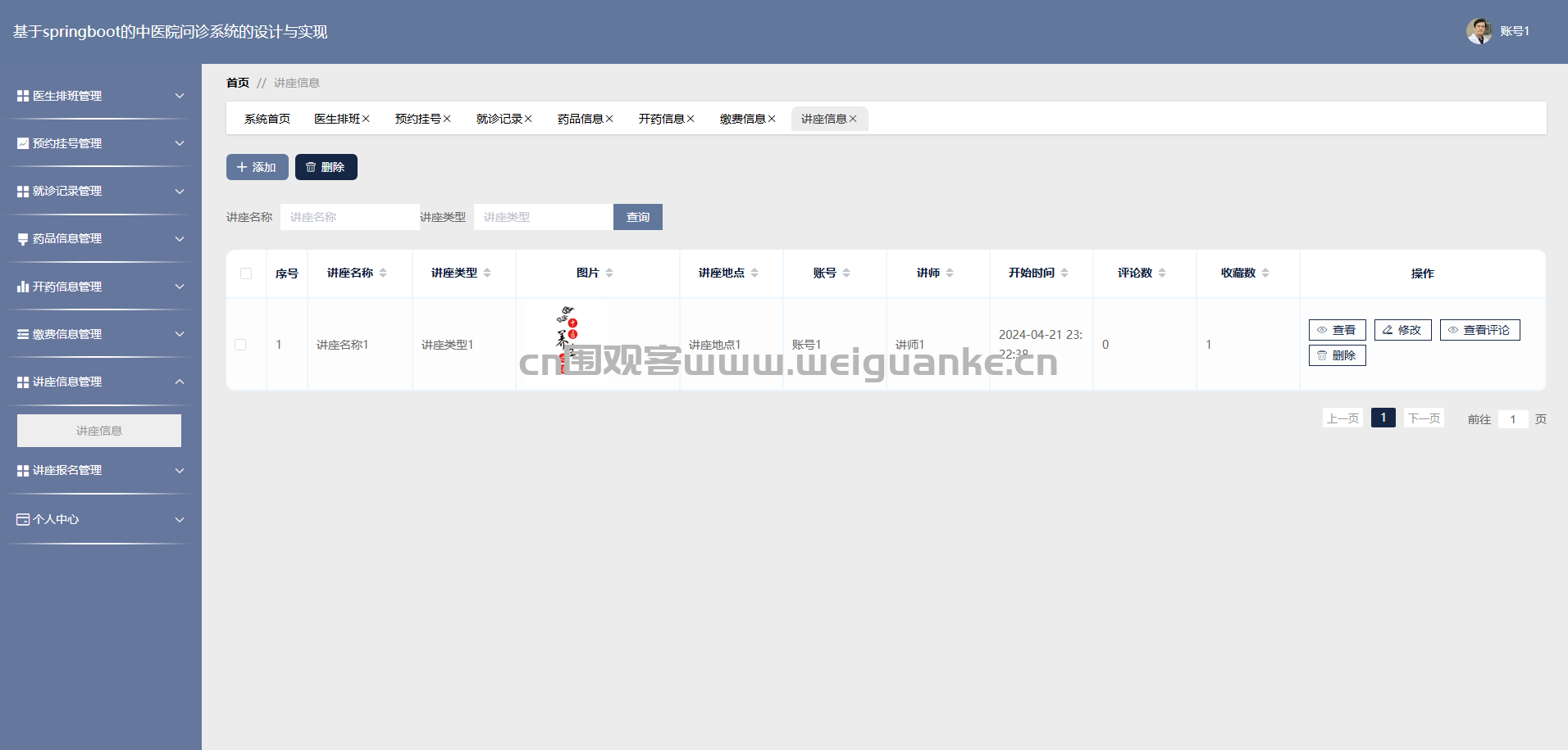 基于SpringBoot+Vue的中医院问诊系统,实现科室排班、预约挂号、在线问诊、电子处方、缴费、知识科普、讲座报名全流程信息化,支持患者、医生、管理员多端协同,提升诊疗效率与服务质量。