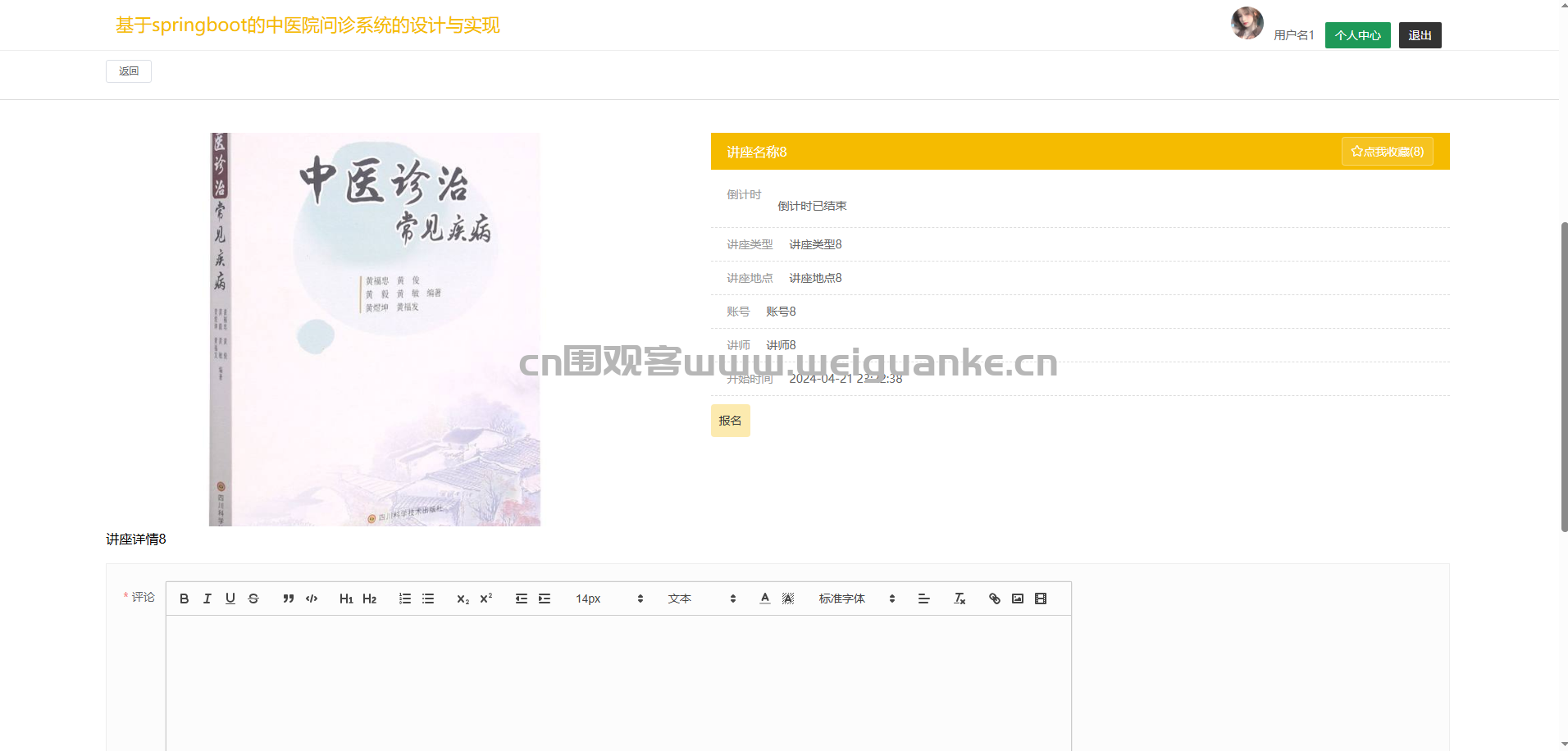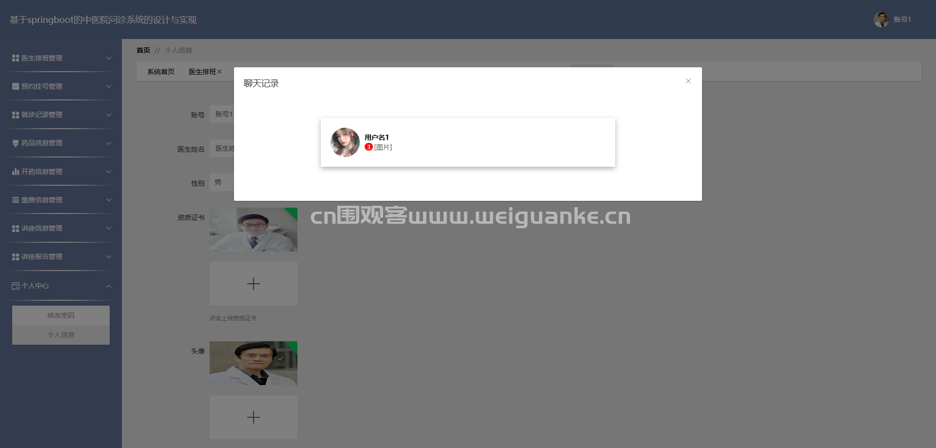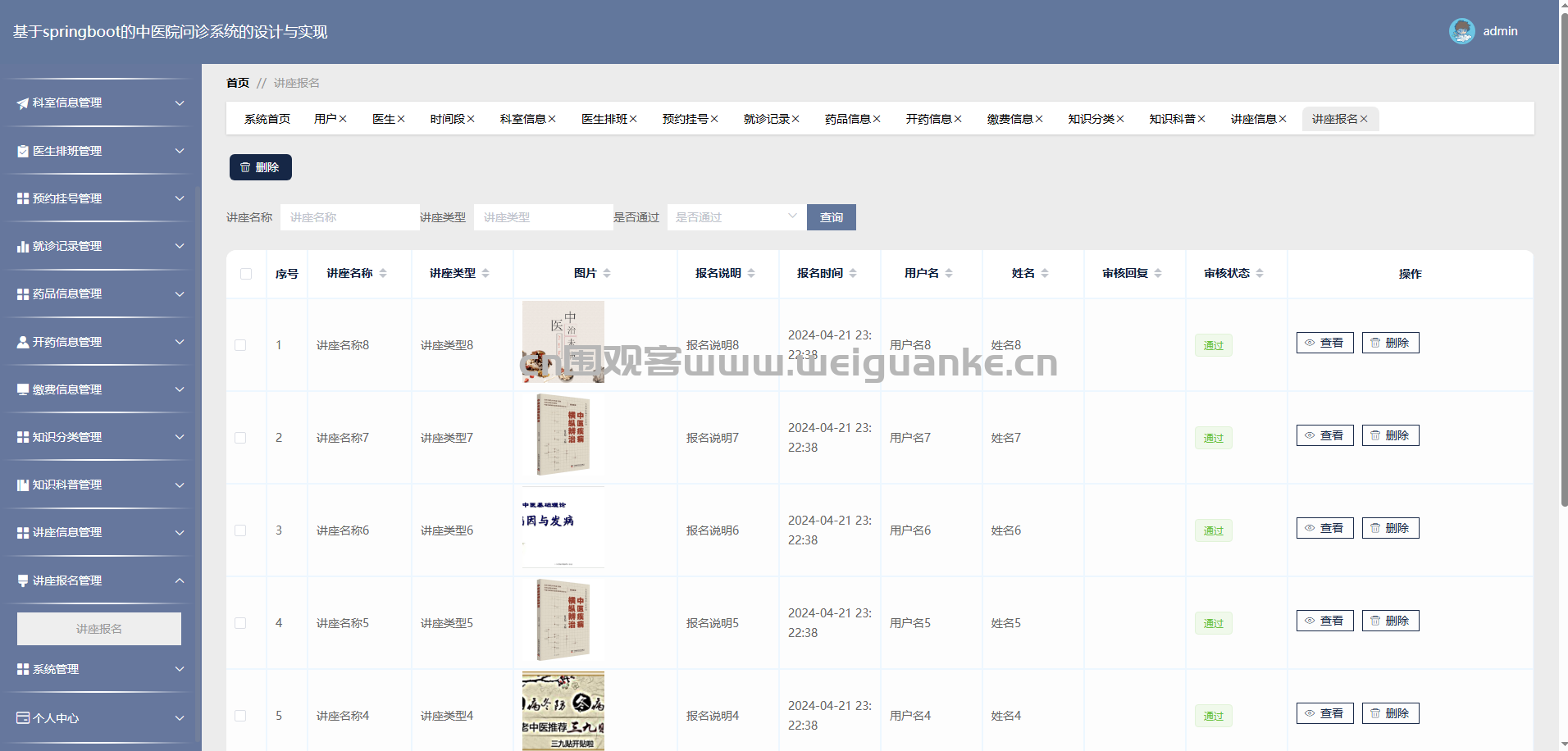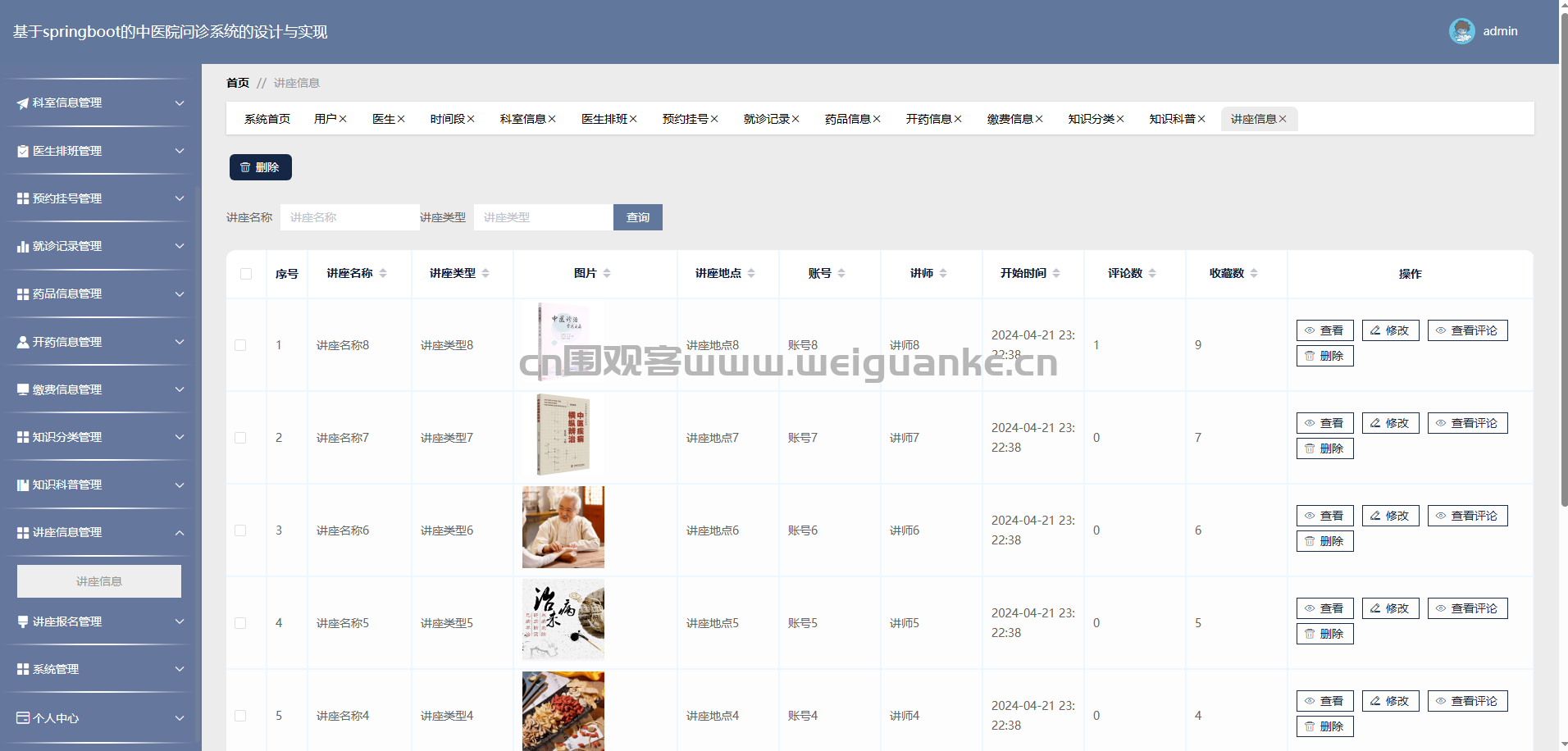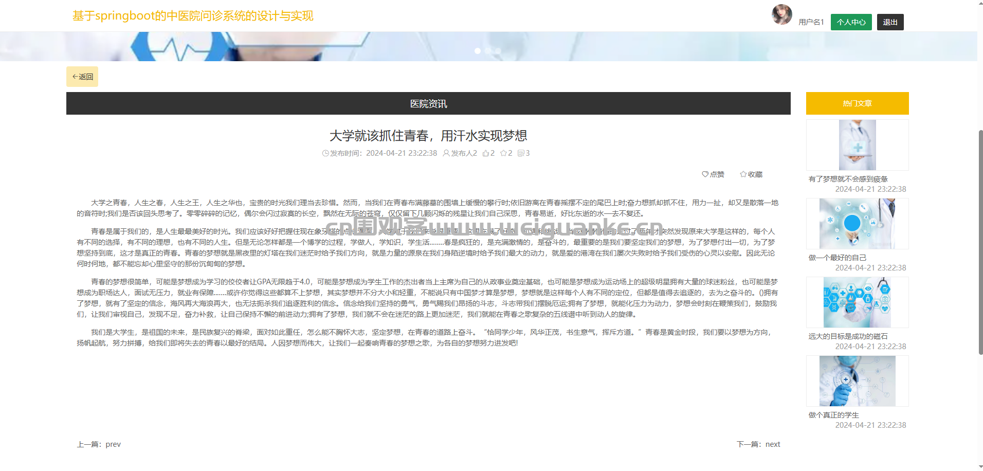 基于SpringBoot+Vue的中医院问诊系统,实现科室排班、预约挂号、在线问诊、电子处方、缴费、知识科普、讲座报名全流程信息化,支持患者、医生、管理员多端协同,提升诊疗效率与服务质量。