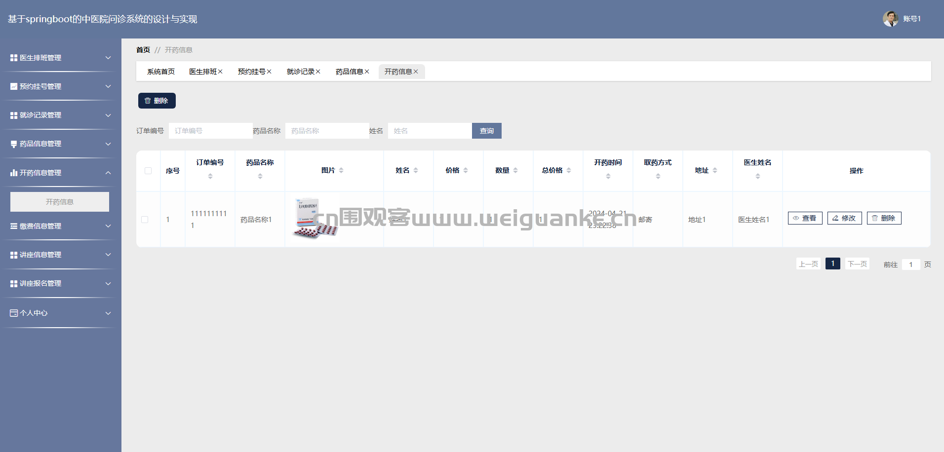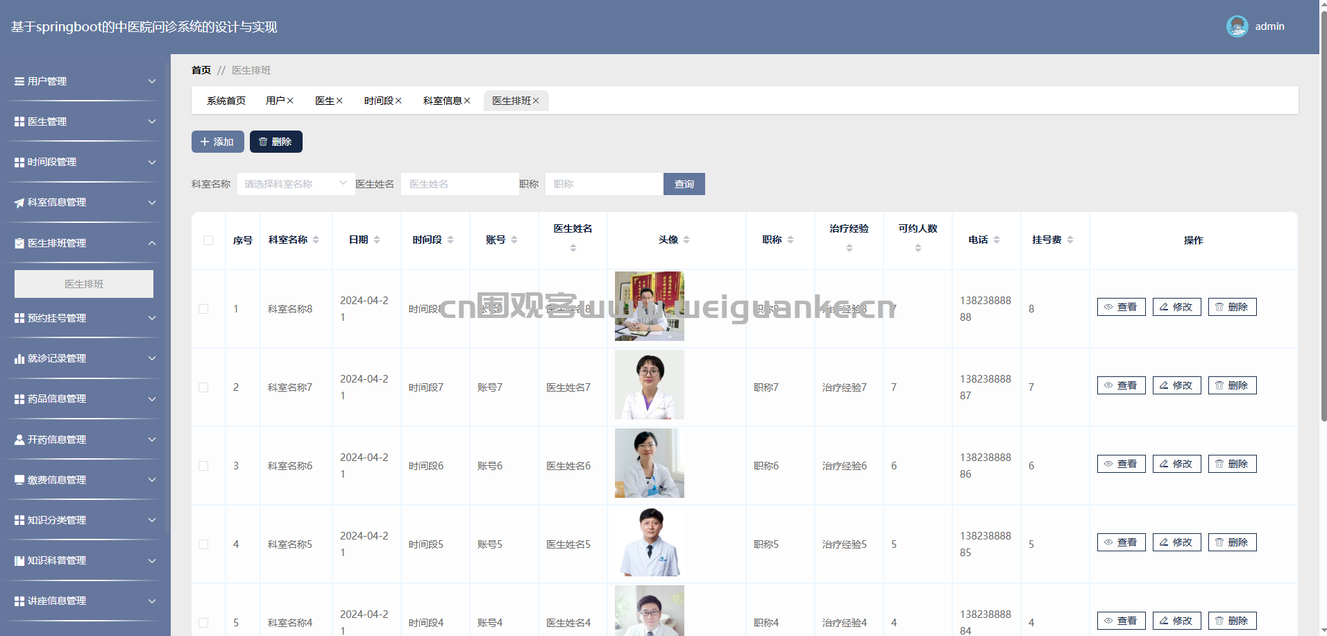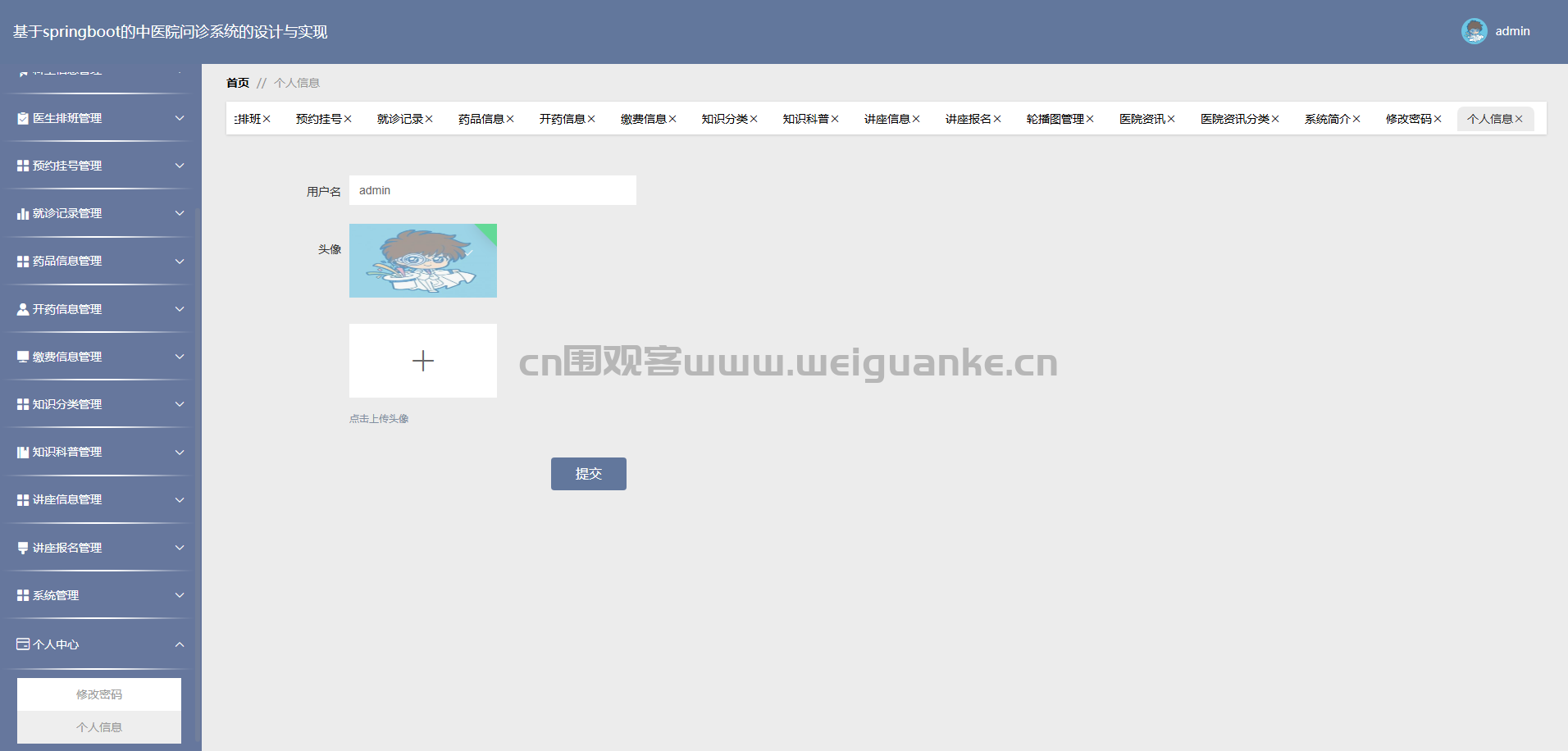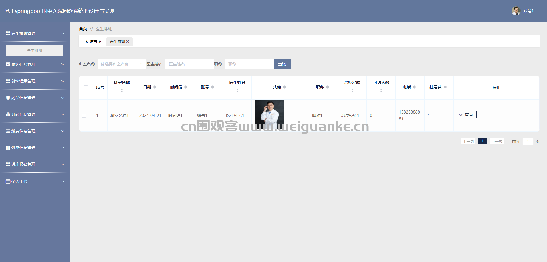基于SpringBoot+Vue的中医院问诊系统,实现科室排班、预约挂号、在线问诊、电子处方、缴费、知识科普、讲座报名全流程信息化,支持患者、医生、管理员多端协同,提升诊疗效率与服务质量。
