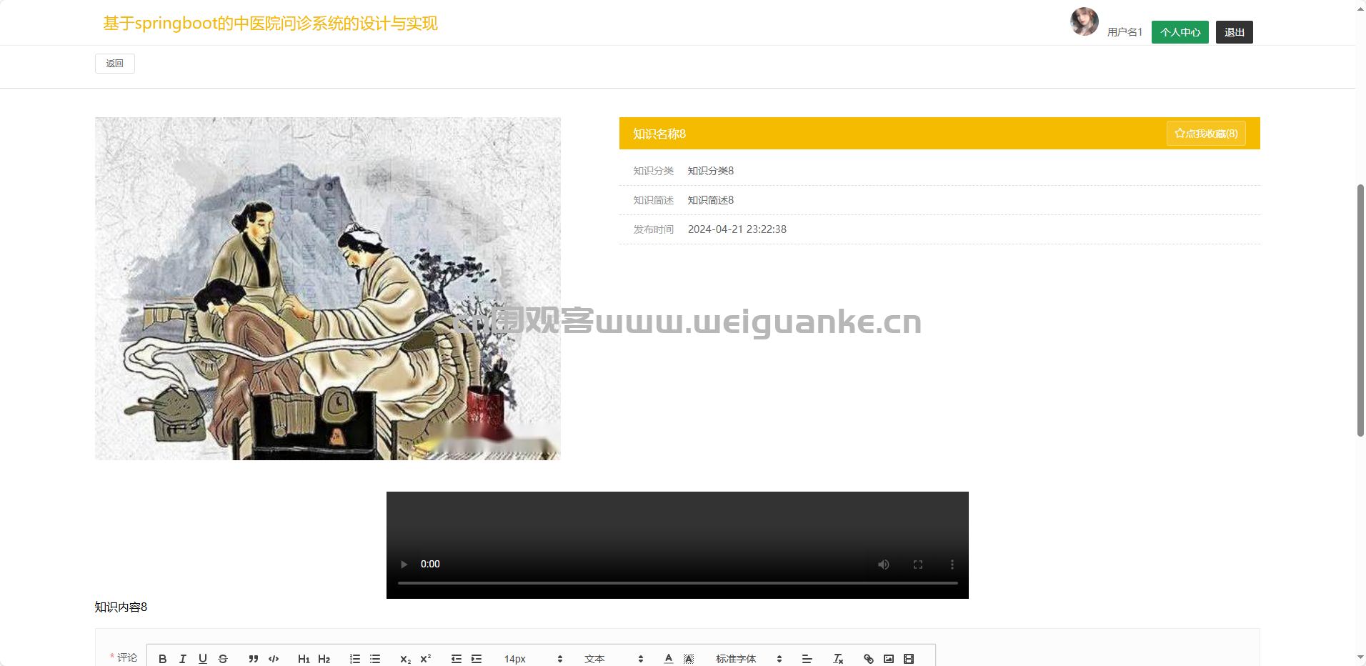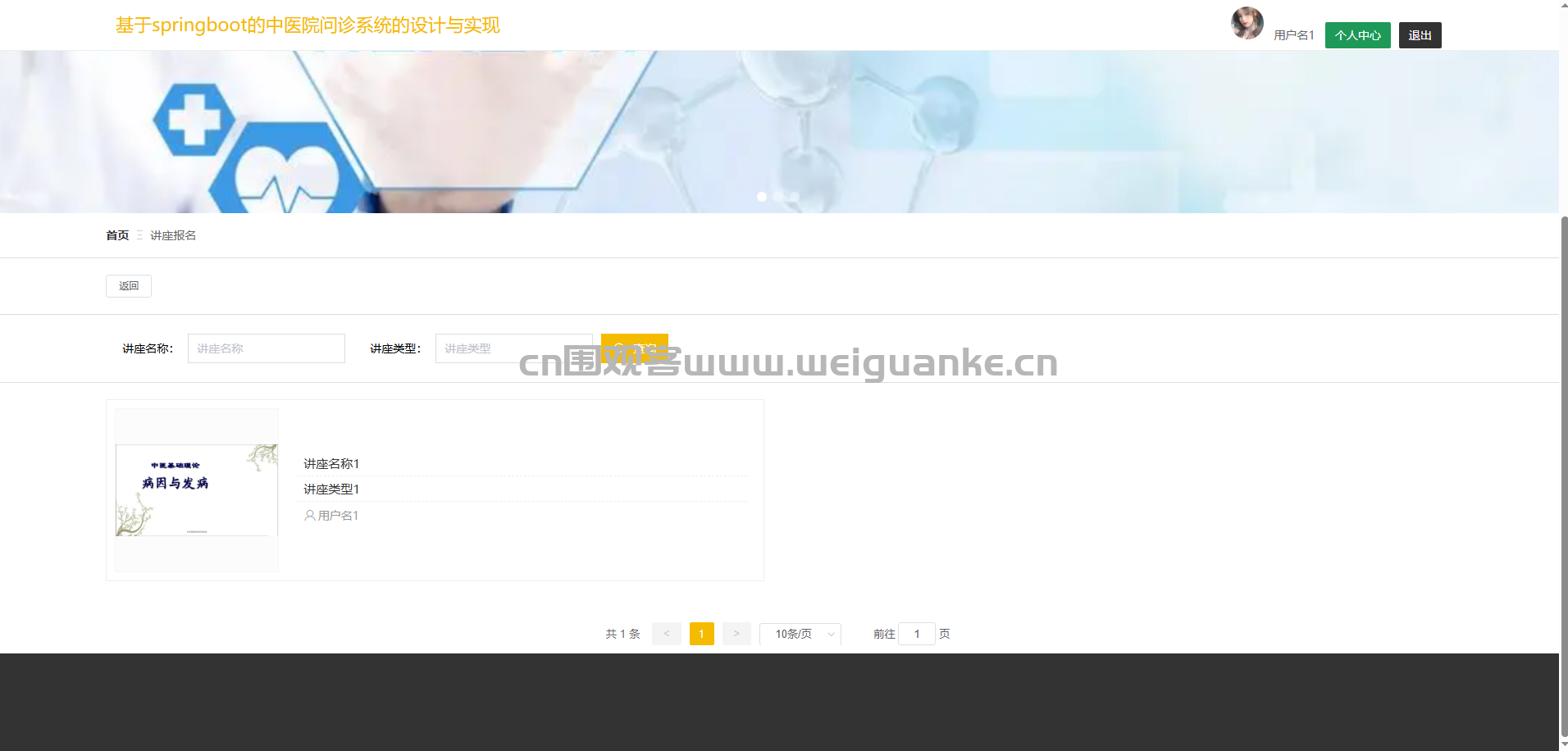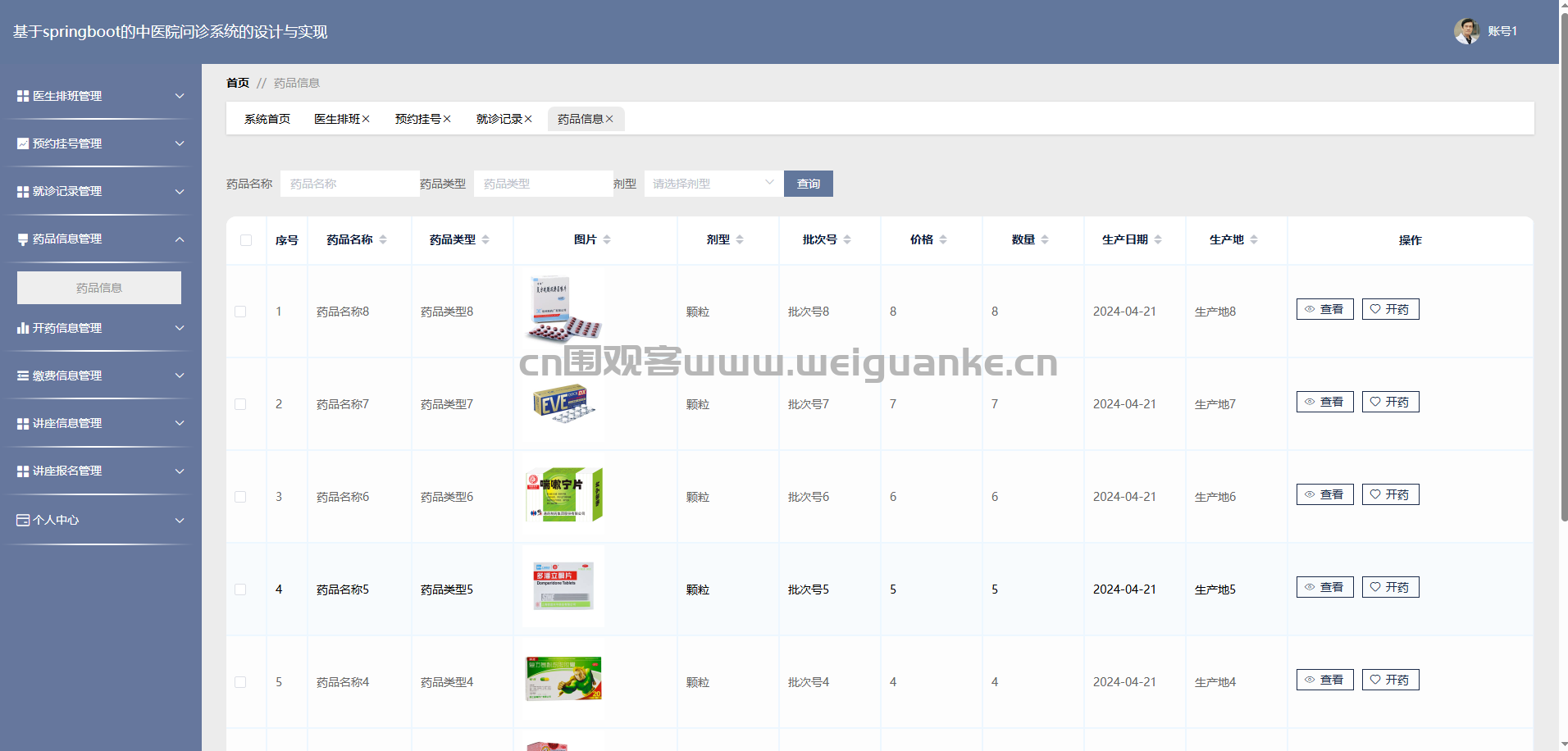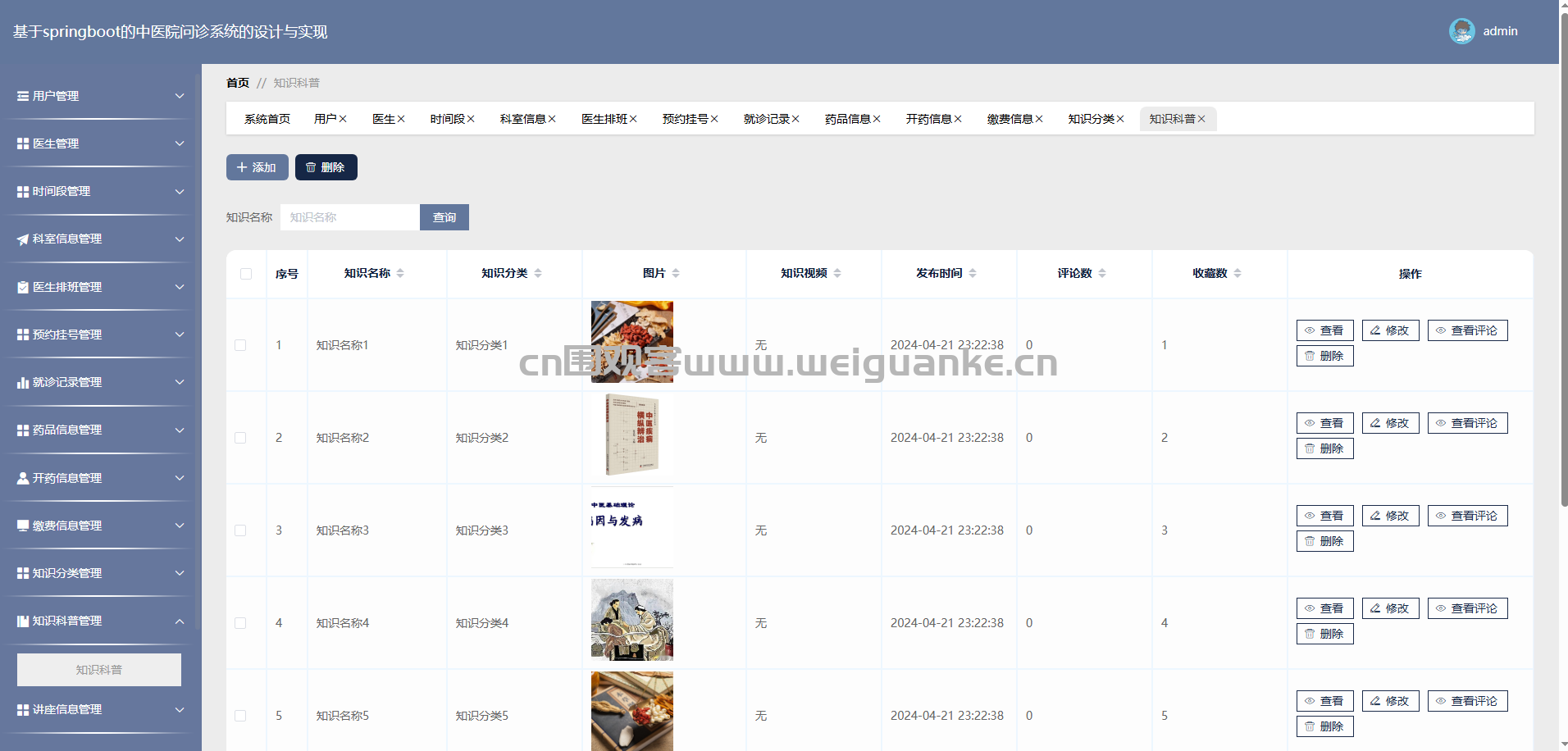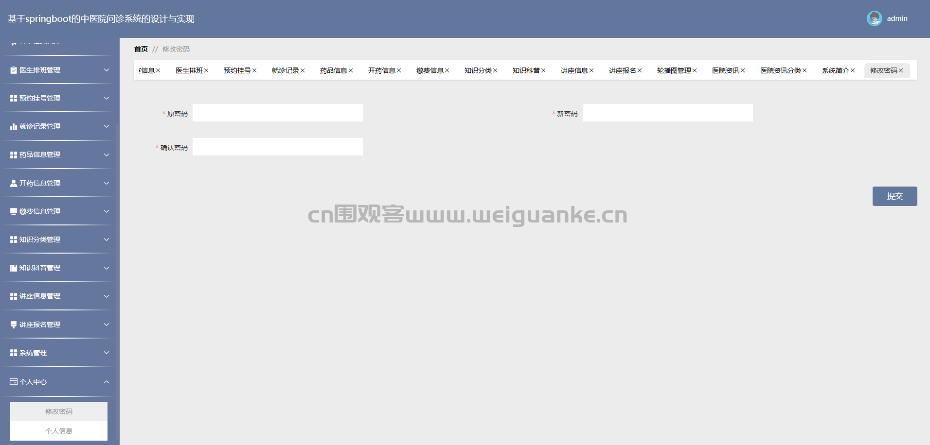 基于SpringBoot+Vue的中医院问诊系统,实现科室排班、预约挂号、在线问诊、电子处方、缴费、知识科普、讲座报名全流程信息化,支持患者、医生、管理员多端协同,提升诊疗效率与服务质量。