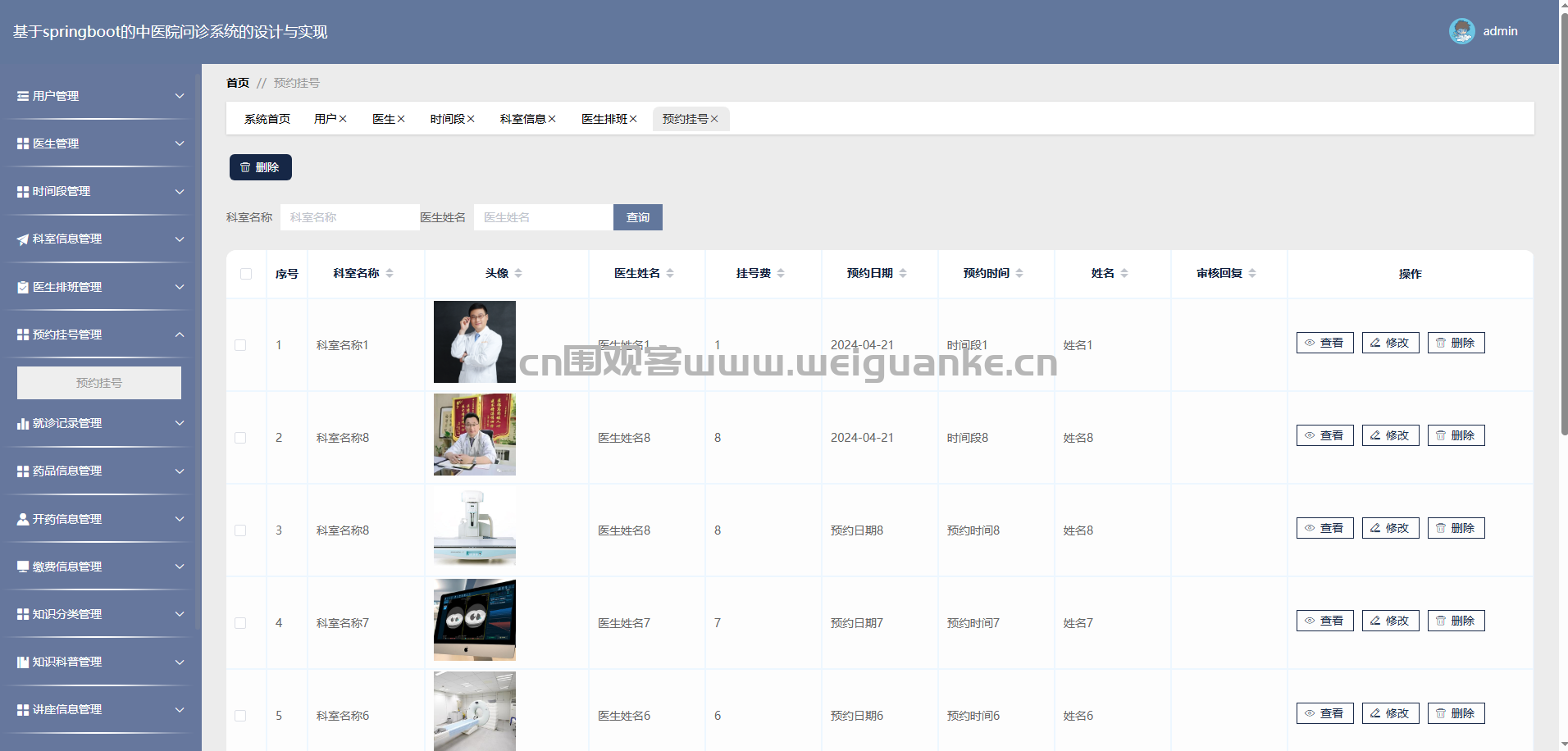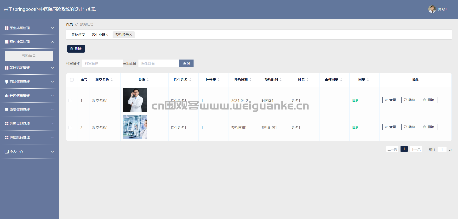 预约挂号管理:查看、调整、取消、删除预约记录。