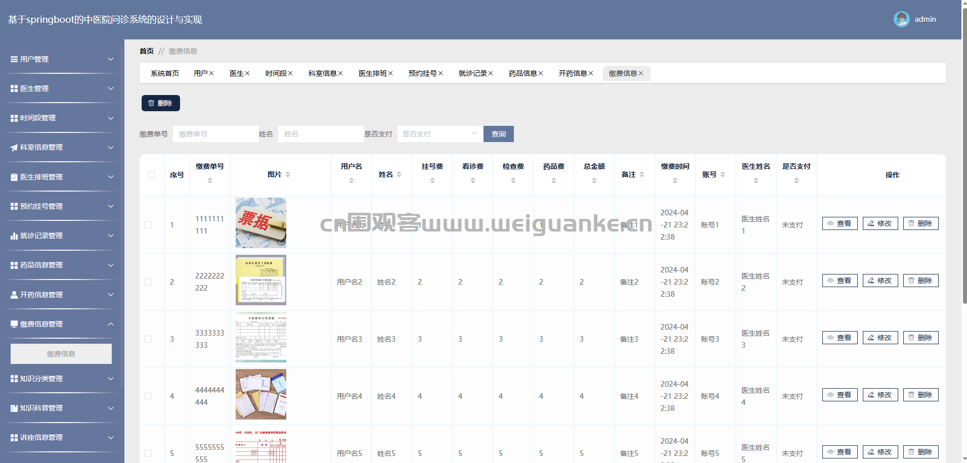 缴费信息管理:新增、修改、删除、查询缴费单据。