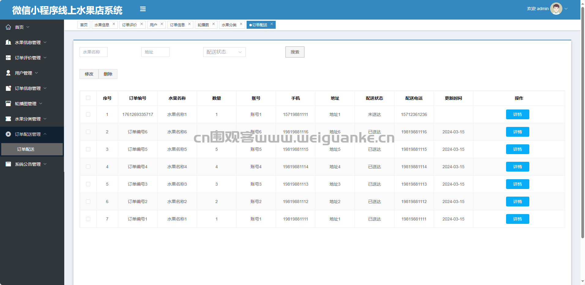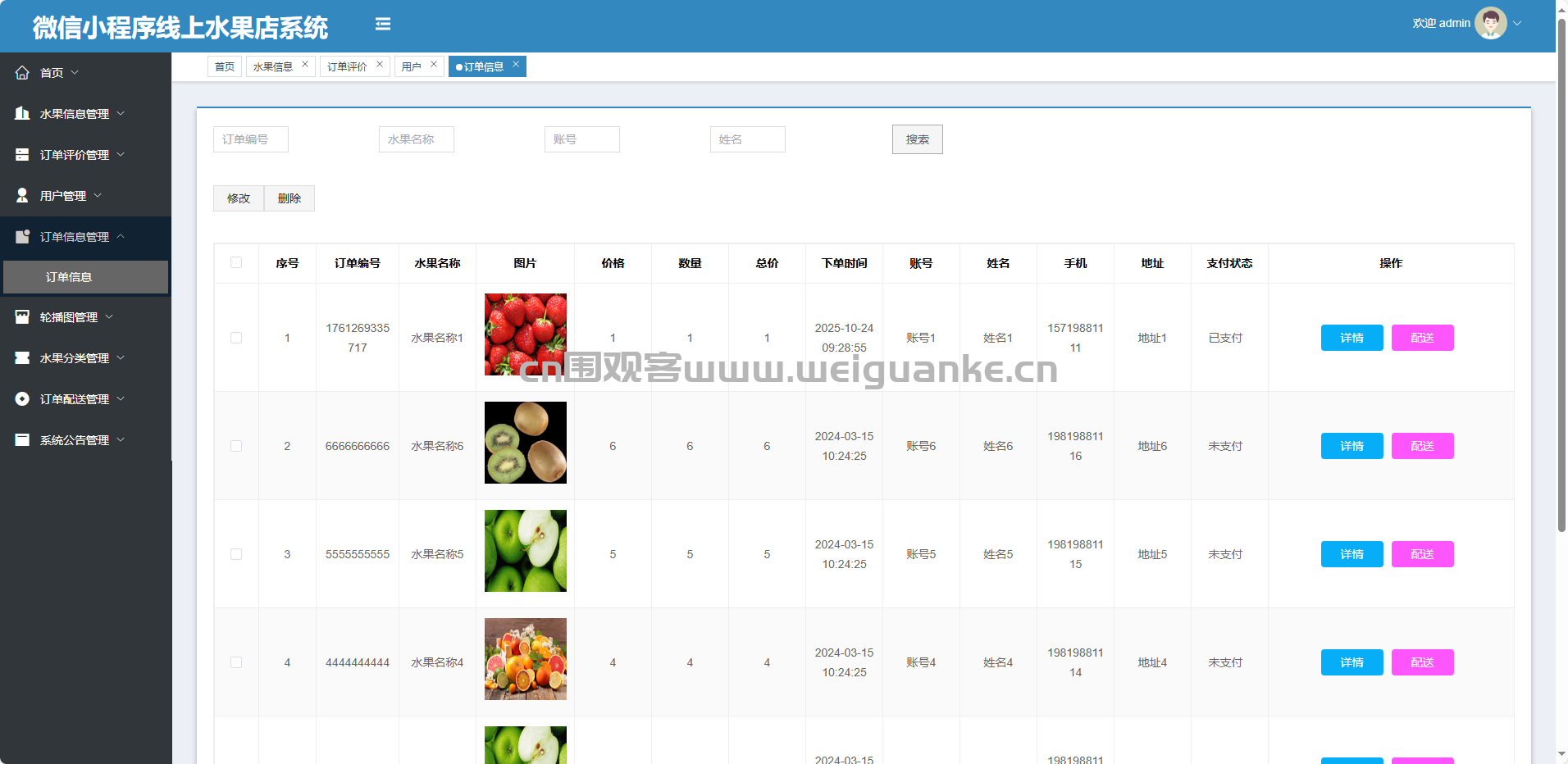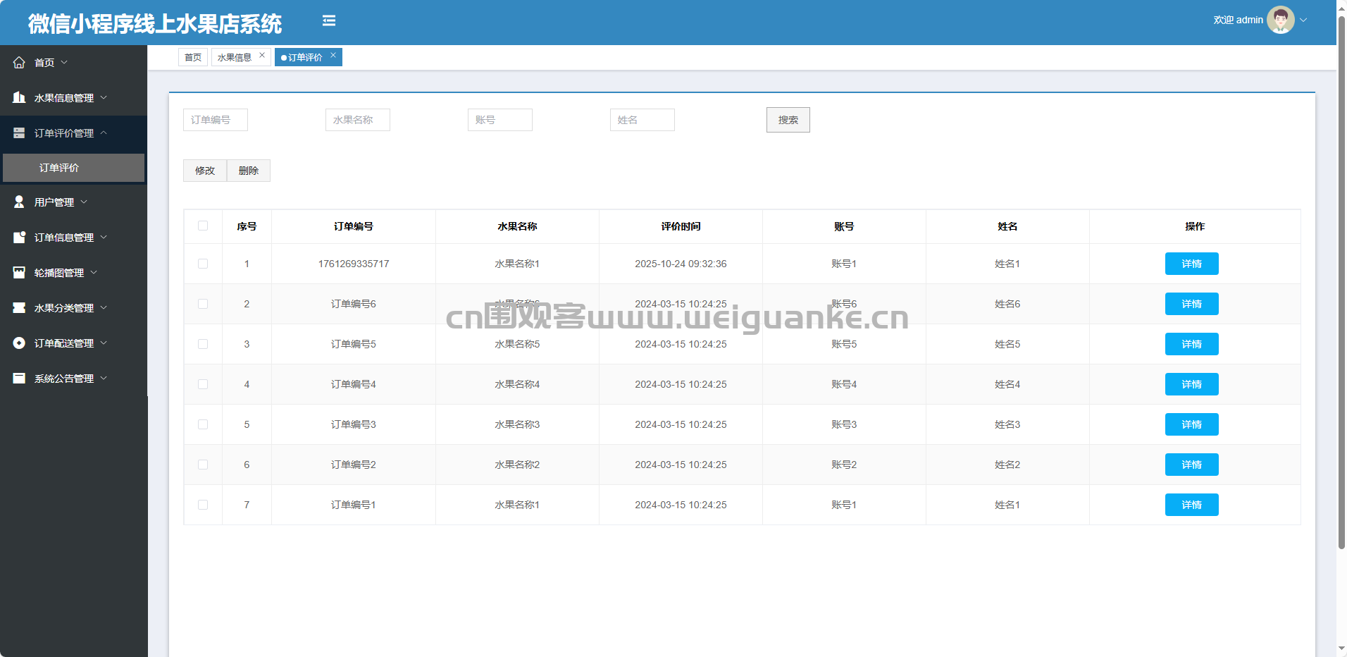 基于SpringBoot+Vue+微信小程序的线上水果店系统,实现水果分类展示、下单支付、配送跟踪、评价反馈及后台商品、订单、公告、轮播图全周期管理。