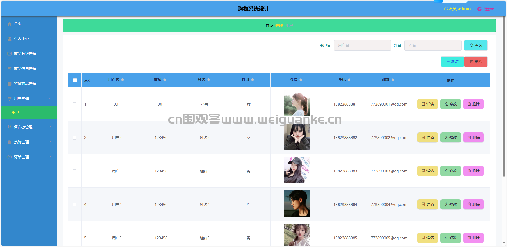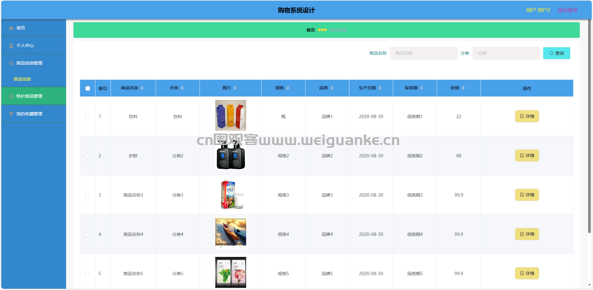 1.个人中心:查看和编辑个人信息,修改登录密码。管理收藏,充值,客服,购物车,订单,留言板信息。