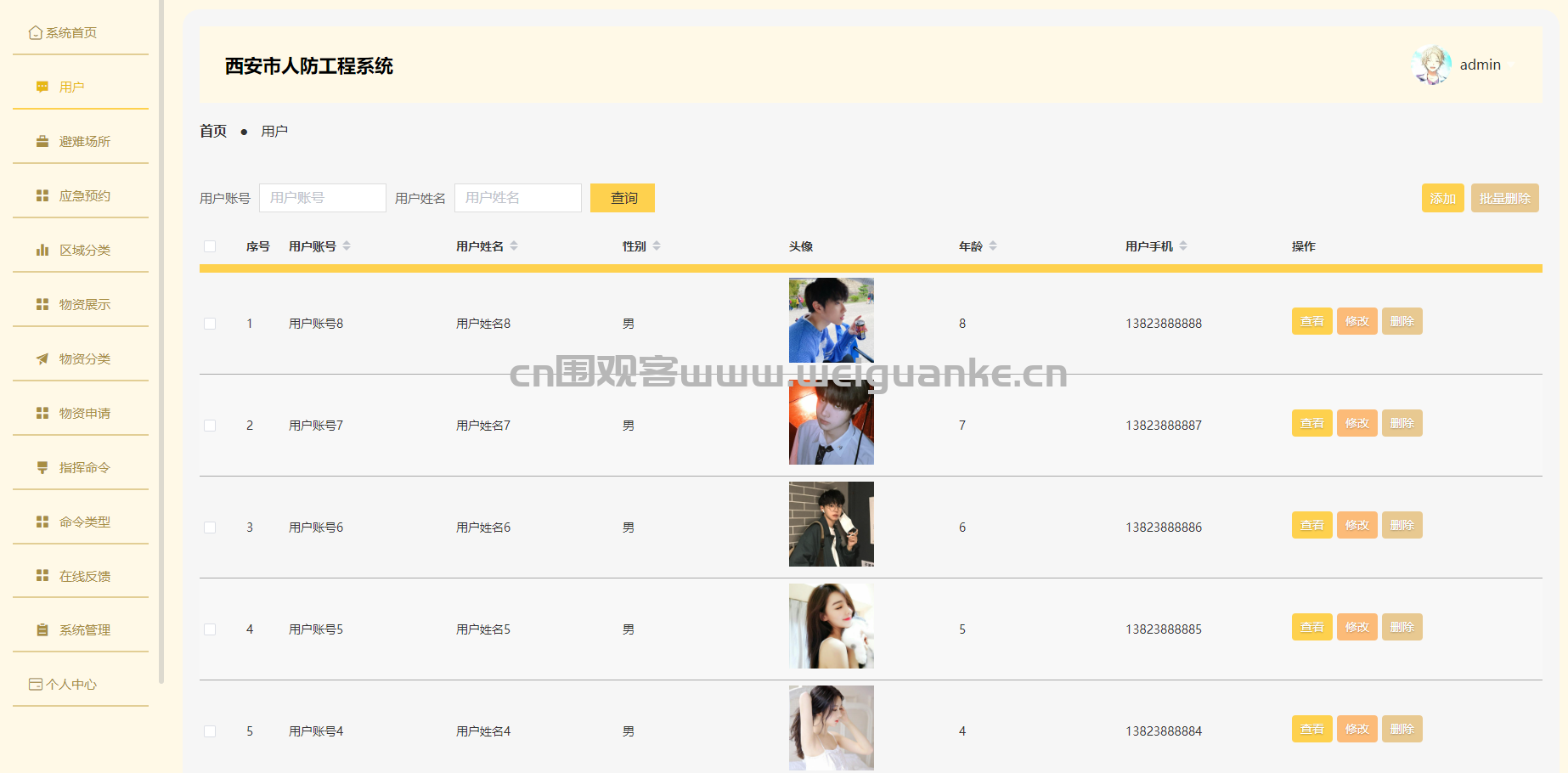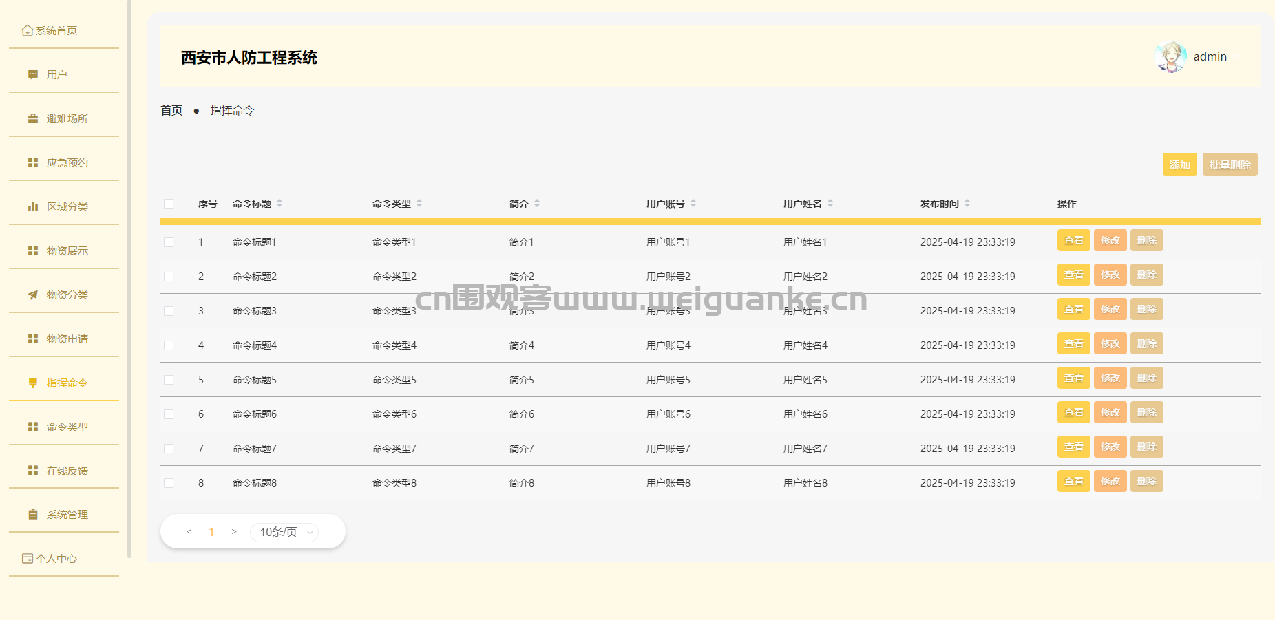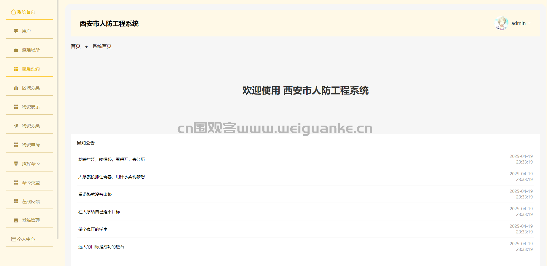 – 系统首页:展示平台的整体运行情况,包括用户数量、避难场所使用情况、物资储备情况、应急预约数量等统计数据,方便管理员快速了解平台的运营状况。