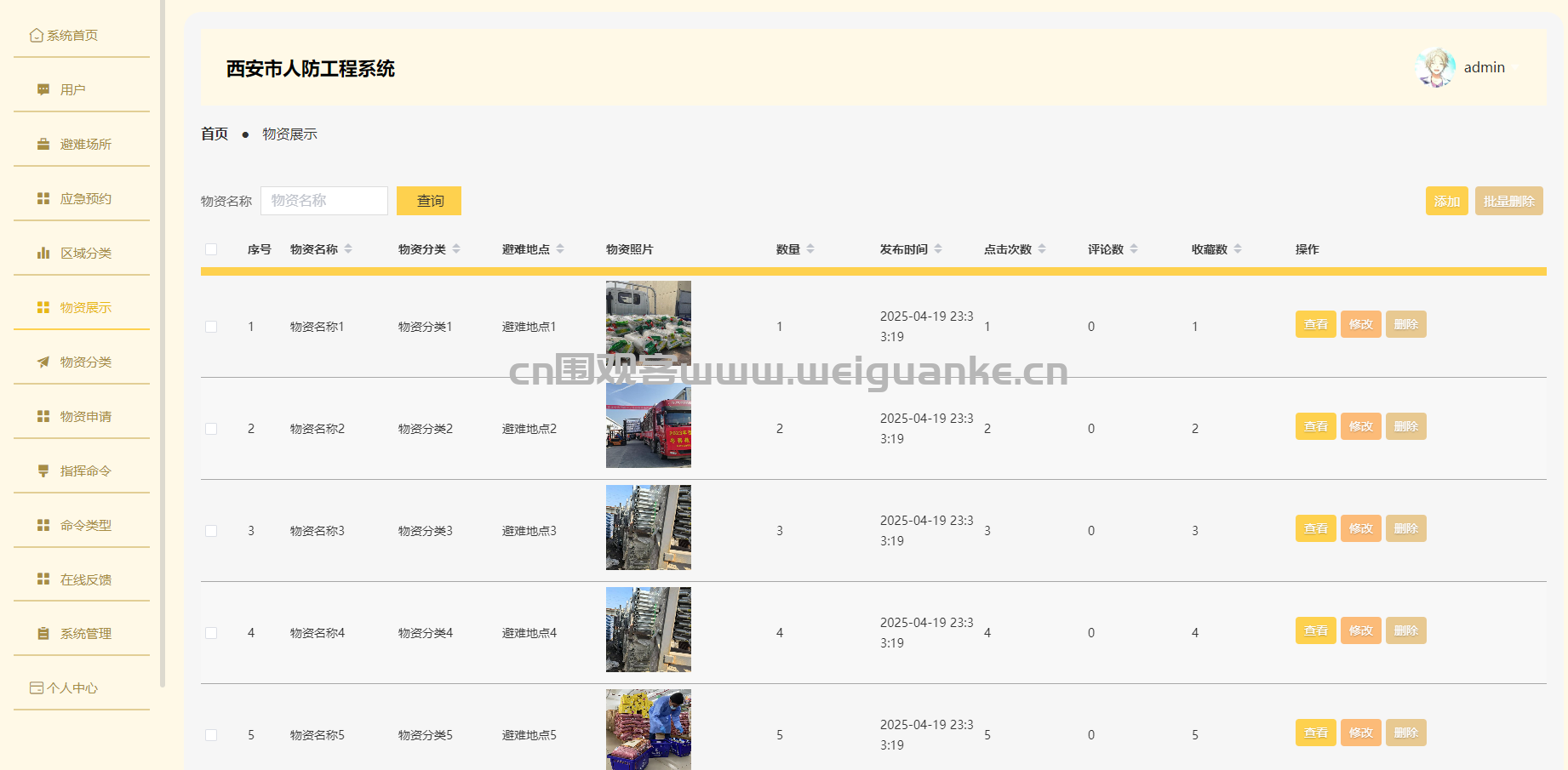 – 物资展示:管理展示在平台上的应急物资信息,包括物资的新增、编辑、删除,维护物资的种类、数量、用途等信息,确保物资信息的准确性和完整性。