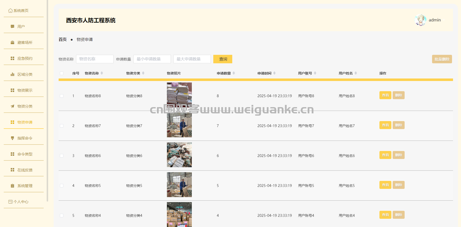 – 物资申请:查看和管理用户的物资申请信息,审批用户的申请,安排物资的发放,确保物资的合理分配和使用。