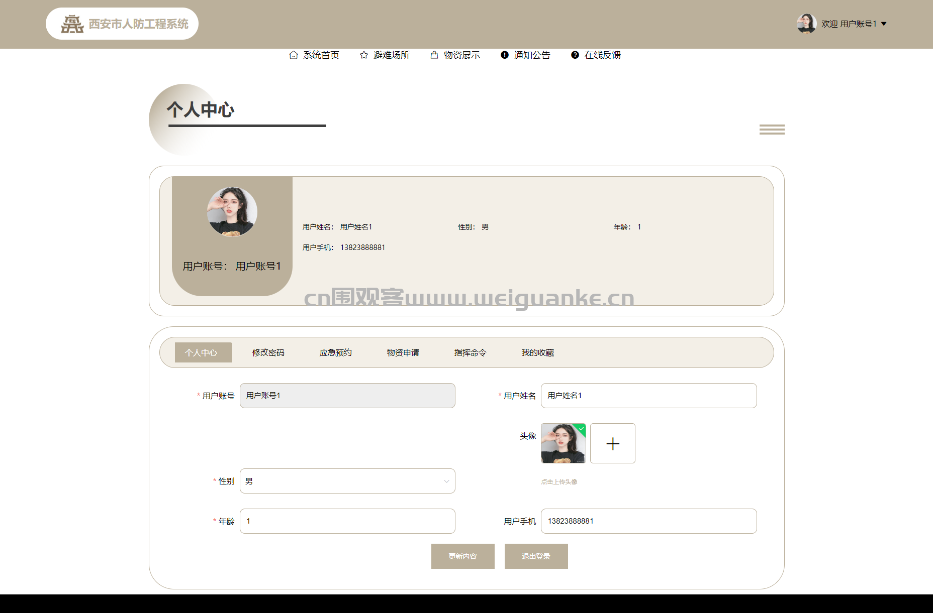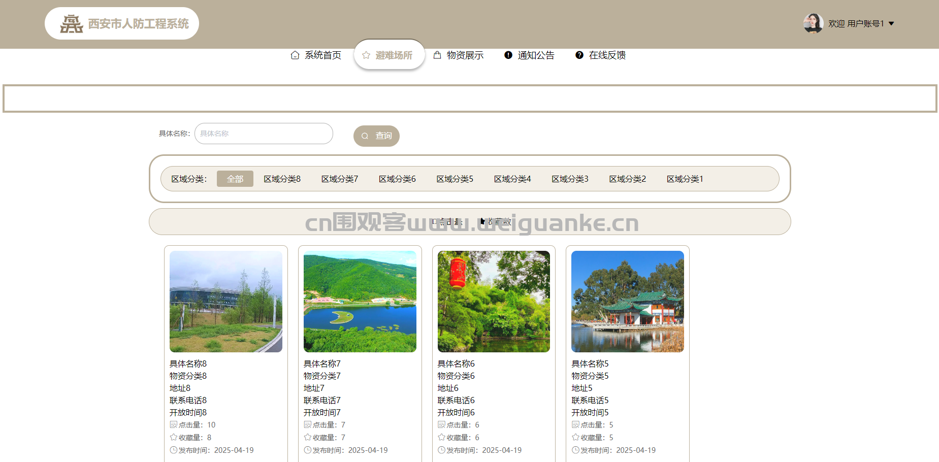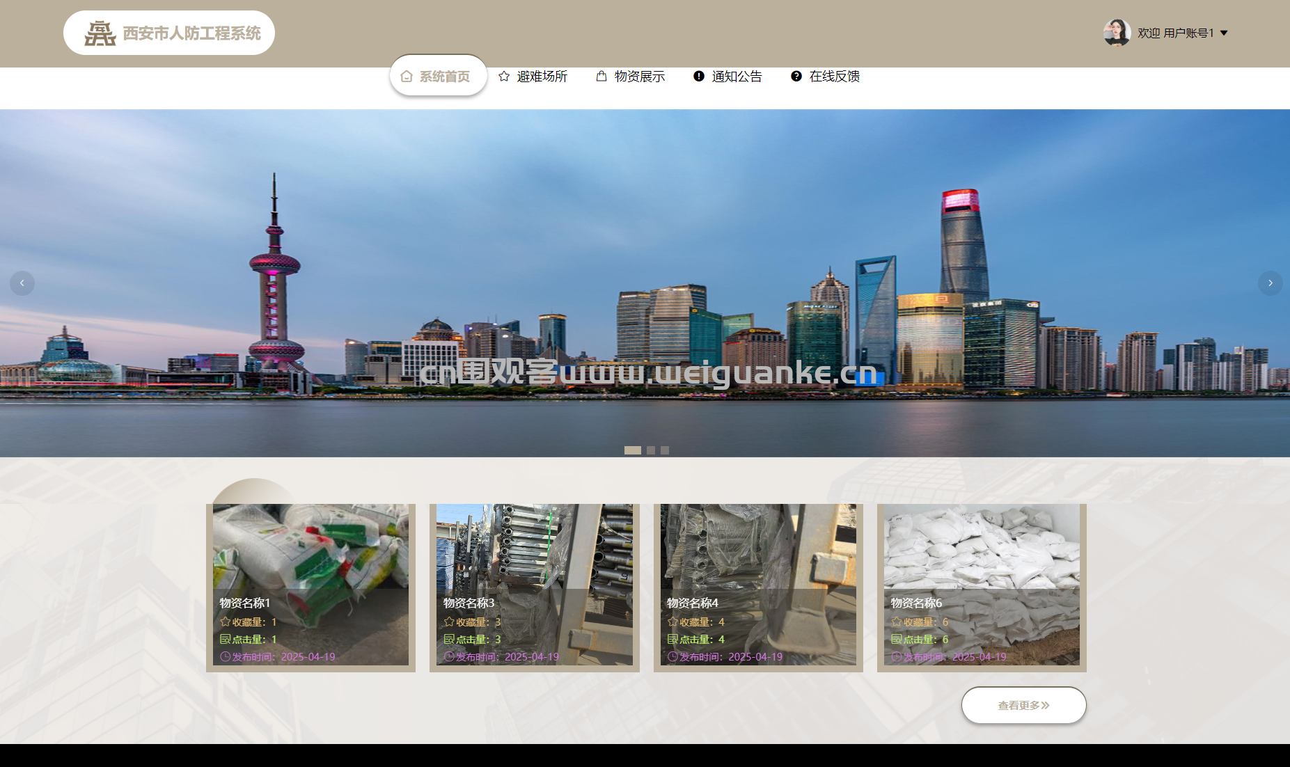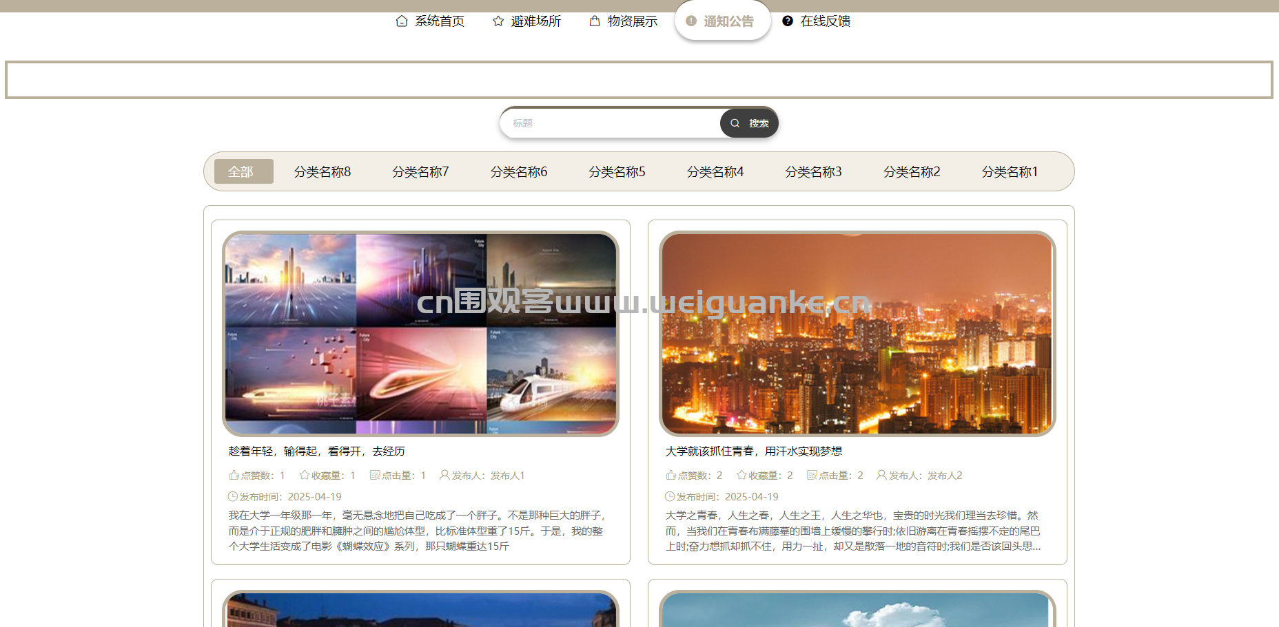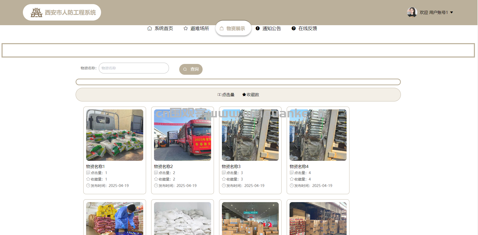 – 系统首页:展示平台的核心功能和重要信息,包括避难场所、物资展示、通知公告等模块的入口,方便用户快速进入各个功能页面。
