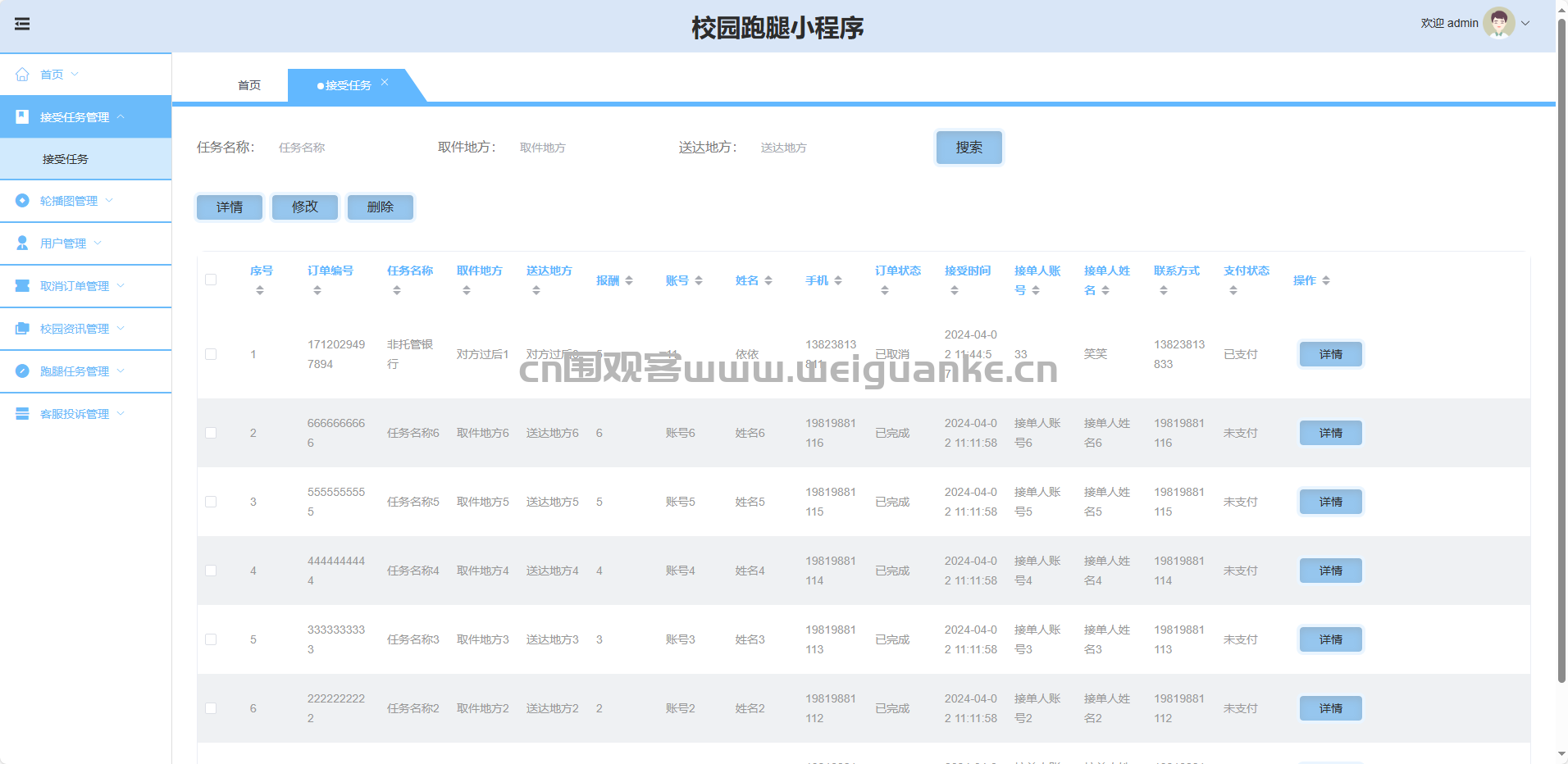 跑腿任务管理:查看、删除、置顶全部任务。