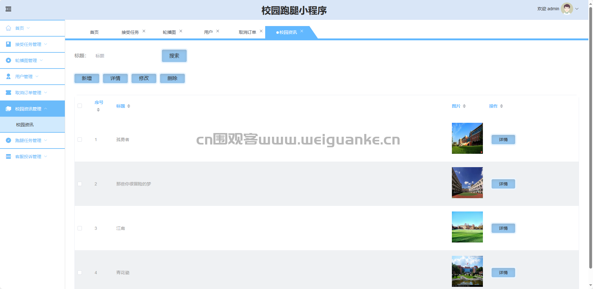 校园资讯管理:新增、修改、删除、查询资讯内容。