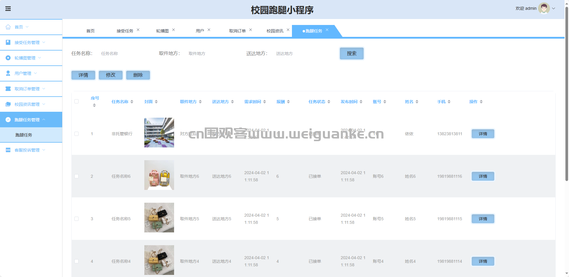 基于SpringBoot+Vue+微信小程序的校园跑腿平台,实现任务发布、接单、取消、投诉及资讯、轮播图后台一体化管理,保障校内跑腿服务高效、有序运行。