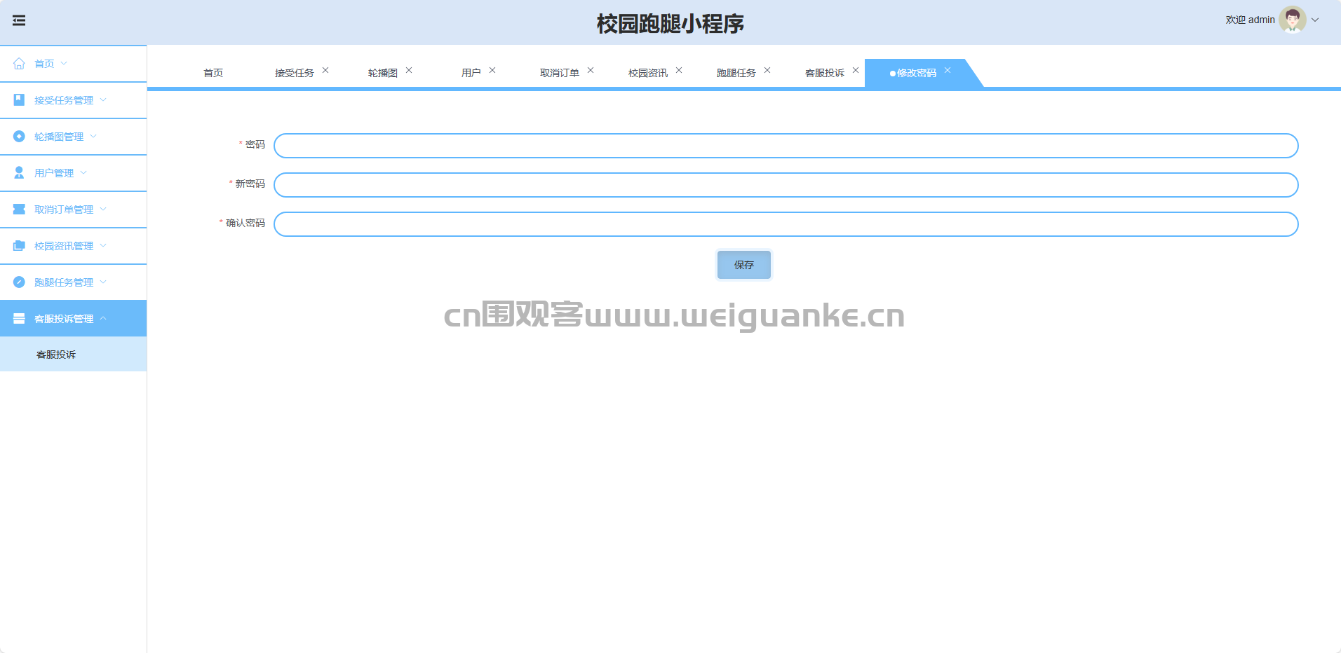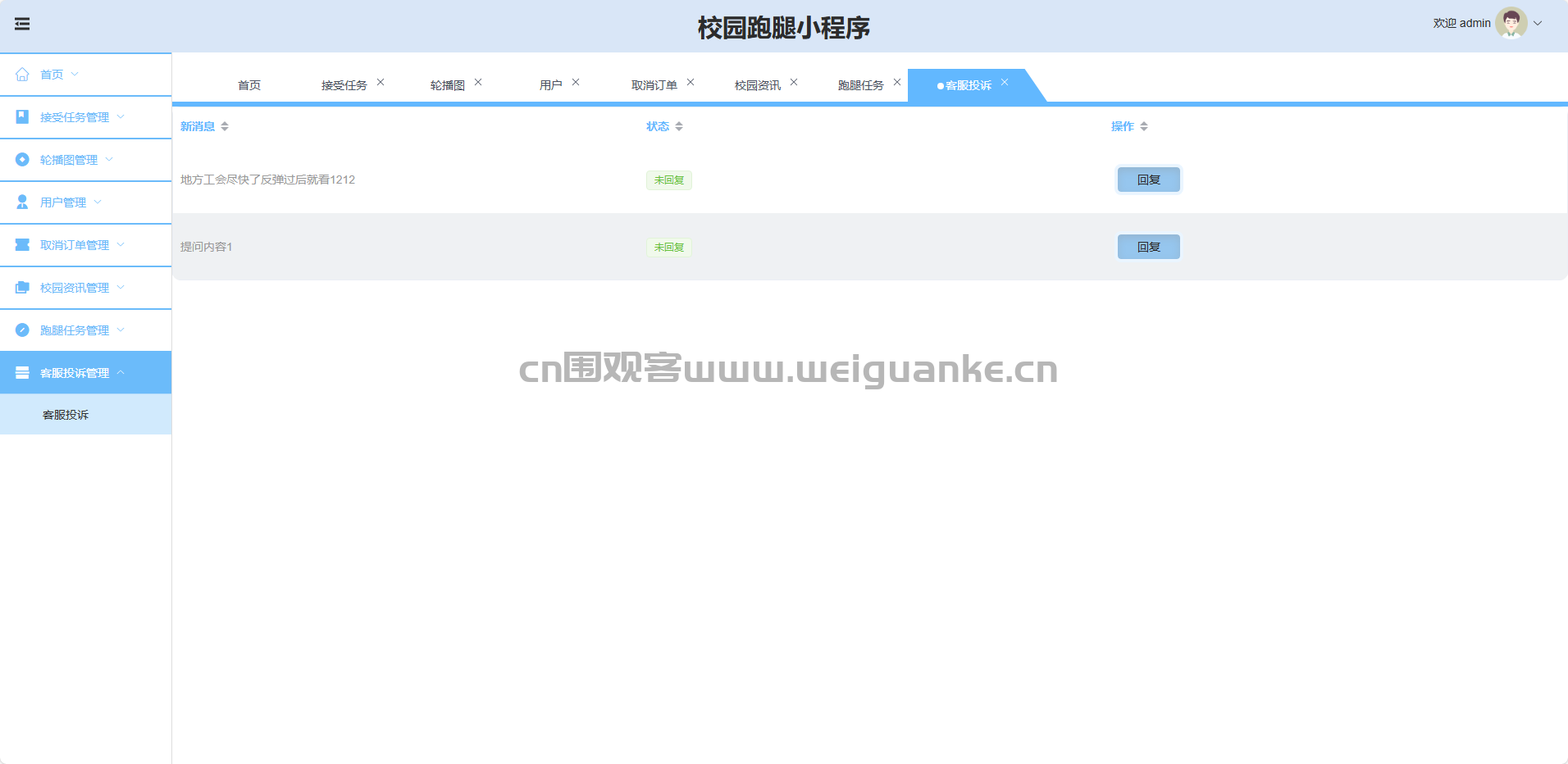 客服投诉管理:查看、处理、删除用户投诉。