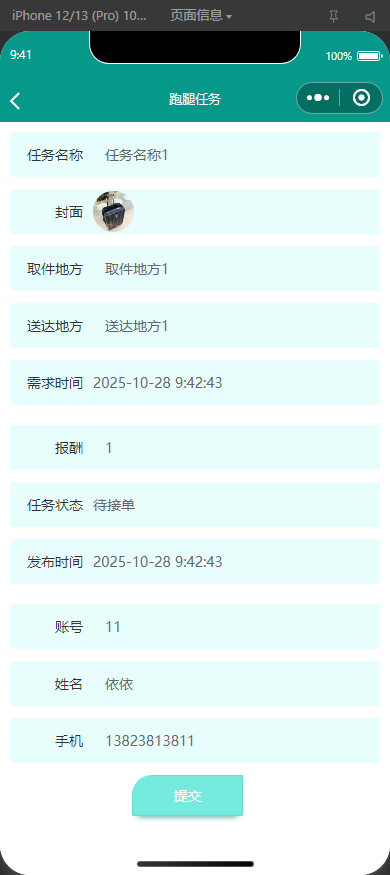 跑腿任务:发布、查看、删除本人发布的任务。