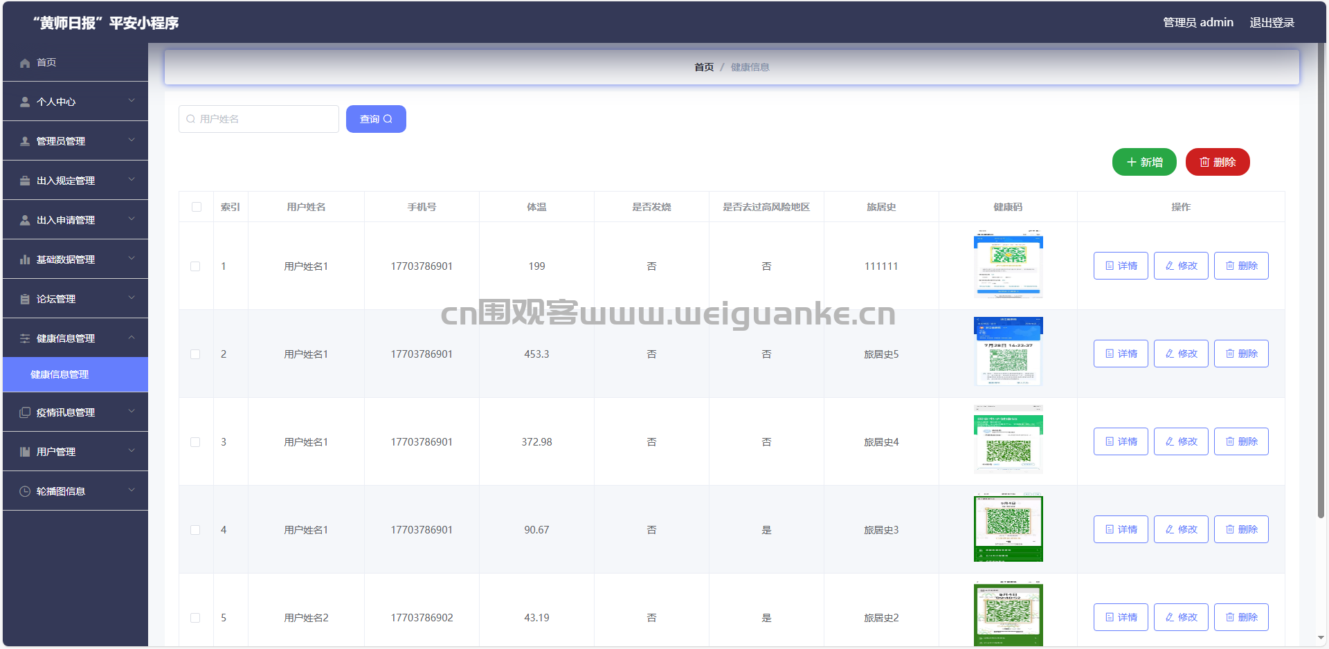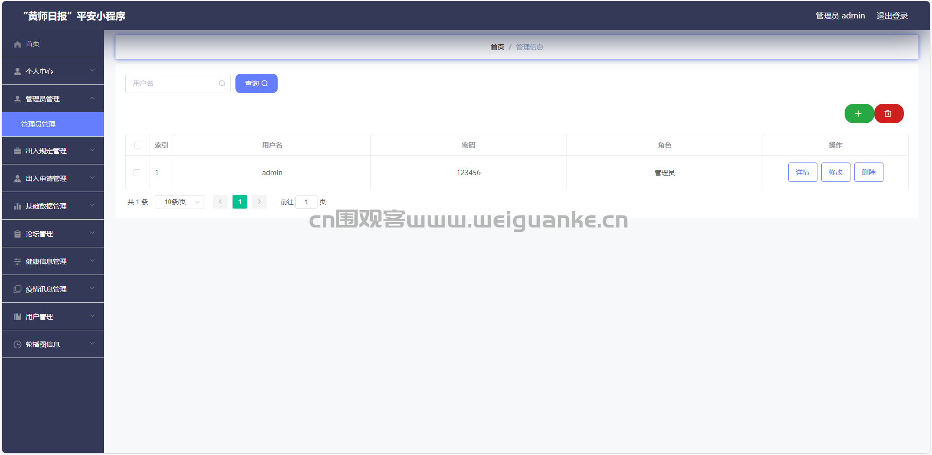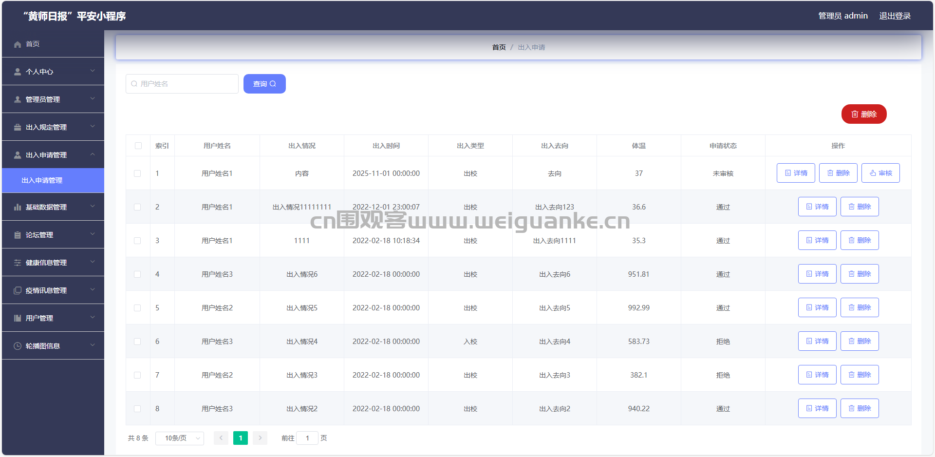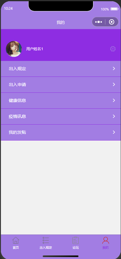 1.个人中心:查看和编辑个人信息,修改登录密码。查看出入申请,健康信息,论坛,疫情信息。