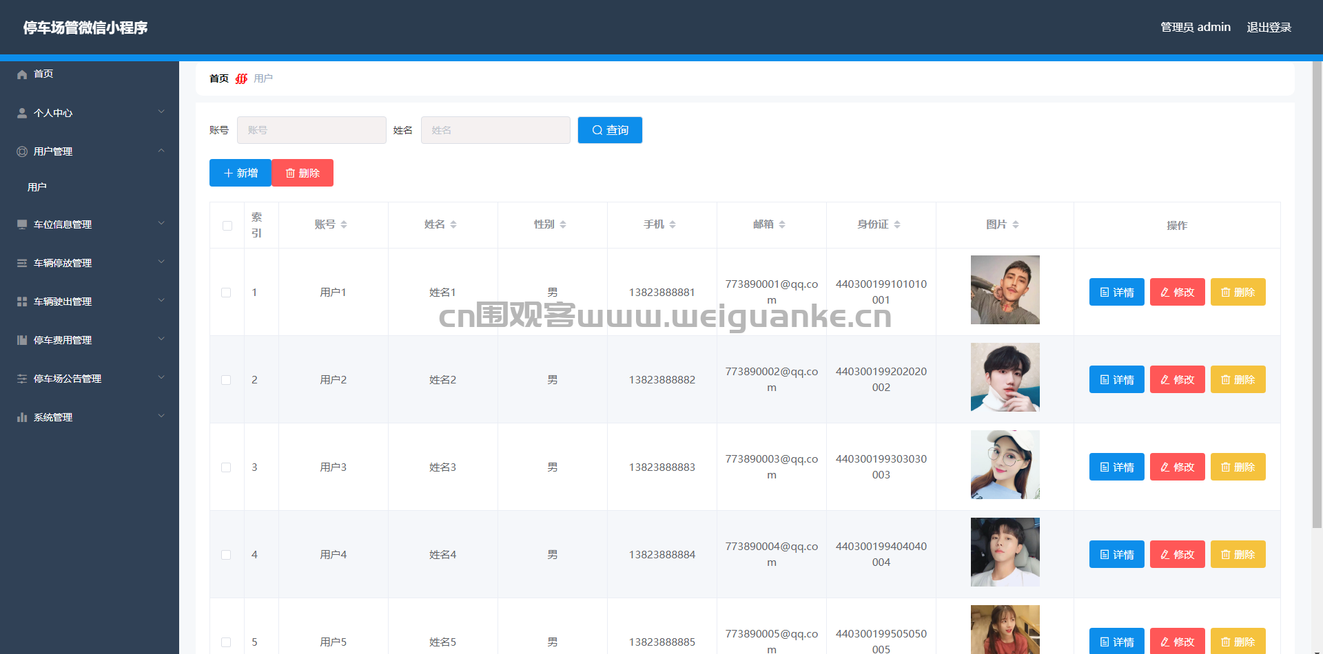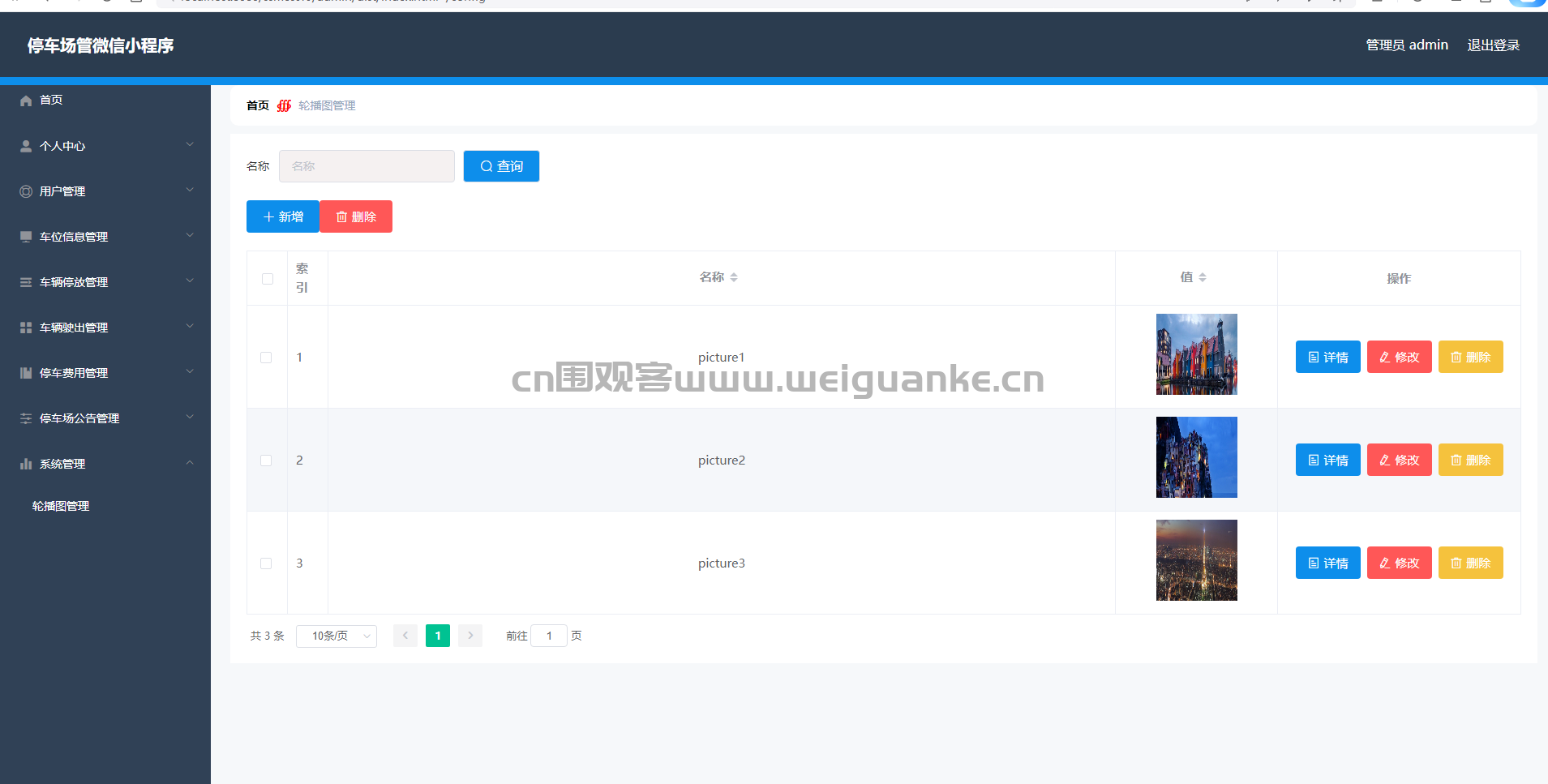 3.车位信息管理:查看、添加、编辑、删除车位信息(车位状态需手动修改)