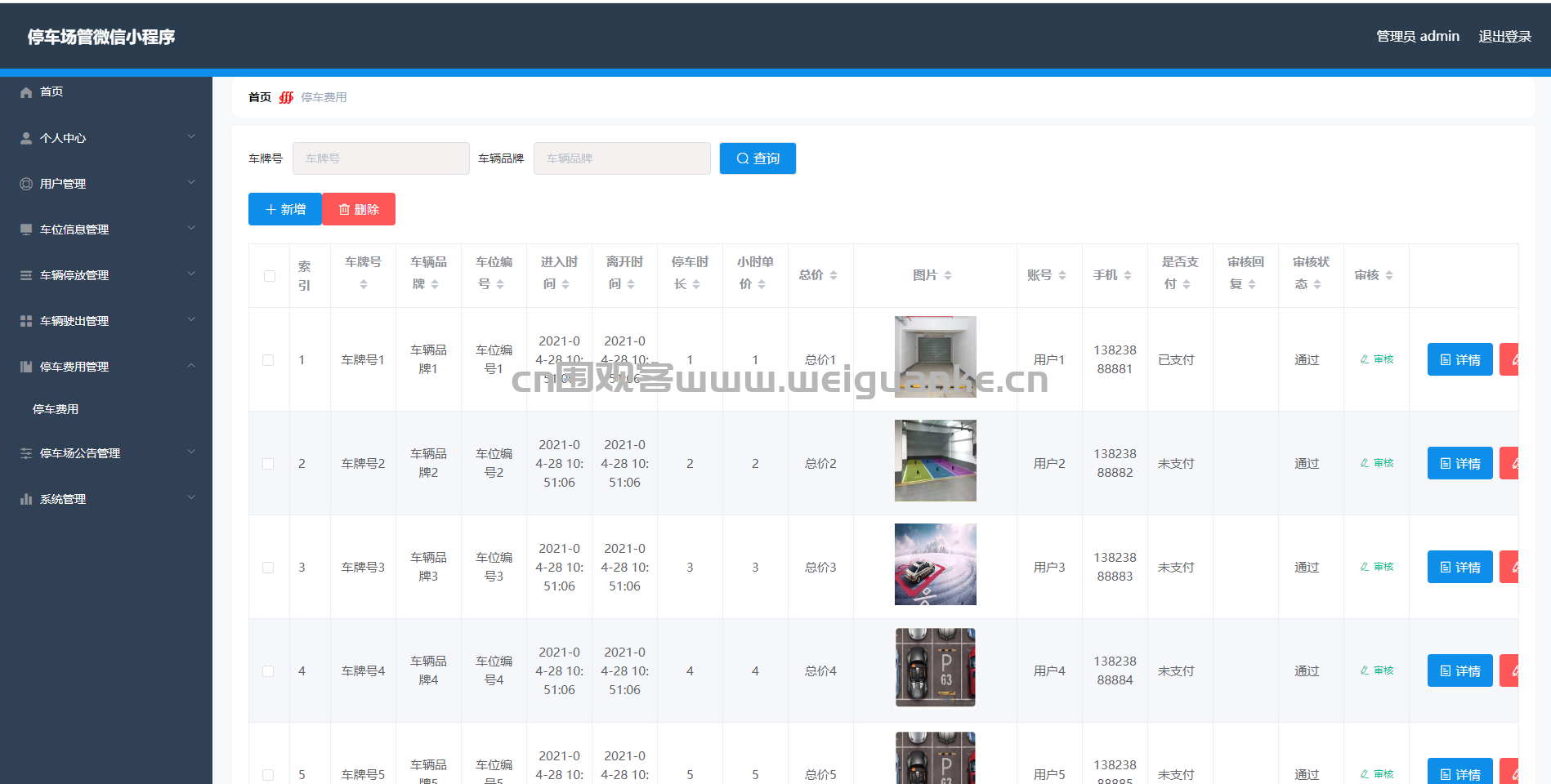 6.停车费用管理:查看、添加、编辑、删除、审核费用信息