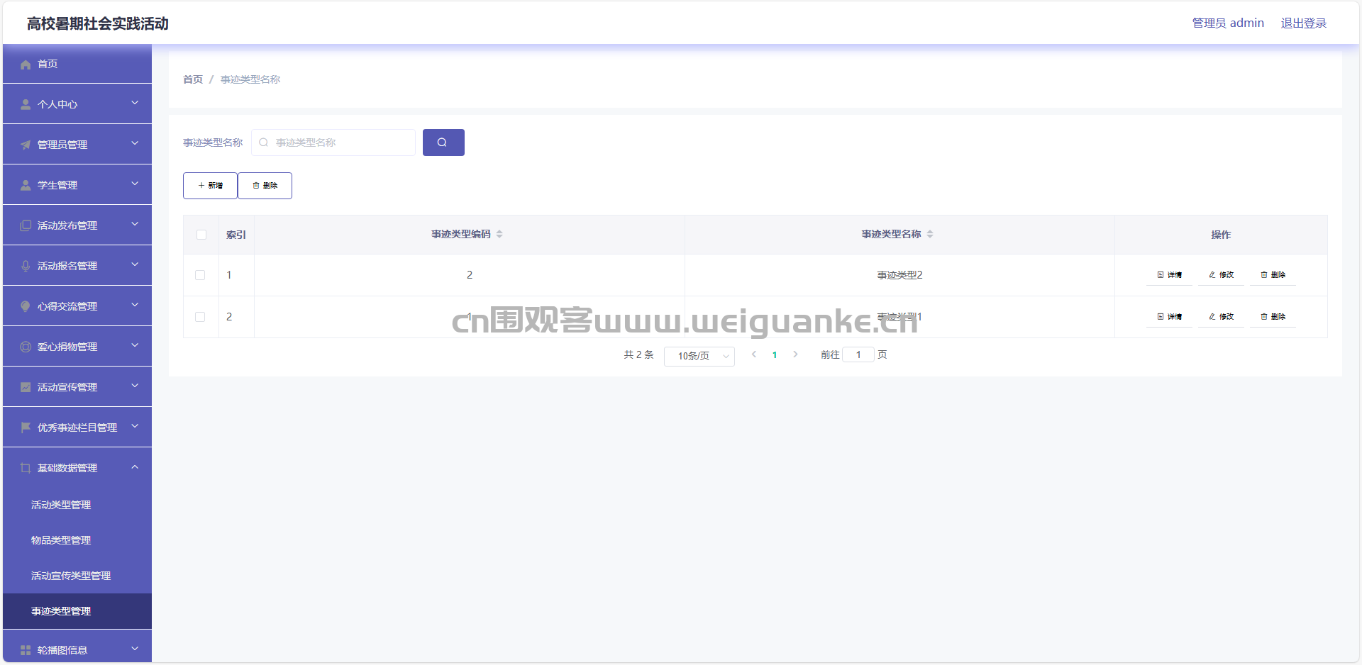 7.事迹类型管理:查看、添加、编辑、删除事迹类型信息