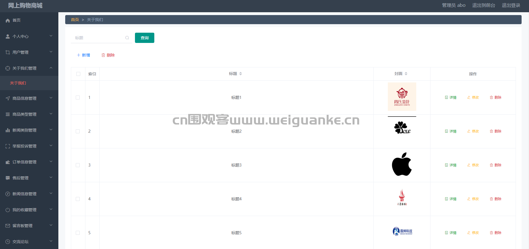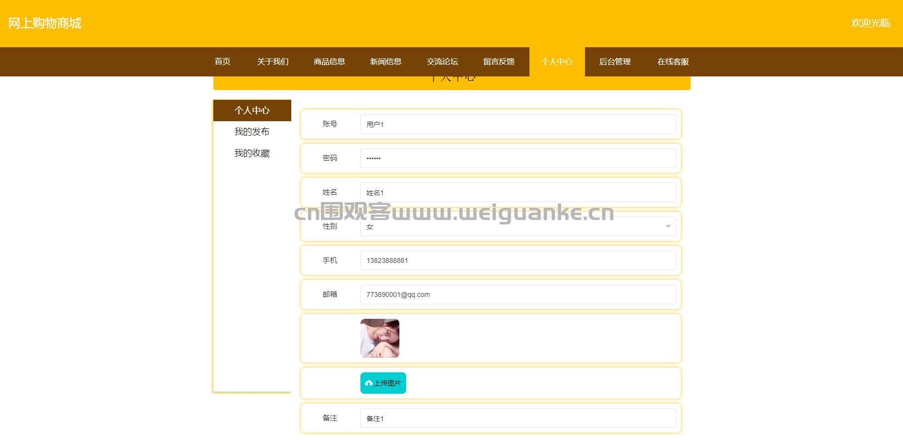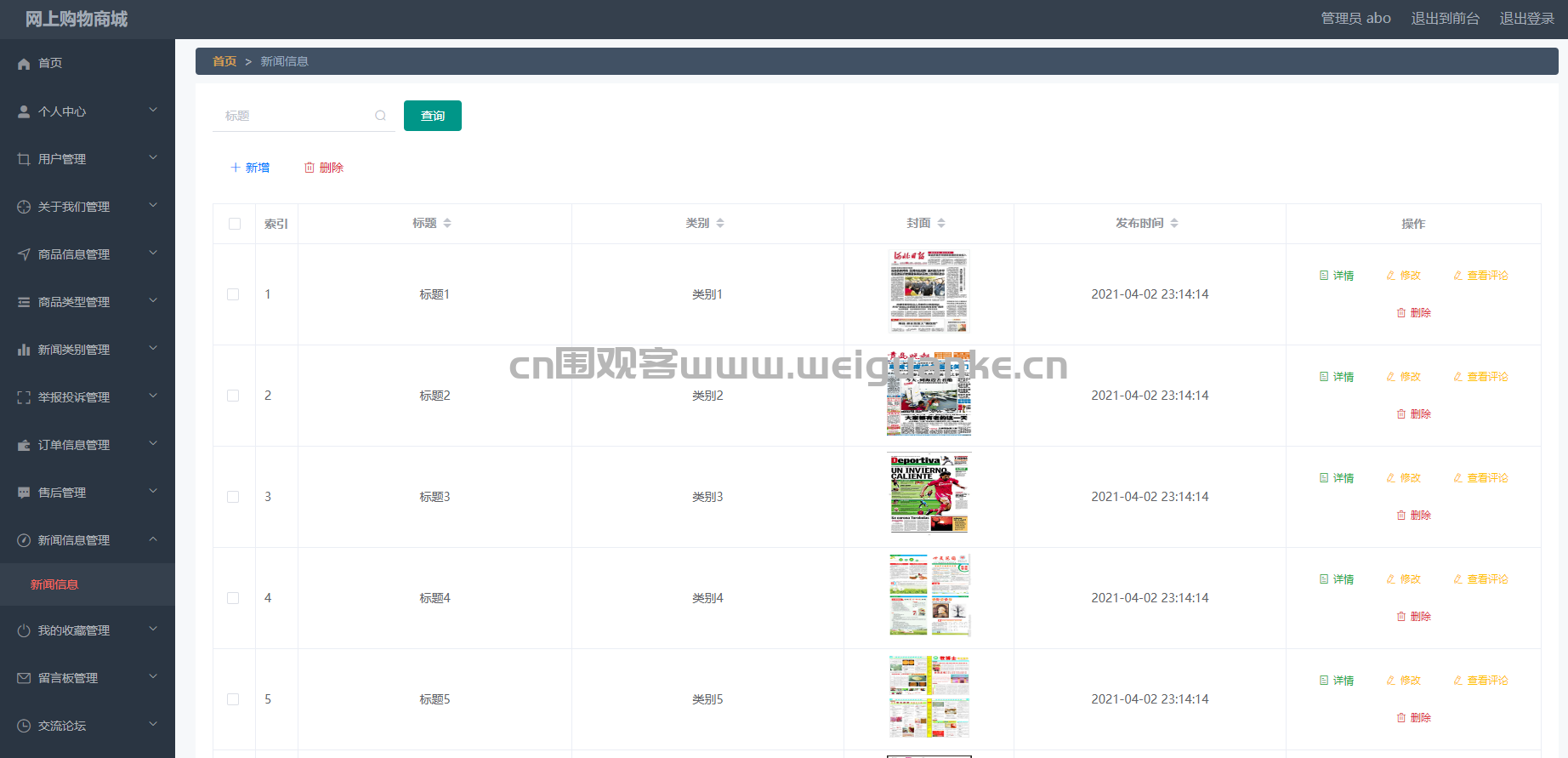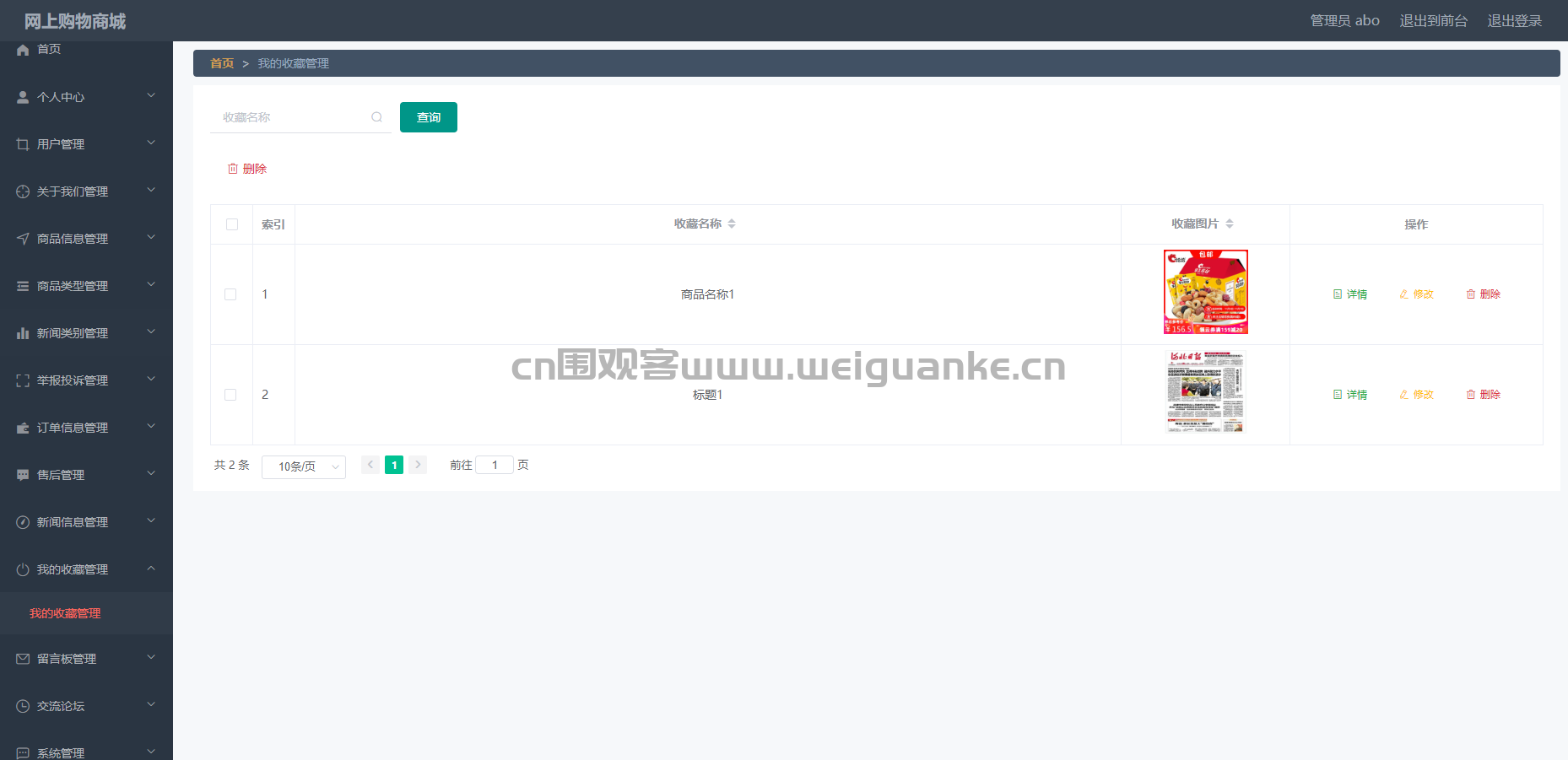 – 功能描述:管理员可以管理自己的收藏内容,包括添加、删除、查看收藏的新闻、商品等。