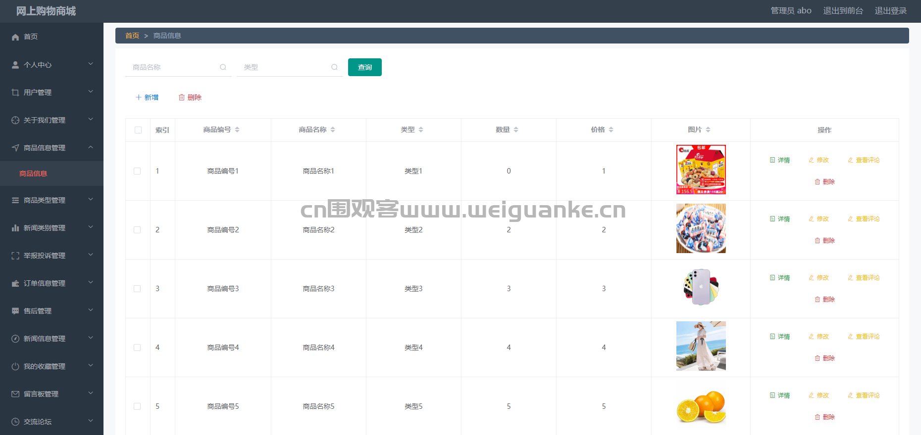 – 功能描述:管理商品的详细信息,包括商品名称、描述、价格、库存、图片等。支持商品的添加、编辑、删除操作。