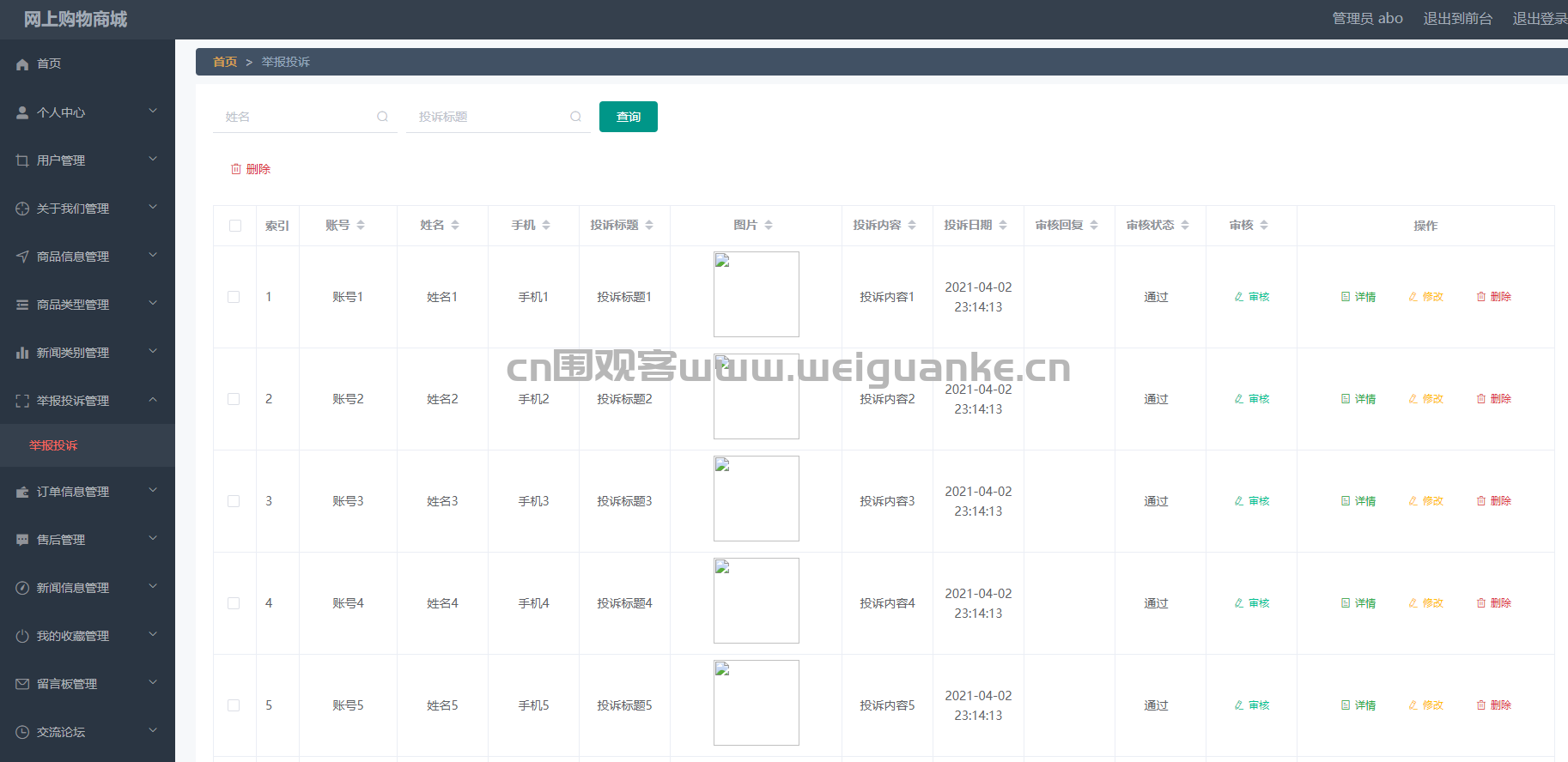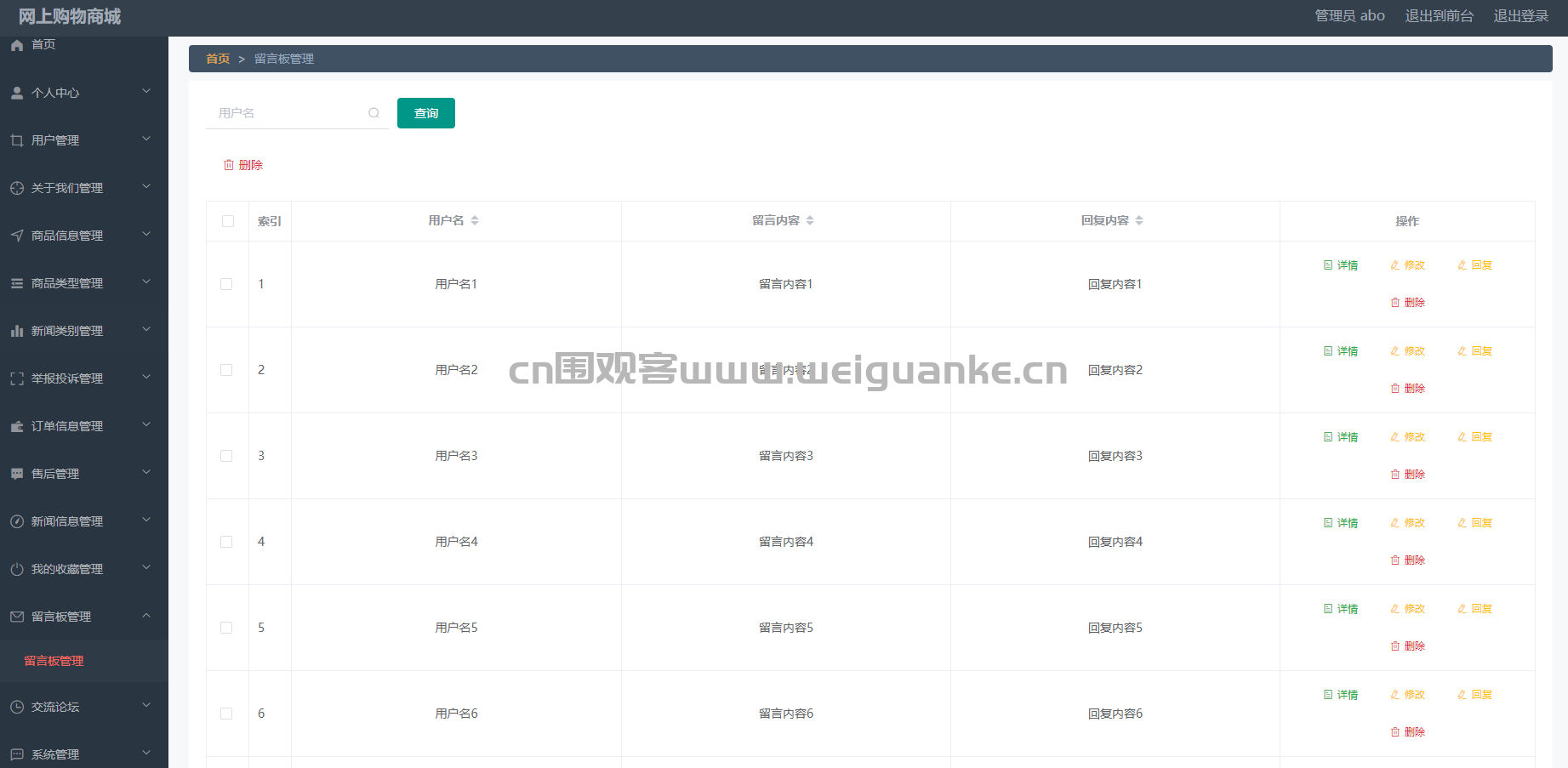 – 功能描述:管理用户在留言板上发布的留言,包括查看留言内容、回复留言、删除留言等。