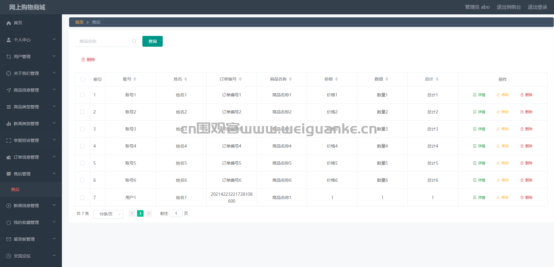– 功能描述:管理所有订单的详细信息,包括订单状态(如待付款、待发货、已发货、已完成等)、订单金额、订单详情等。支持订单的查询、修改、删除操作。