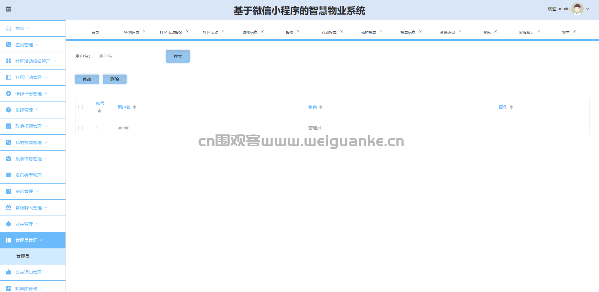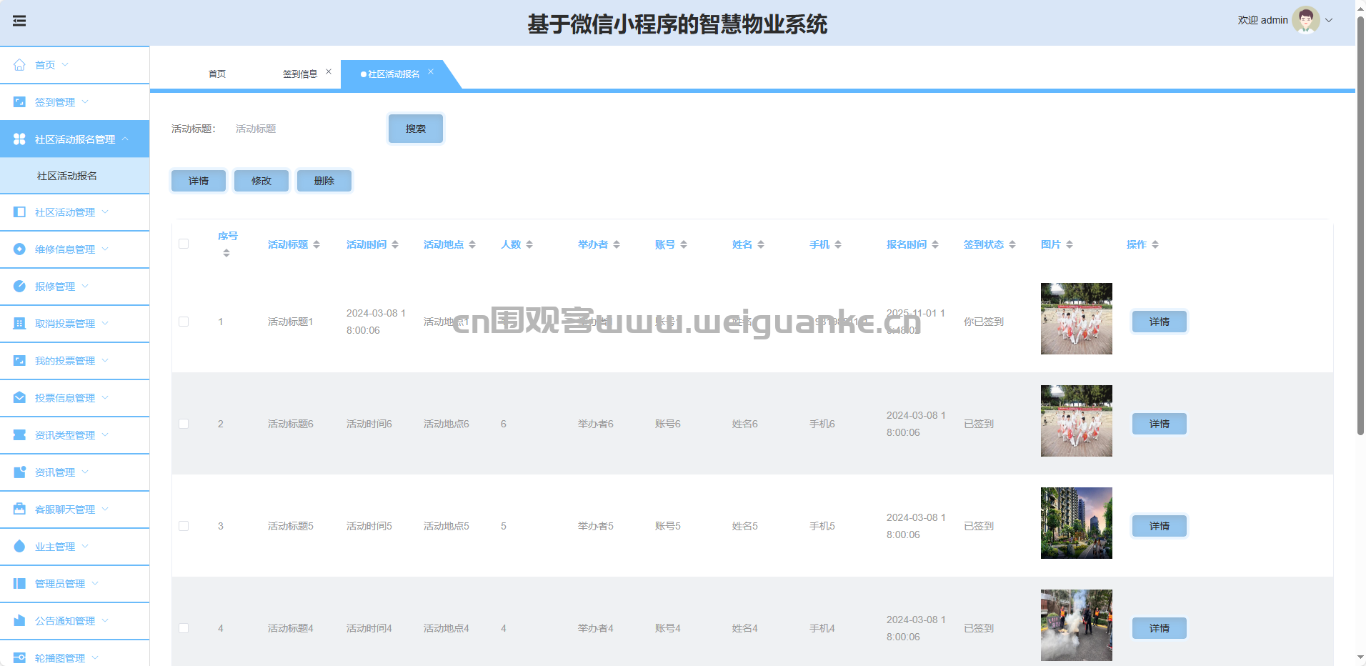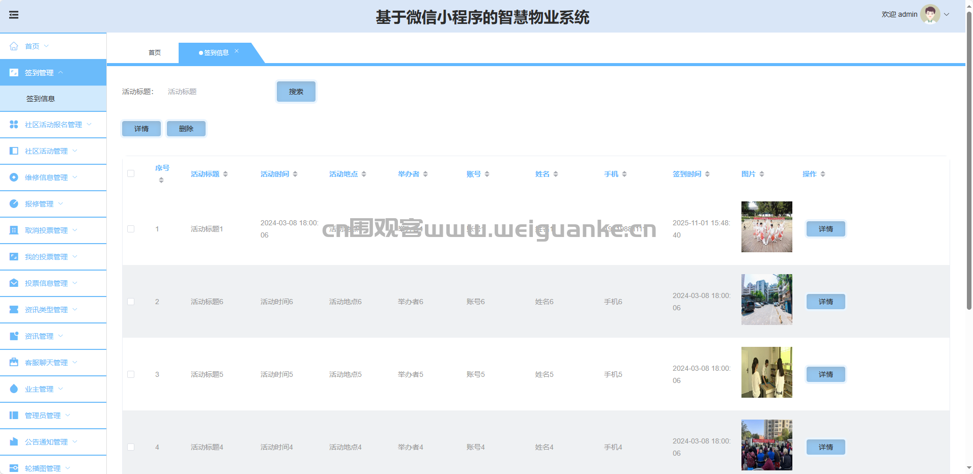 签到管理:查看、导出、删除业主签到记录。