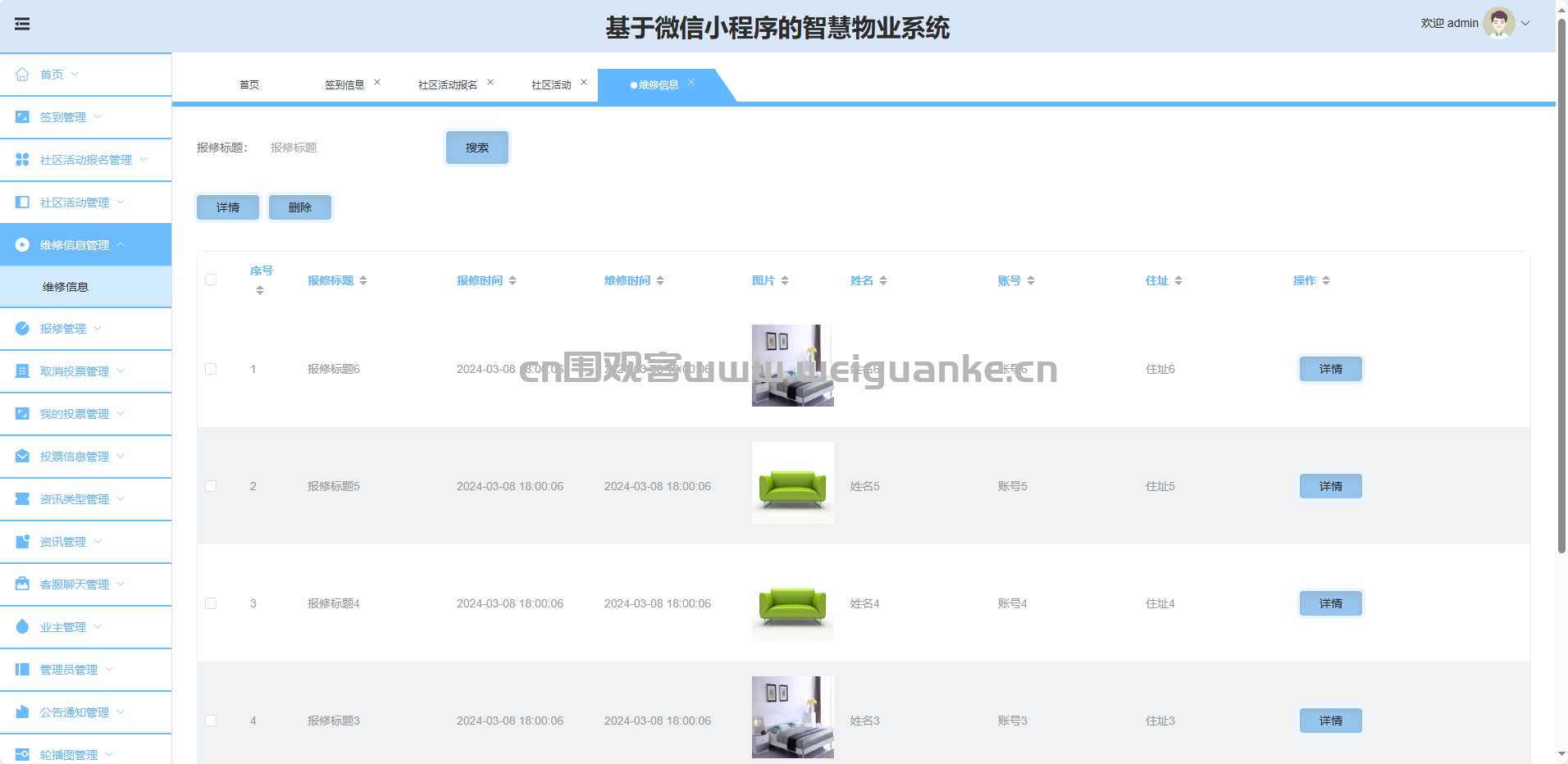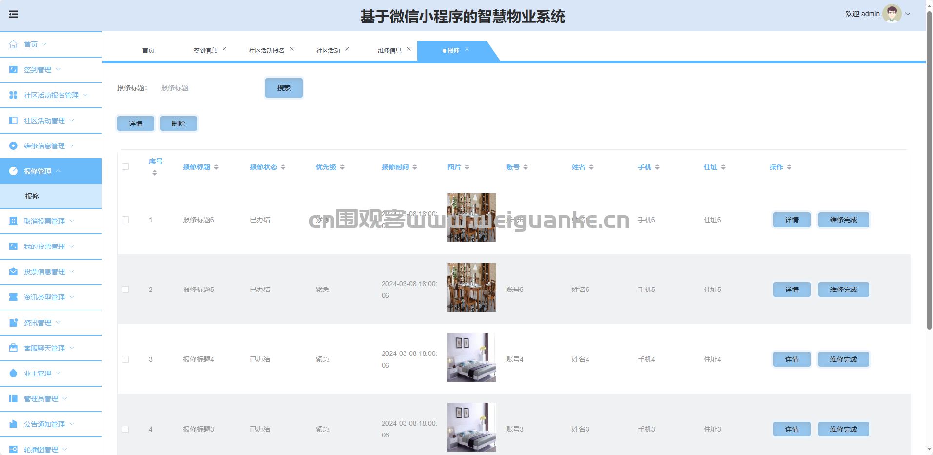 报修管理:派单、更新进度、关闭、删除报修单。
